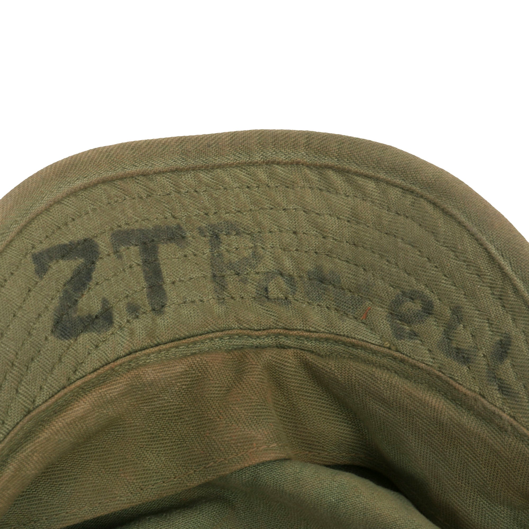 • One roughly size 7 (56cm) U.S. WWII P44 HBT Fatigue Cap. No EGA on the front. Offered in good condition. Named under brim to Z.T. POWELL.