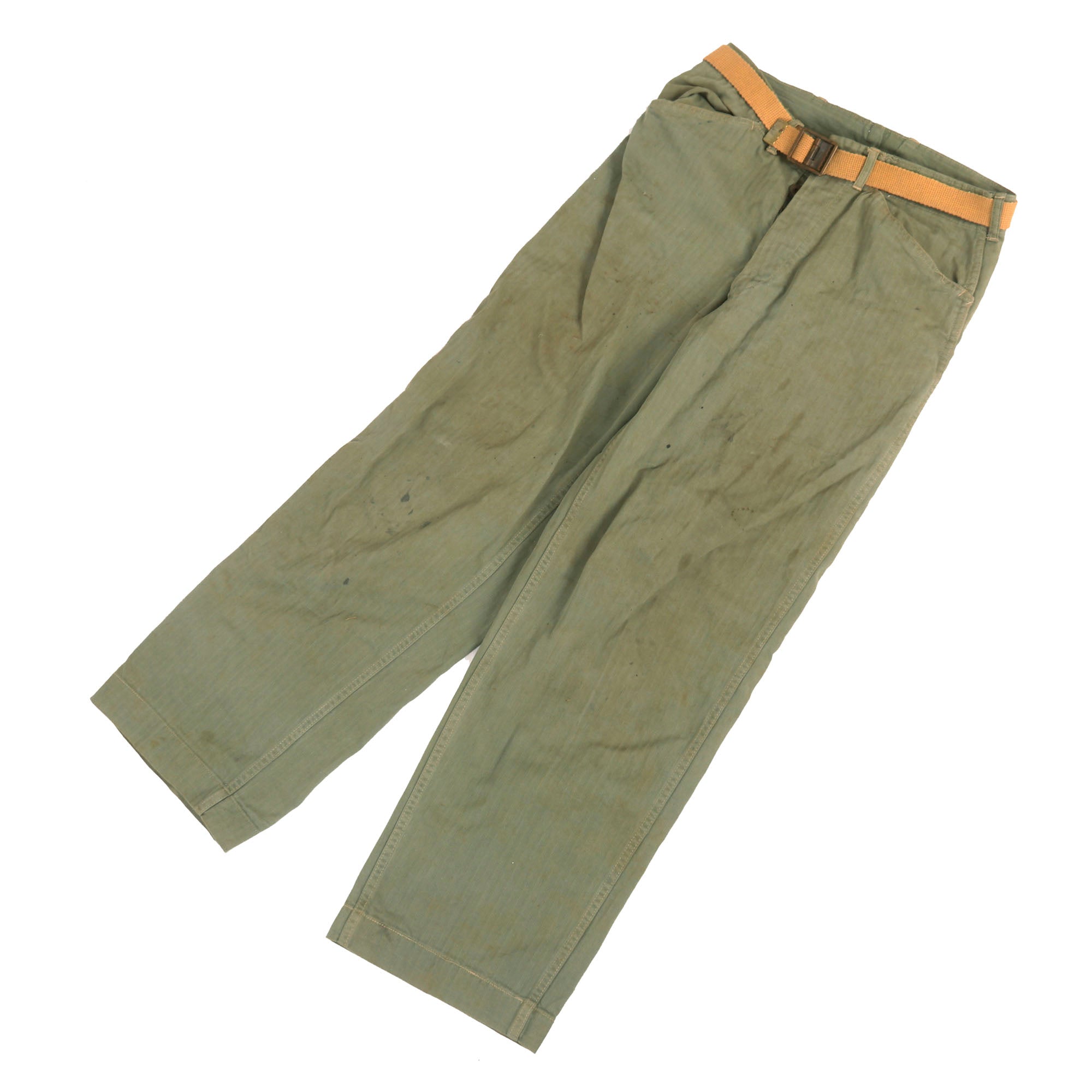 • One size 36” WW2 USMC US Marine Corps P41 USMC Combat Uniform Field Utility pants in Olive Drab. These loose fitting sage green herringbone twill (HBT) cotton pants feature, original buttons, hip pockets, two open rear pockets. Also includes the belt. No markings that we can find.