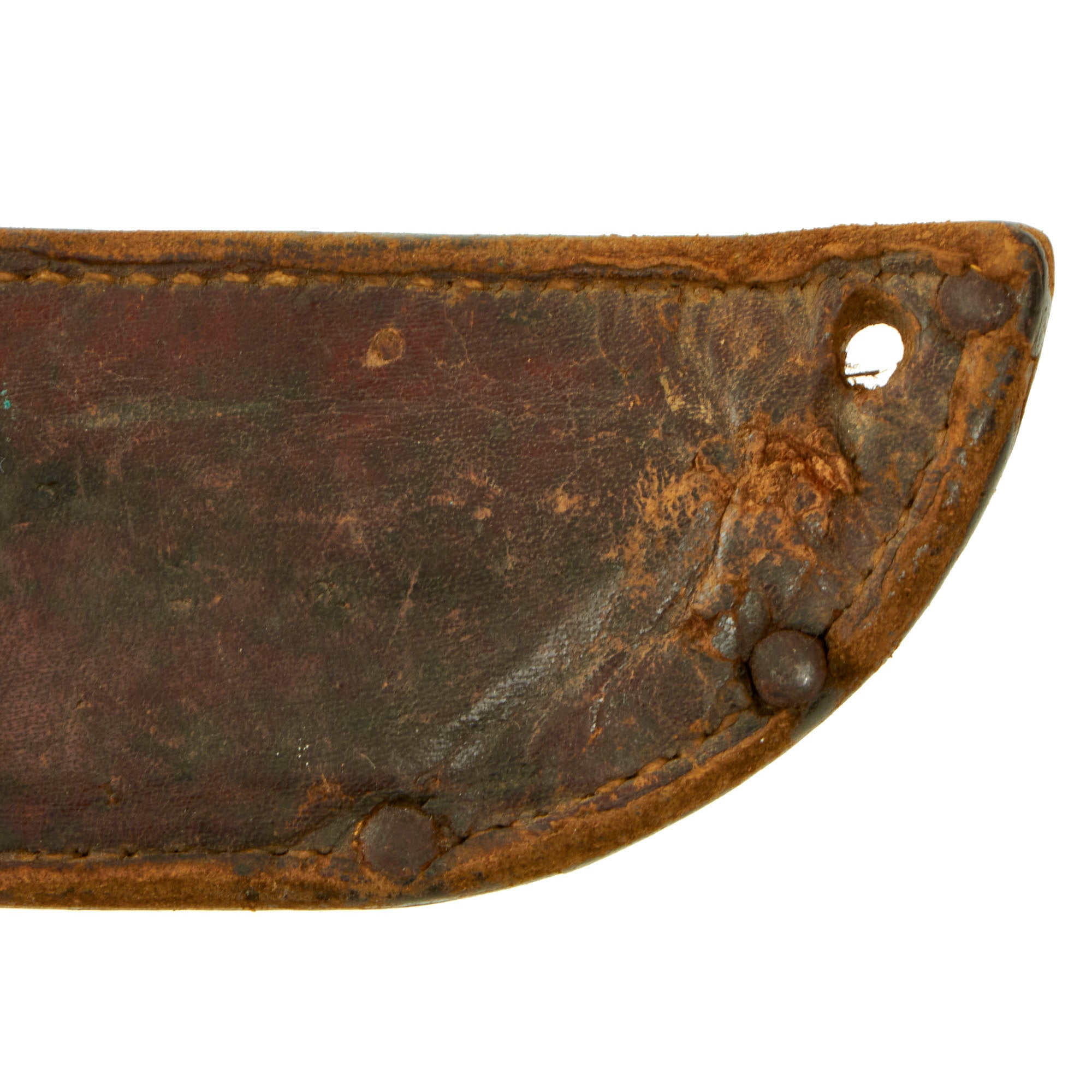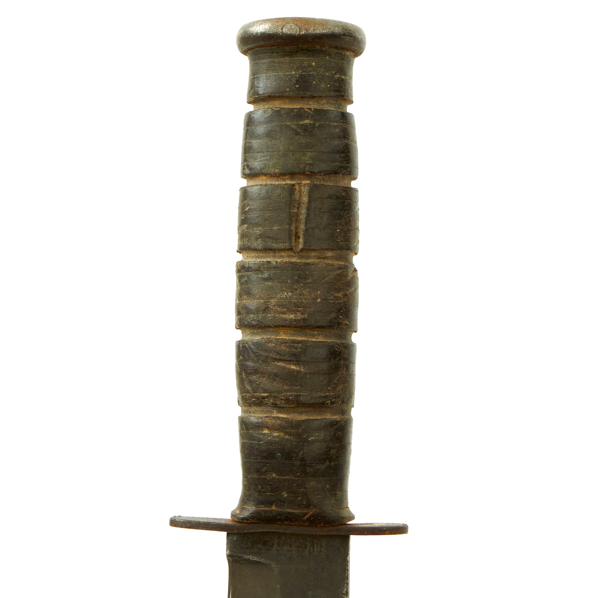 This is an excellent field used example of the legendary WWII Production USMC Mark 2 "Ka-Bar" fighting knife by Union Cutlery, with a Leather Scabbard. Overall length of this Mk2 is 12 inches, with a 7 inch clip-point blade. The markings on the blade are as follows: