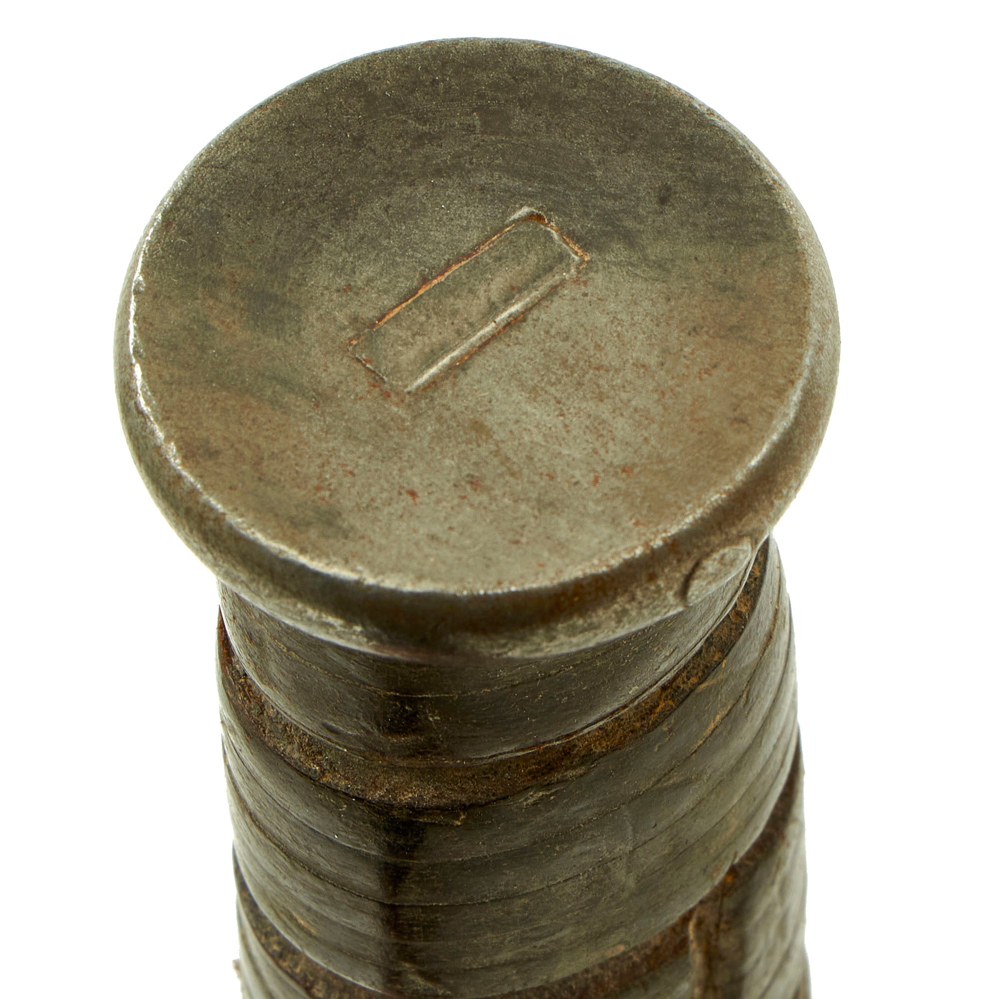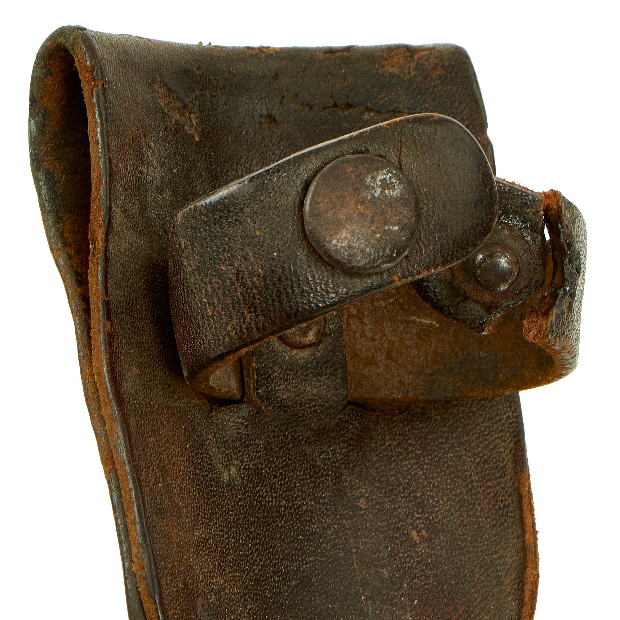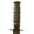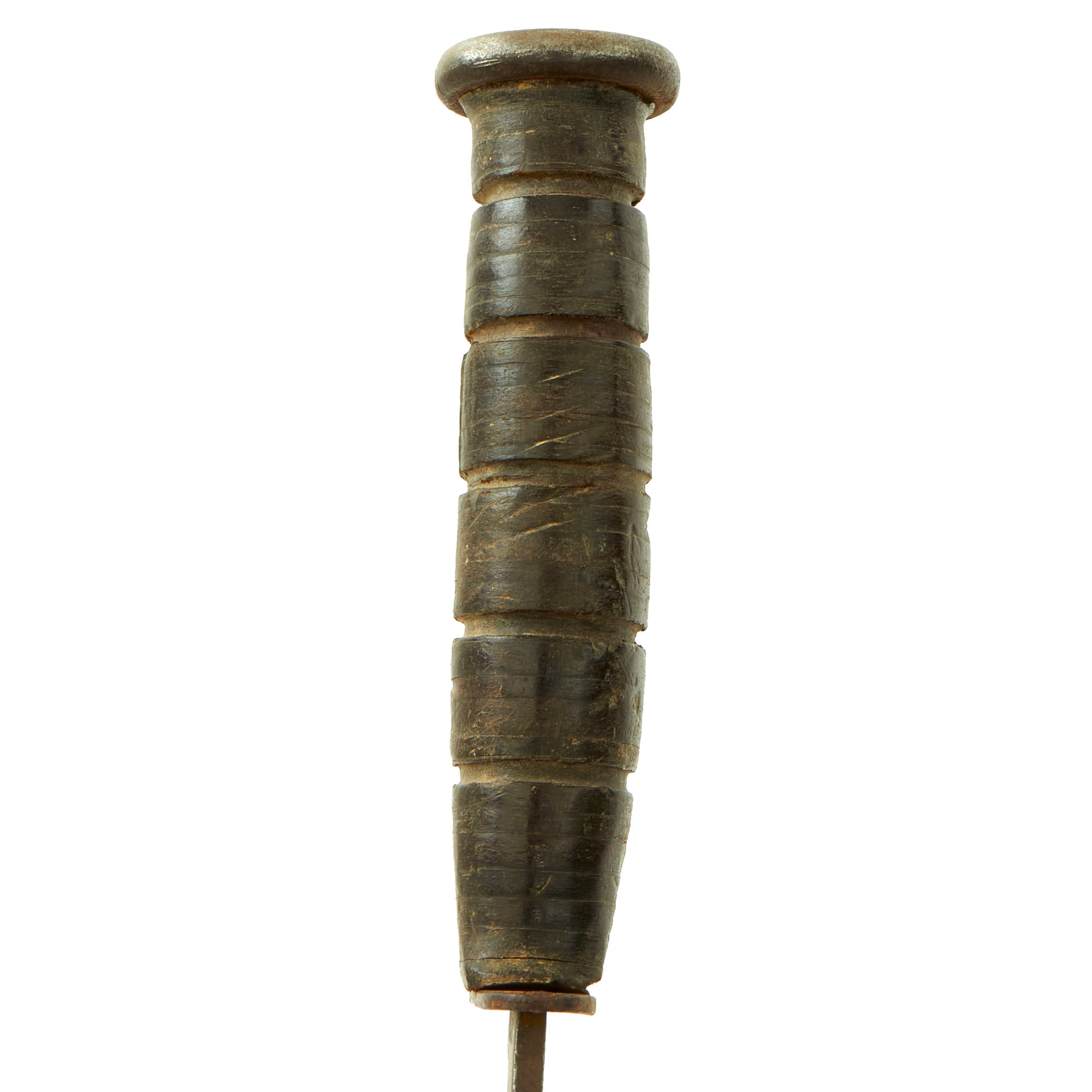 In 1944, a change order was implemented to have the markings moved from the blade to the cross guard, so this knife was produced before that change. It also has the later war slightly swept back cross guard, though it does appear to have been straightened out. It features original leather washer grip, which is in good shape with no cracks or splitting. It definitely does show wear however, with a dark color, and some damage which appears to be notches that we cut. The cross guard and pommel are slightly loose, as the leather has shrunk.