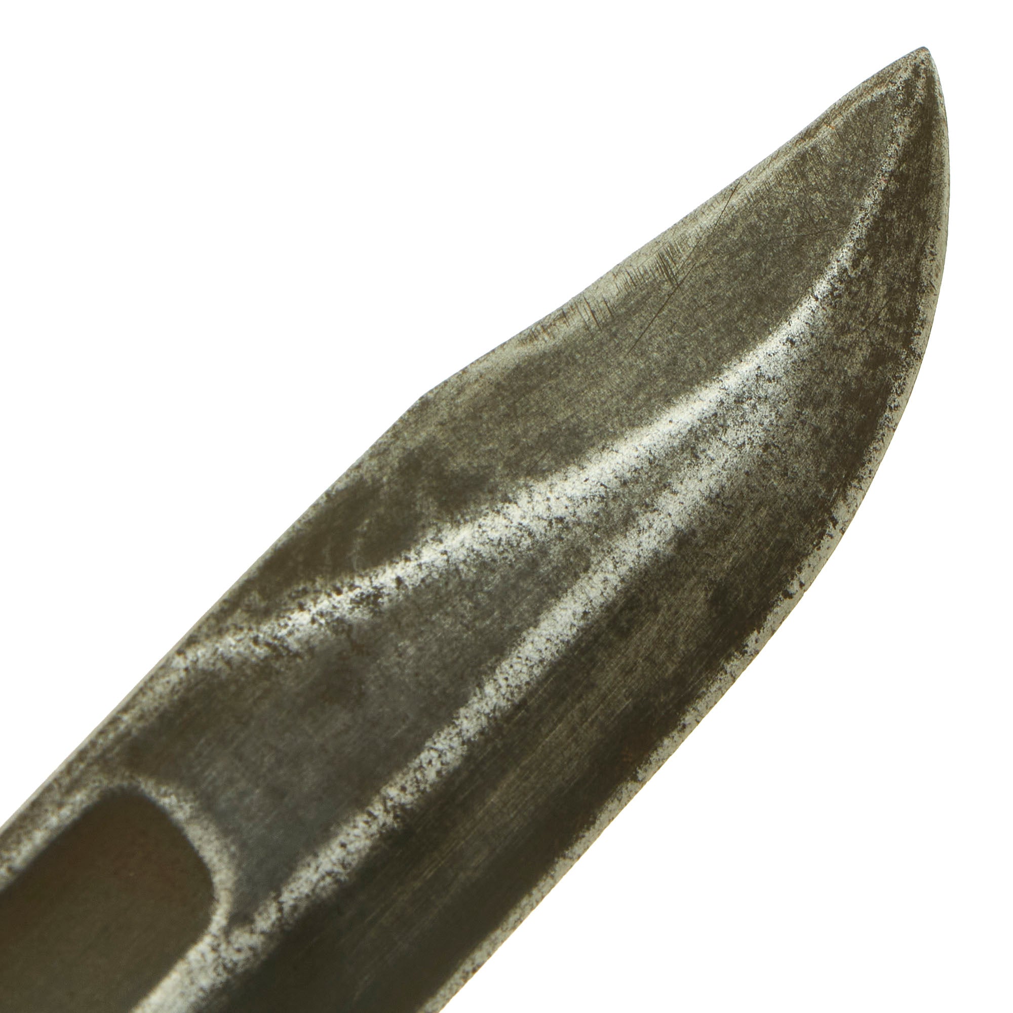 About 30% of the original blade finish is still present, with the usual wear from the scabbard and use. It has been sharpened multiple times, and the false clip point edge was sharpened as well. It has a heavy steel pommel with cross pinned tang. The blade is in very good condition, and is still sharp, with a few small edge dents from use.