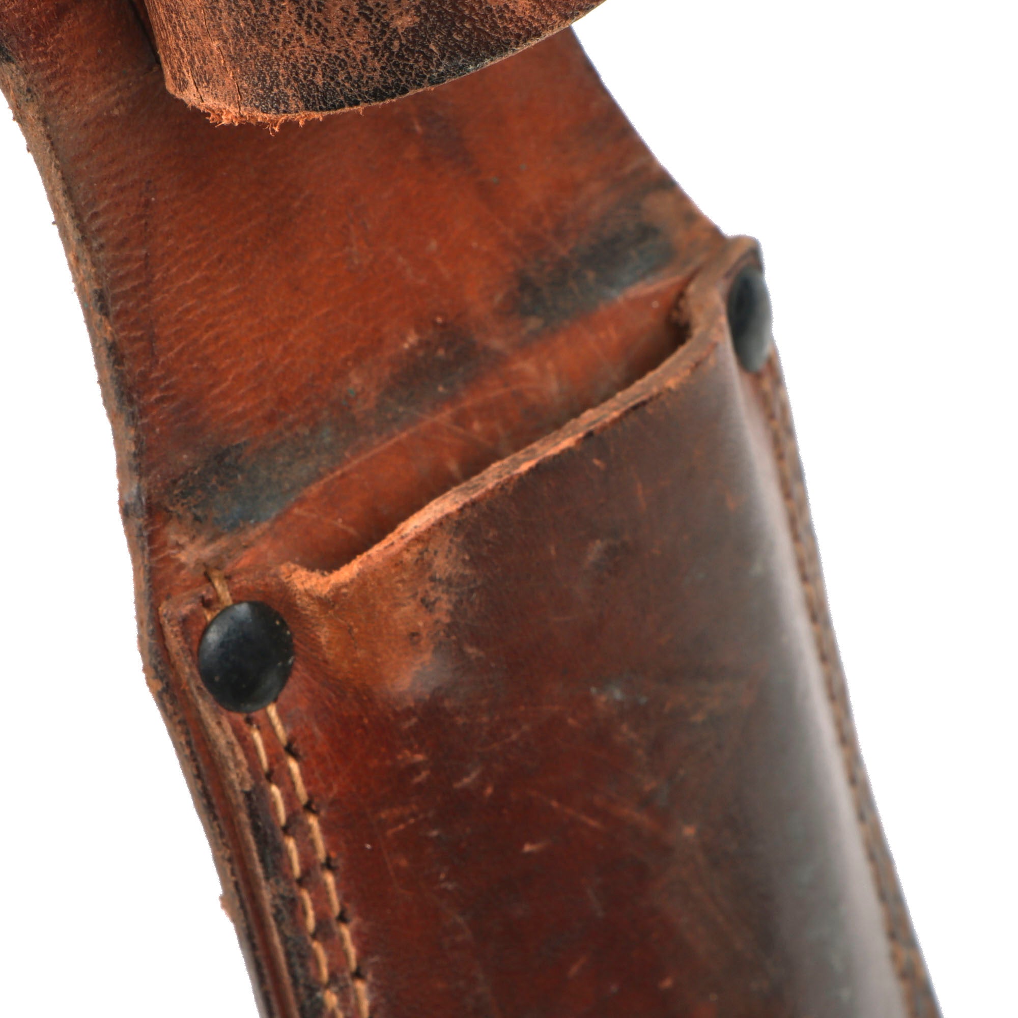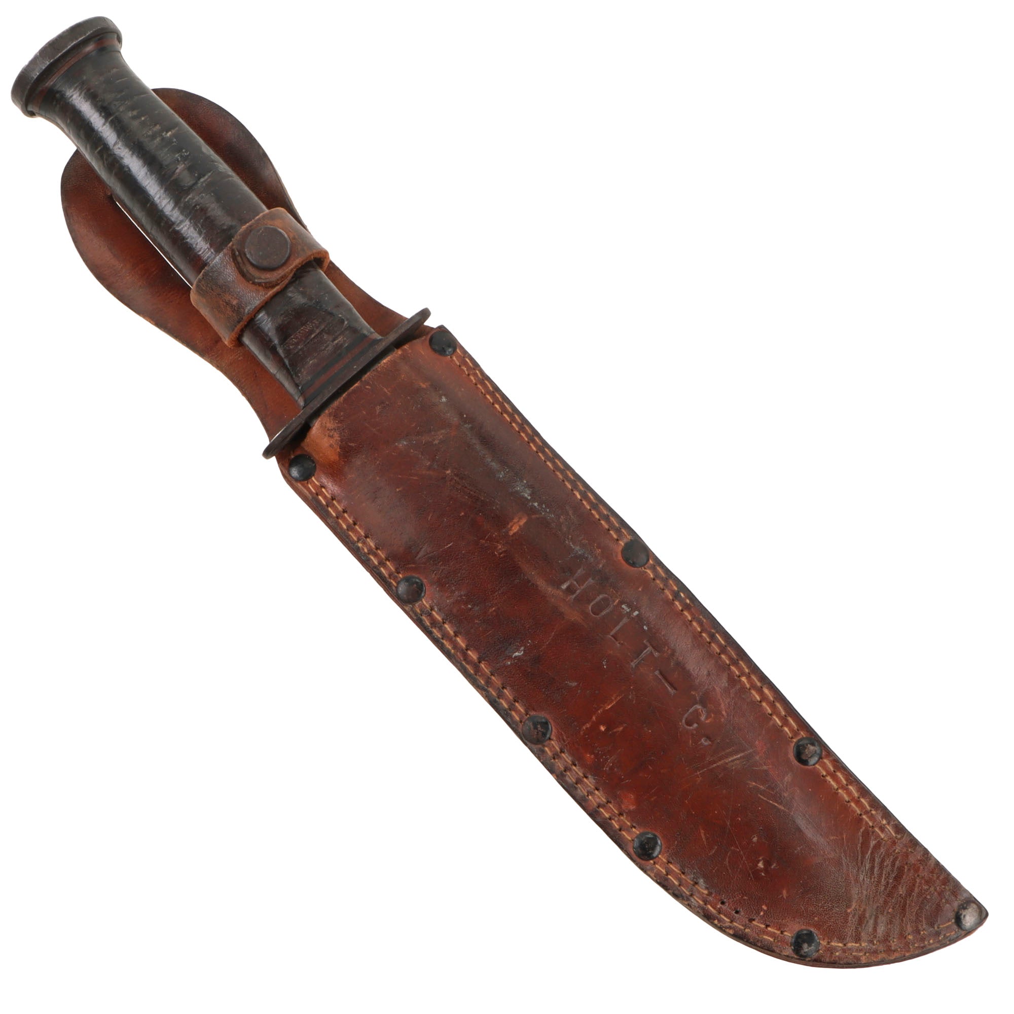 The original leather scabbard has a lovely aged color, showing some oxidation and staining around the rivets due to moisture exposure while in service. It still has the original securing strap, though it shows some wear around the snap, but still solid. The front side of the scabbard is stamped with the same HOLT-C. As on the knife grip, and the back of the scabbard is stamped 614 38 24, which with the name identified this knife to Storekeeper 2nd Class Charles Holt of the U.S. Navy, who served aboard LST 524 around December 1944. A good research project!