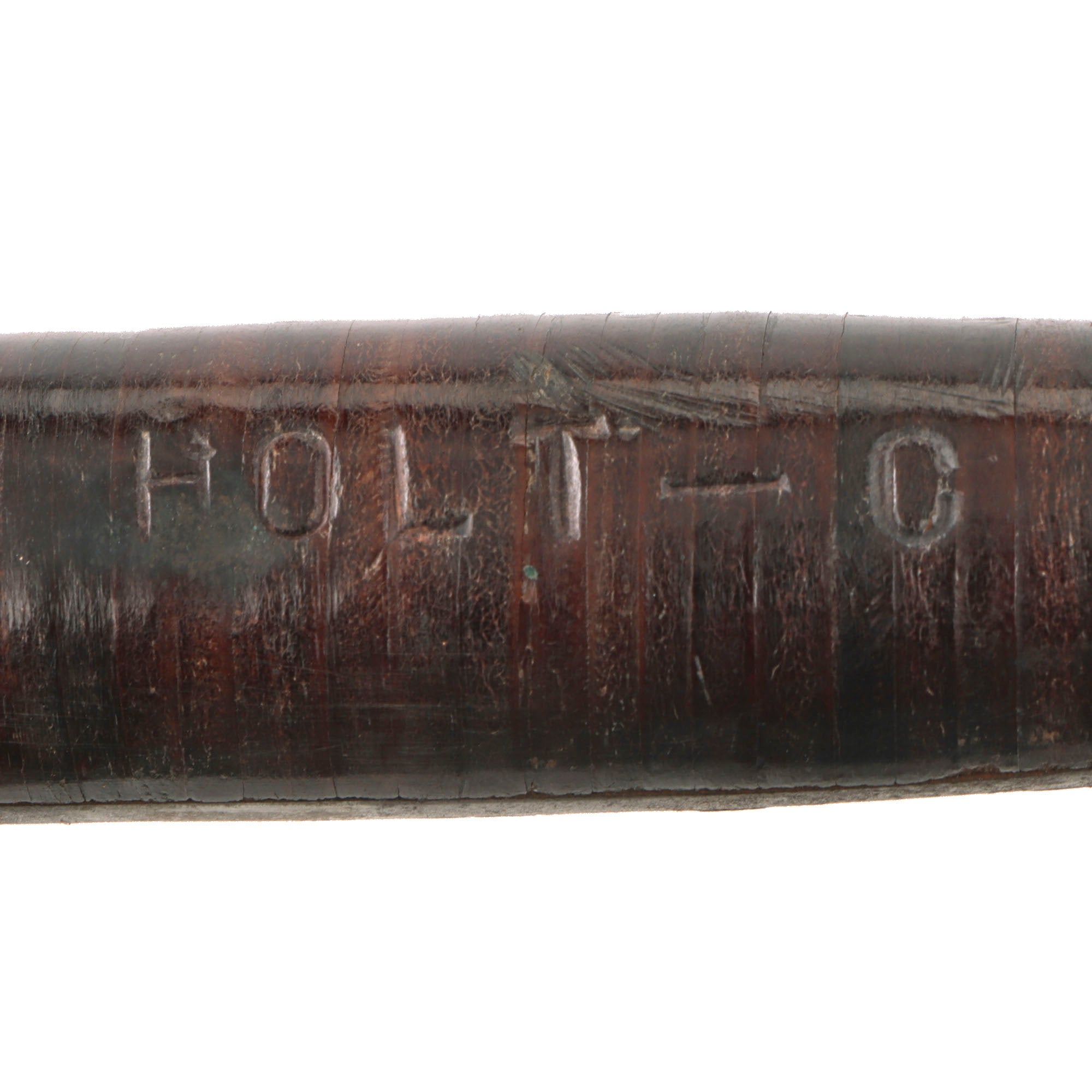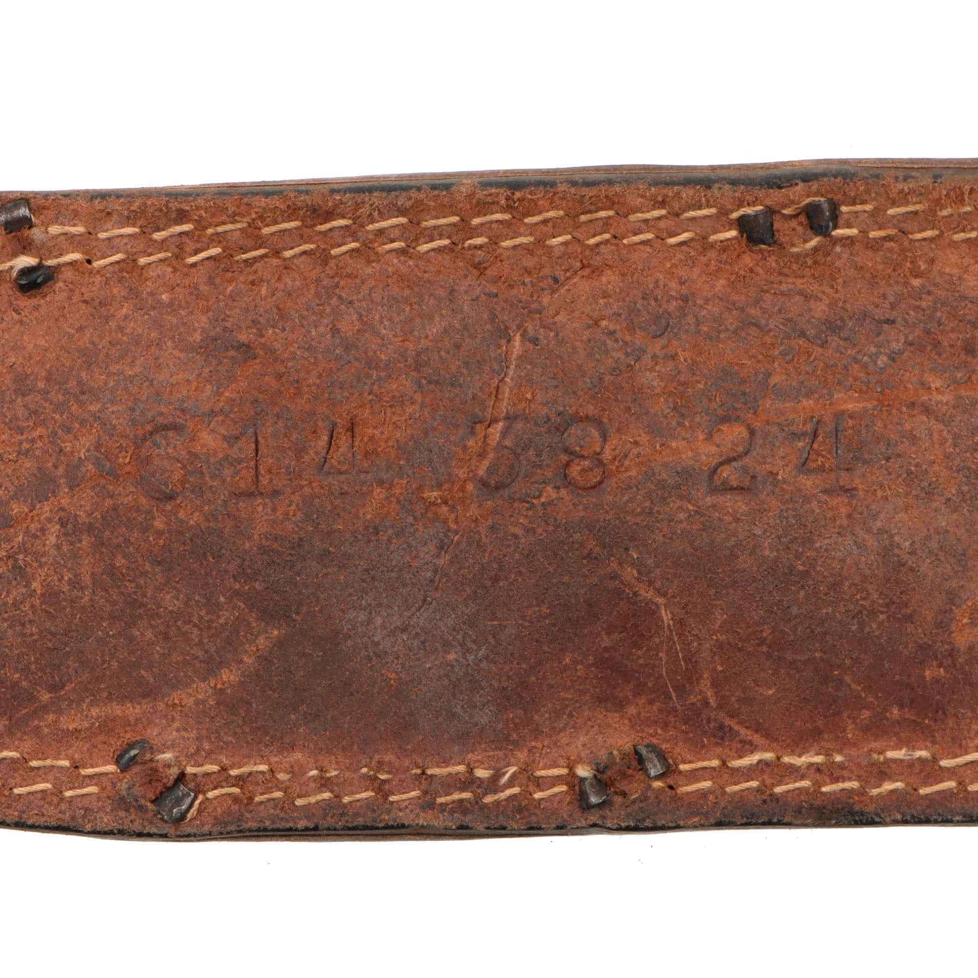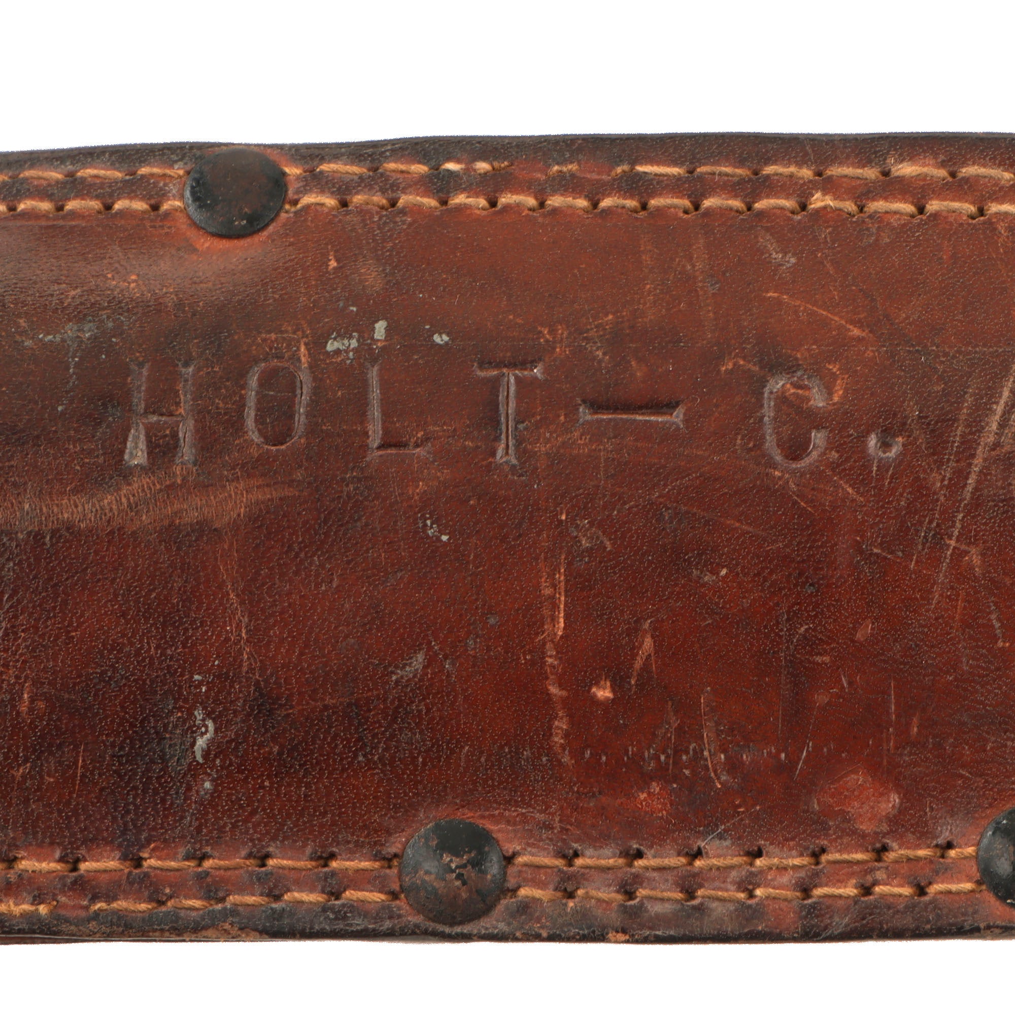 This example has an 8 inch long single-edged clip-point blade, which has a broad fuller below the spine. The blade is 1 1/4 inches wide, and is of very sturdy construction. The oval ended cross guard is in good condition, but is a little loose due to leather shrinkage. The stacked leather grip is stained, but still solid and in very good condition, with no looseness we can feel, and the black / red / black spacers at the end are in good shape as well. One side of the grip is stamped HOLT-C, likely the name of the soldier who carried it. The pommel cap is solid, and secured to the end of the tang in two places. The blade ricasso is marked:
