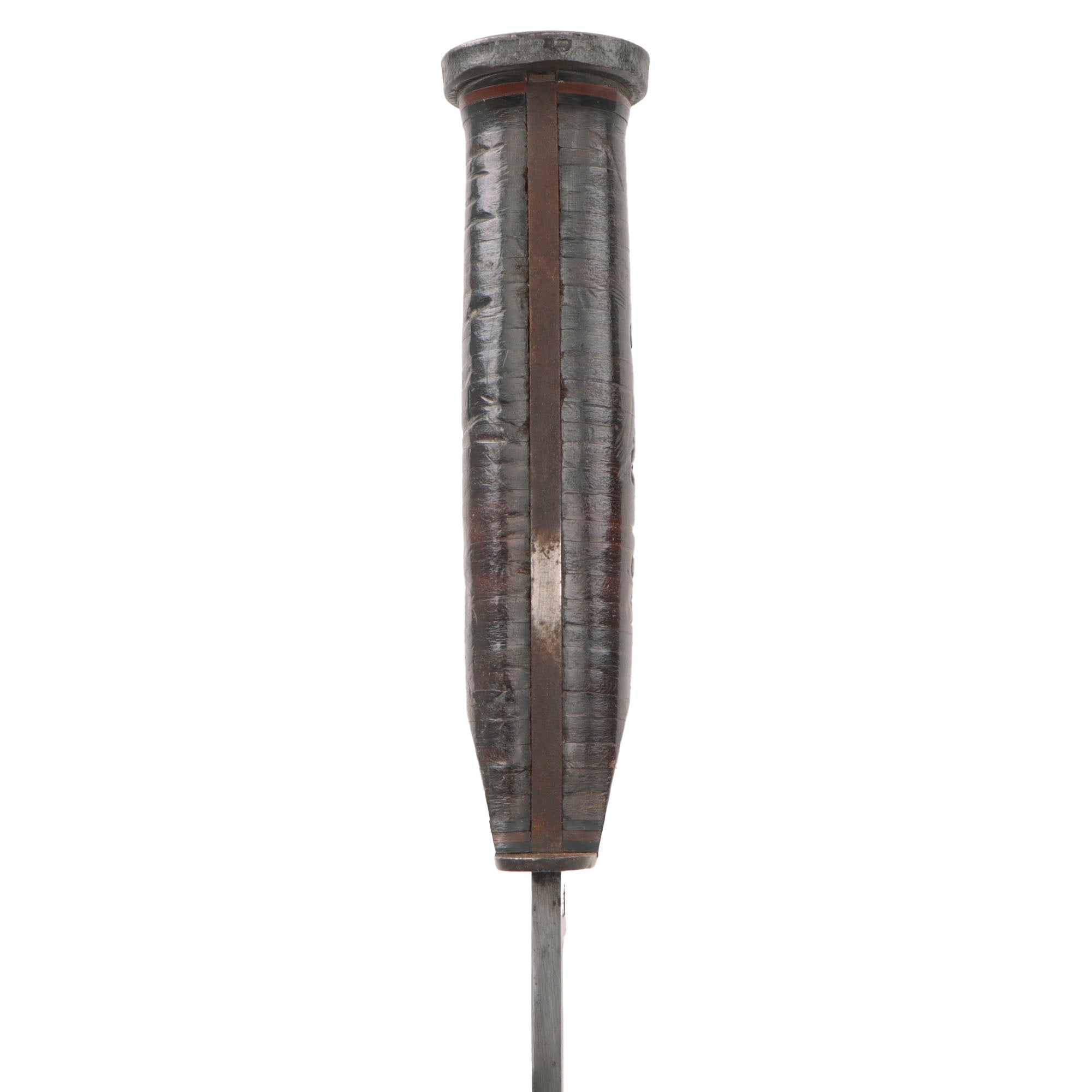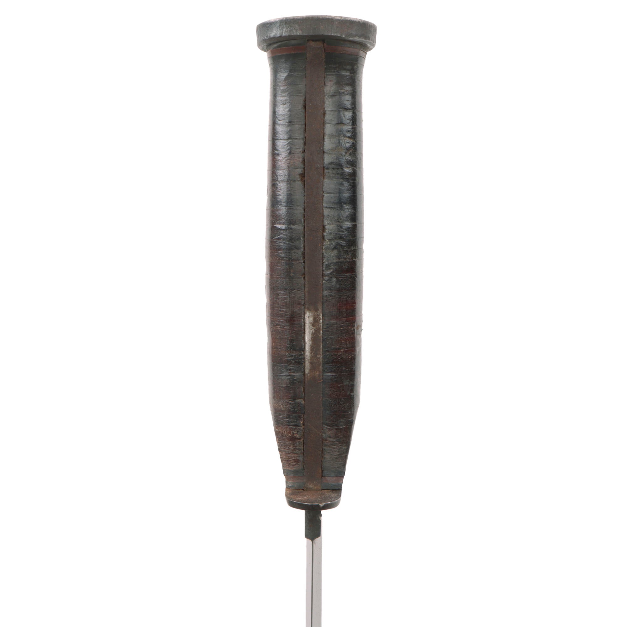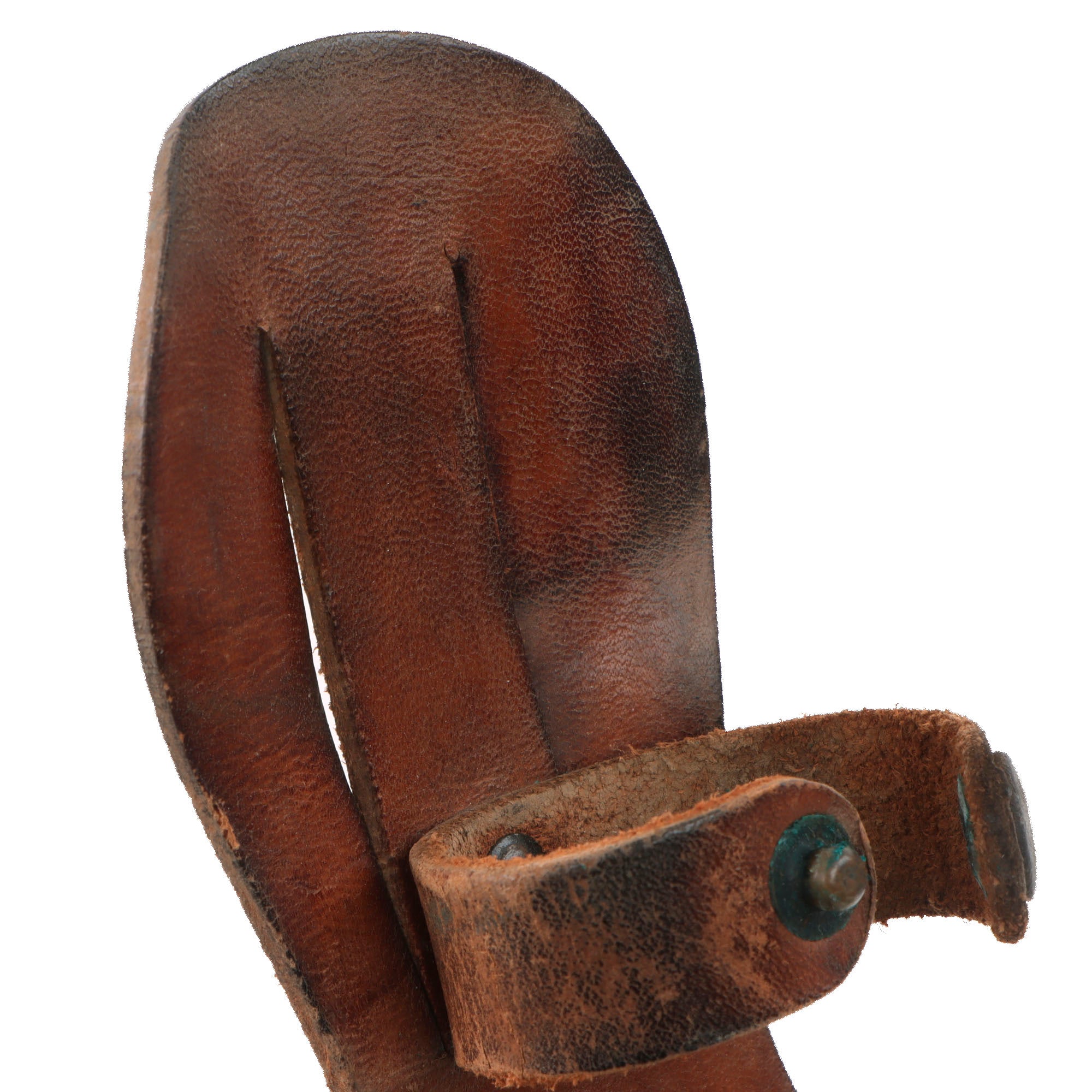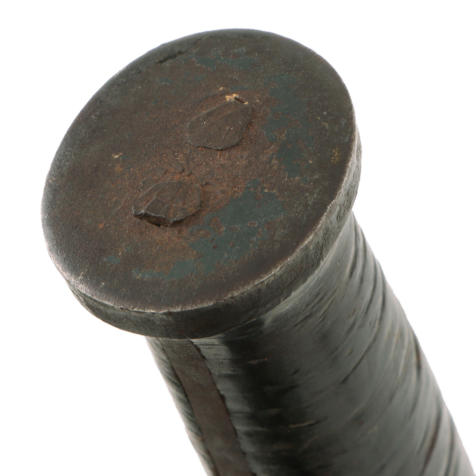 This example has an 8 inch long single-edged clip-point blade, which has a broad fuller below the spine. The blade is 1 1/4 inches wide, and is of very sturdy construction. The oval ended cross guard is in good condition, but is a little loose due to leather shrinkage. The stacked leather grip is stained, but still solid and in very good condition, with no looseness we can feel, and the black / red / black spacers at the end are in good shape as well. One side of the grip is stamped HOLT-C, likely the name of the soldier who carried it. The pommel cap is solid, and secured to the end of the tang in two places. The blade ricasso is marked: