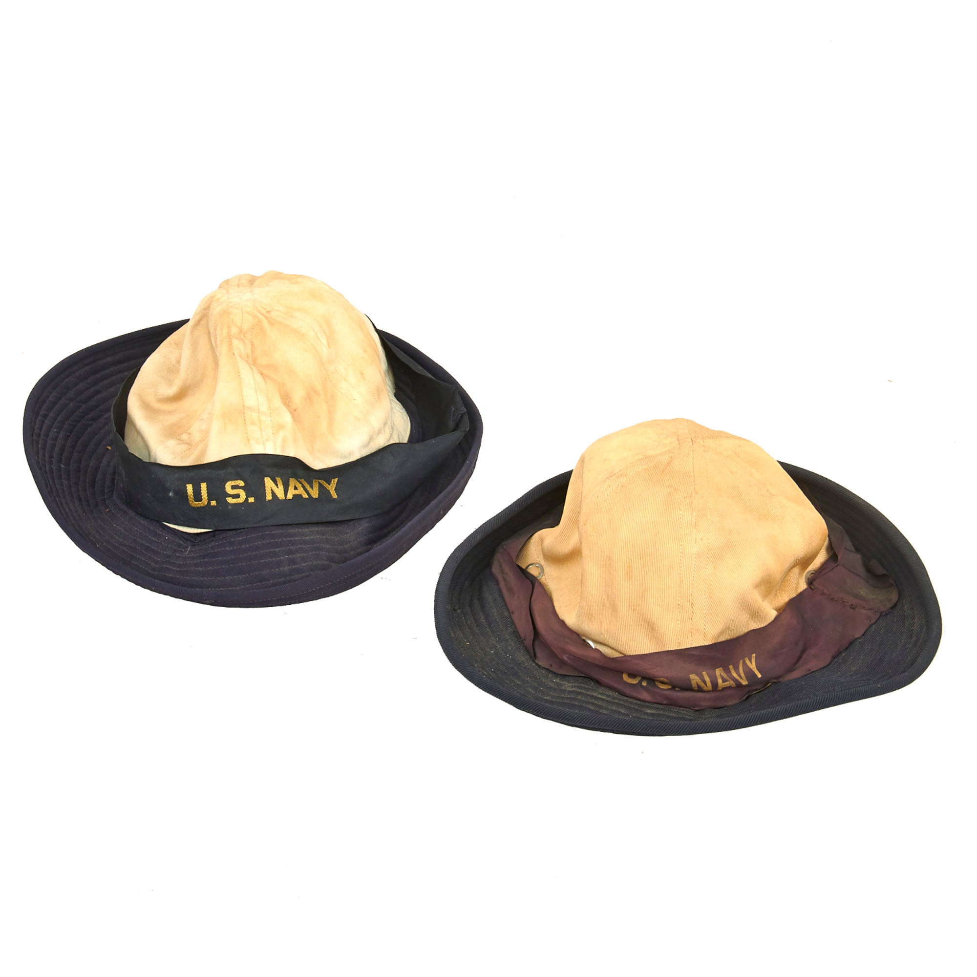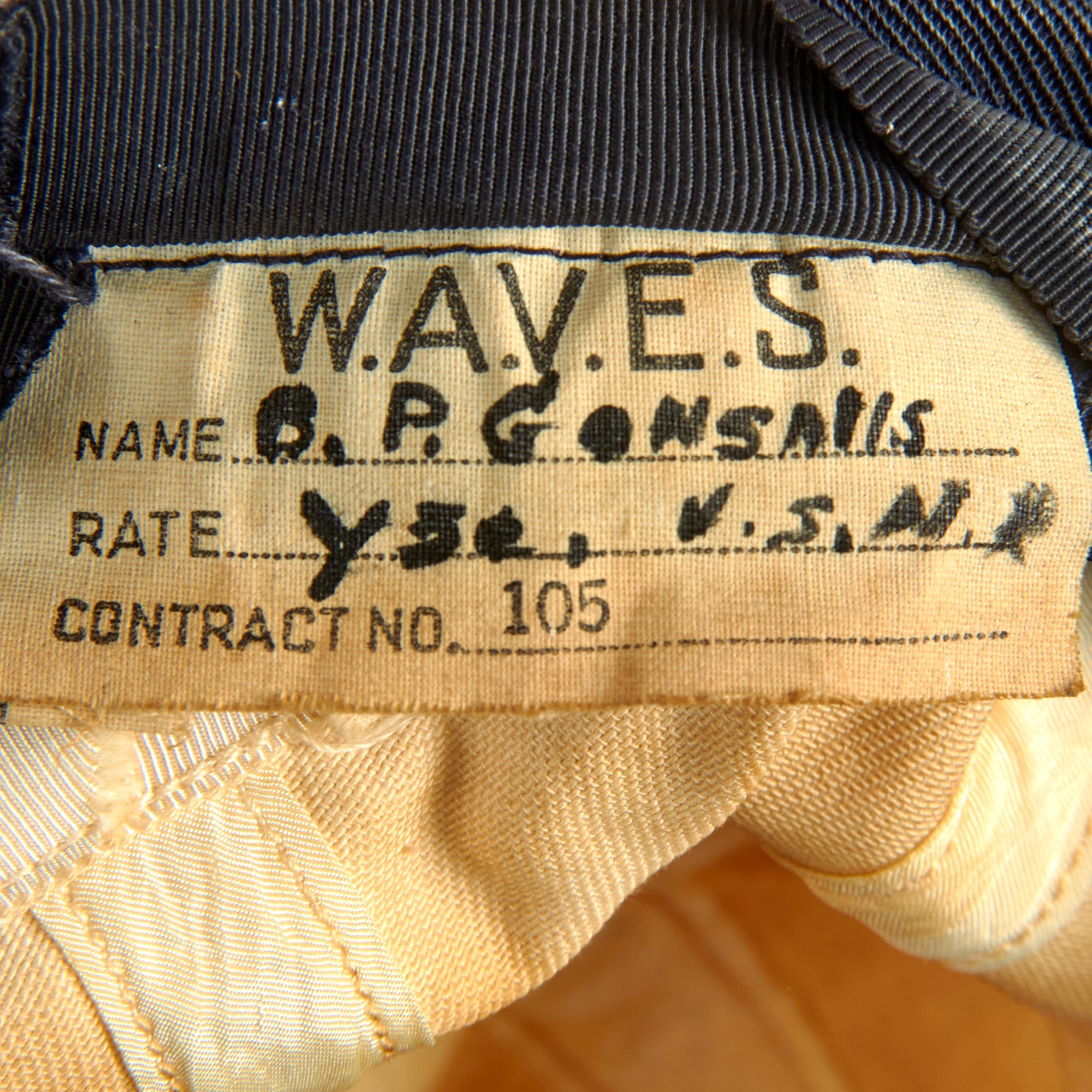 - Two WAVES Service caps, one named on the interior B.P. GONSALLS, for Bernadette Patricia Gonsalls. Caps are in rough condition with one missing one of the snaps.