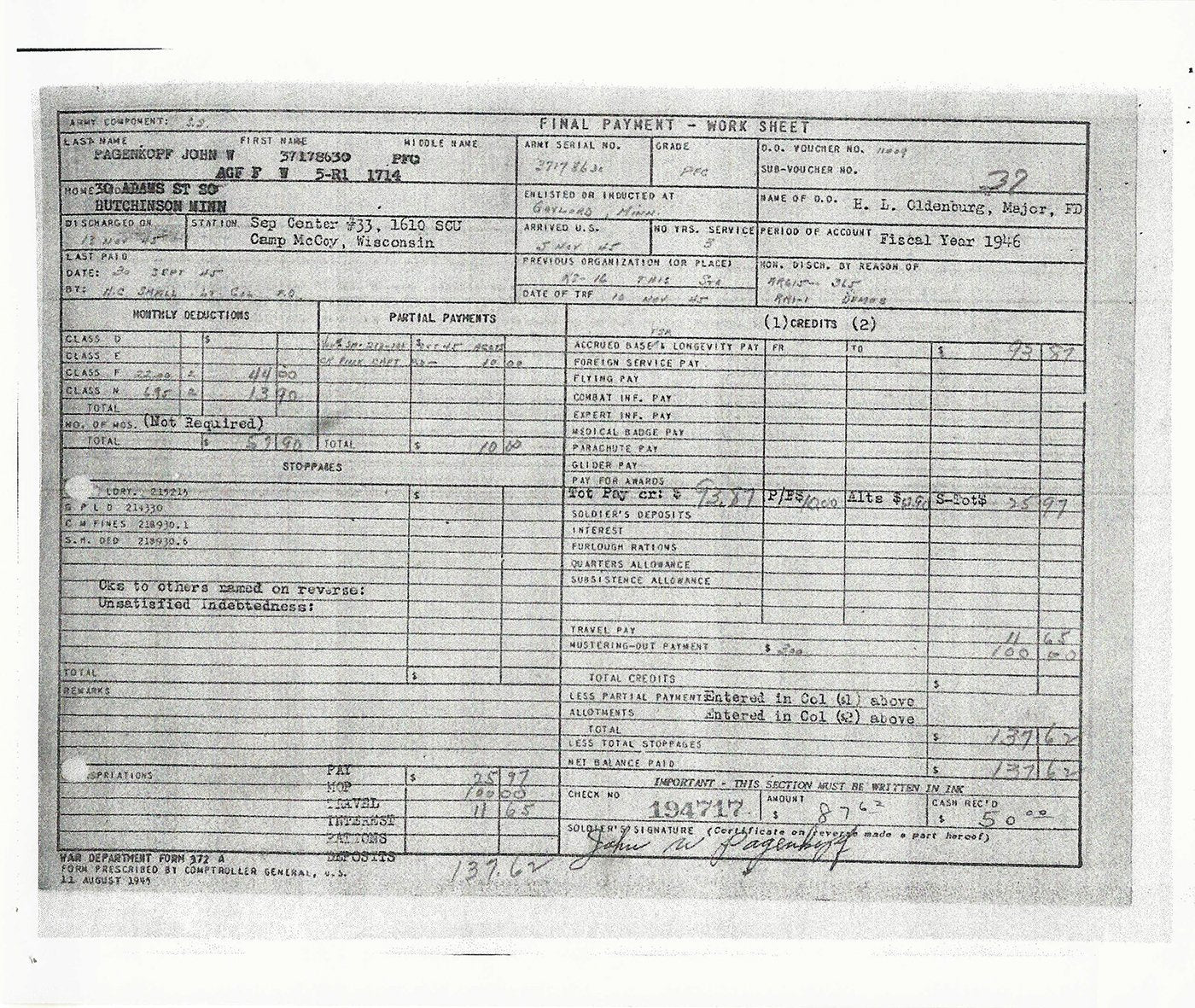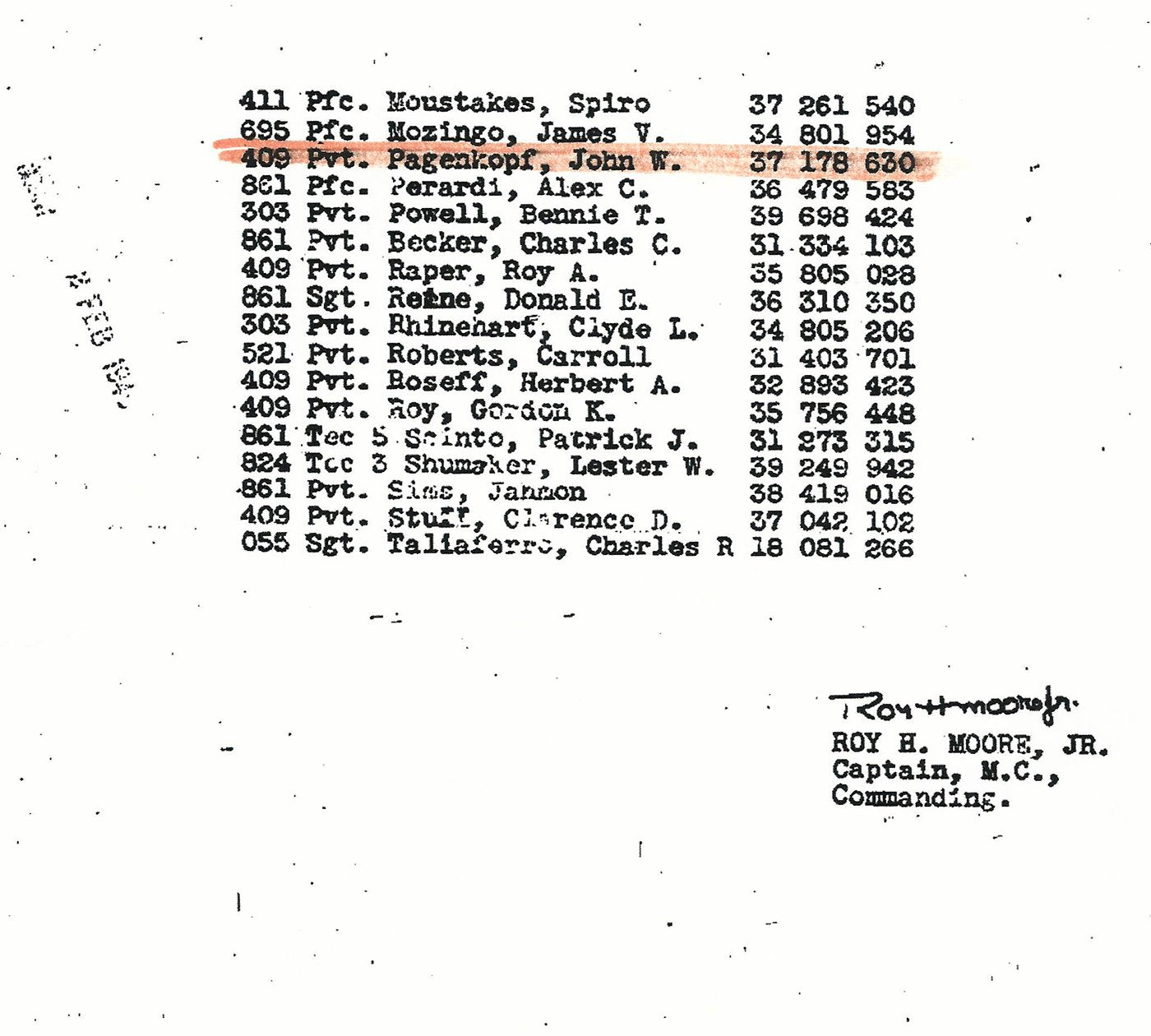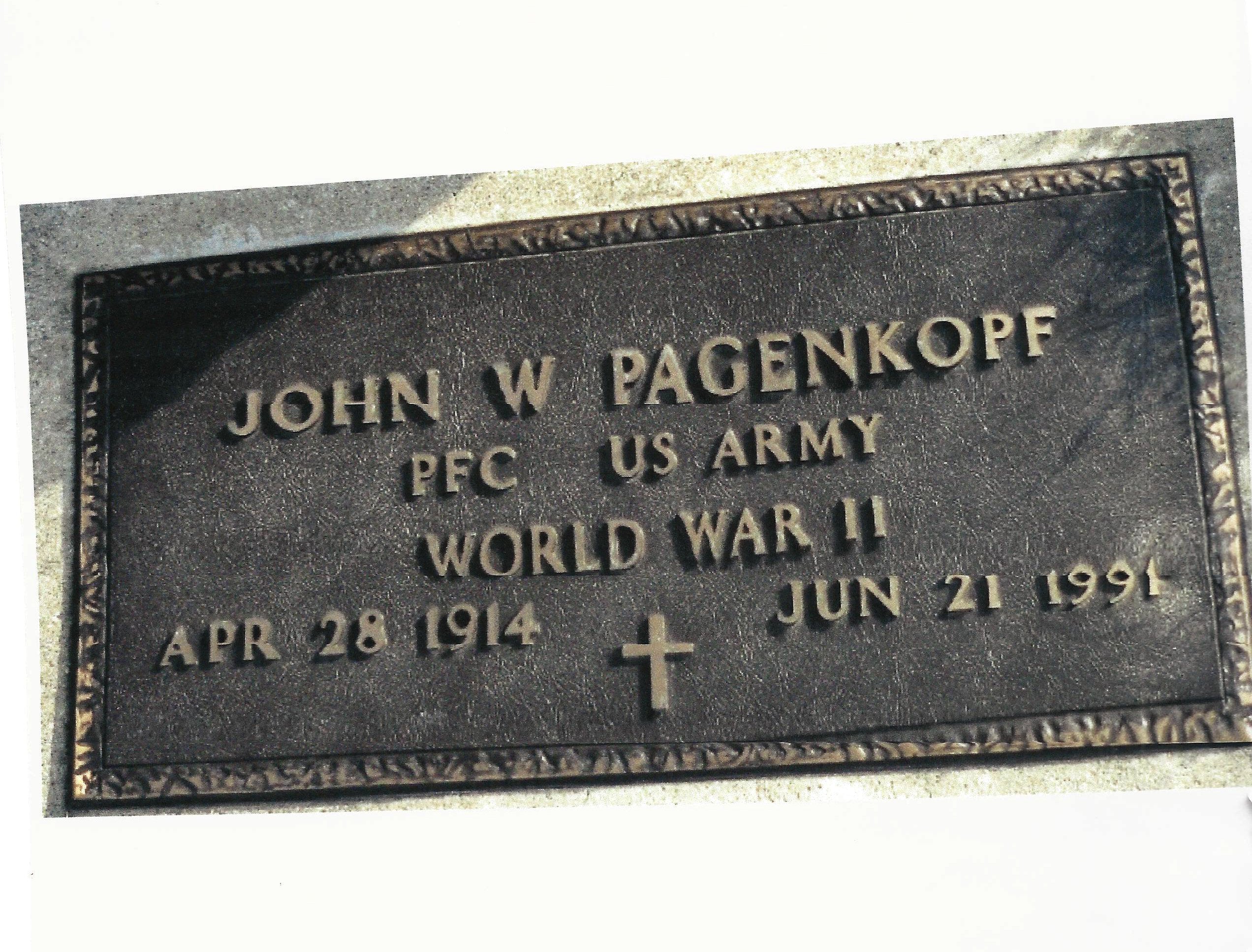 - Copies of numerous wartime documents including draft registration card, photo of his grave, February 1945 Headquarters 326th Medical Company roster listing Pvt. Pagenkopf, John W. 37 178 630, Morning reports of the 326th Medical Company from January 5th, 1945 and May 18th, 1945 both which name Pagenkopf, pay record and more.
