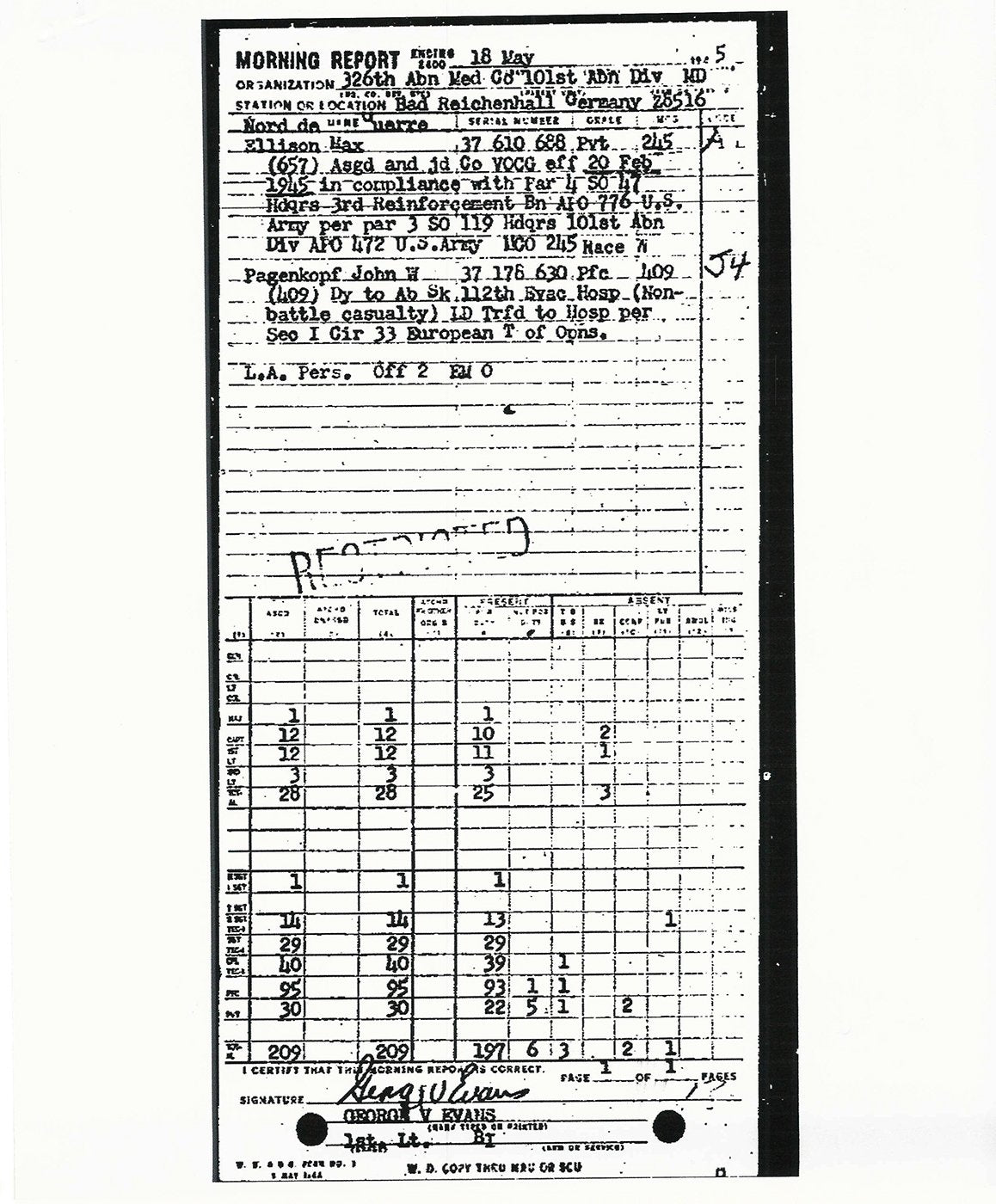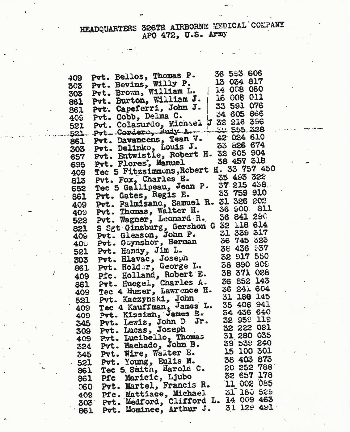 On 31 January 1945, the (daily) Company Morning Report, of the 326th Airborne Medical Company, 101st Airborne Division, duly signed by Captain Roy H. Moore, Jr., Commanding, reported from its station at Camp Mourmelon, France, APO # 472, that 60 Enlisted Men were assigned and joined from Headquarters, 2d Replacement Depot, effective 28 January 1945.