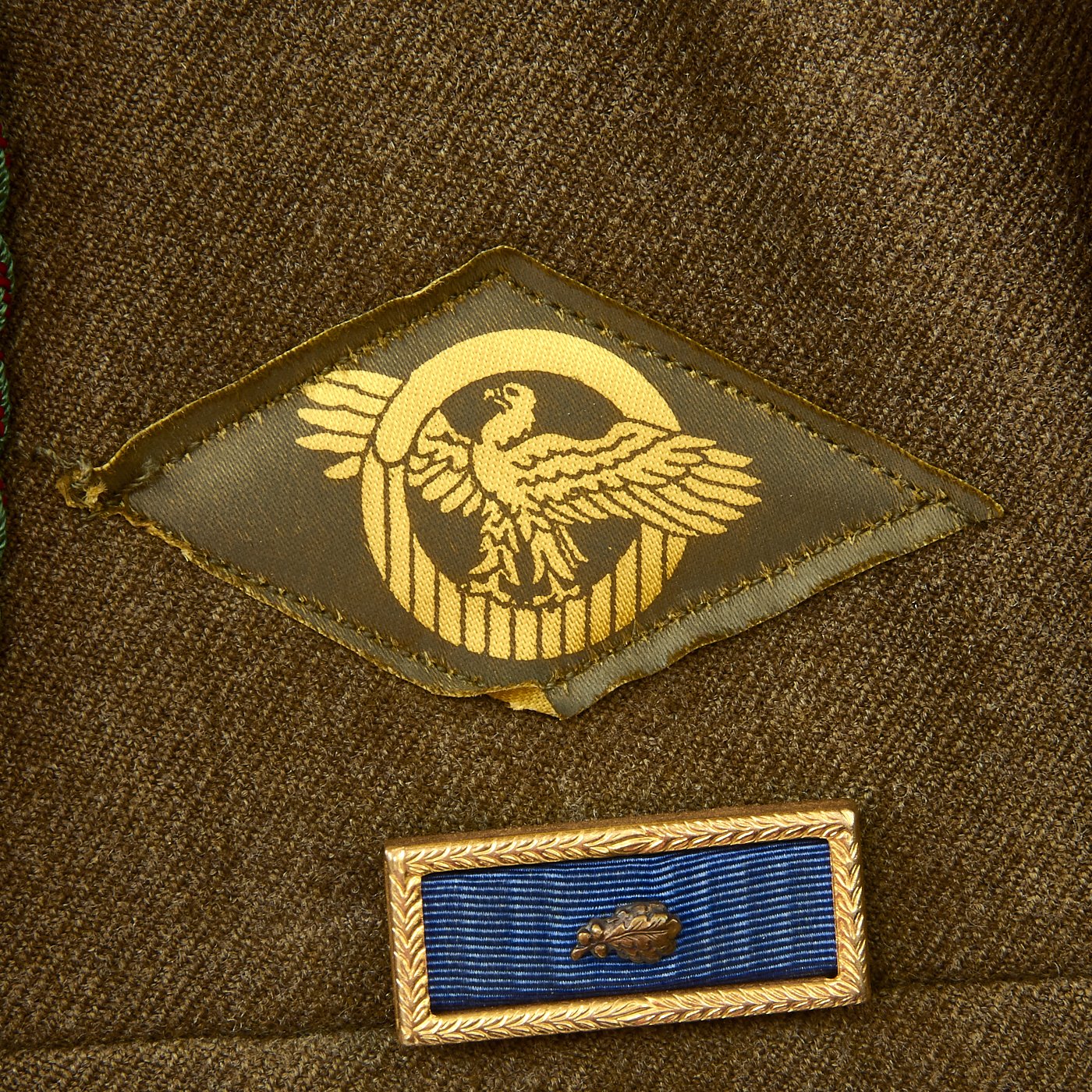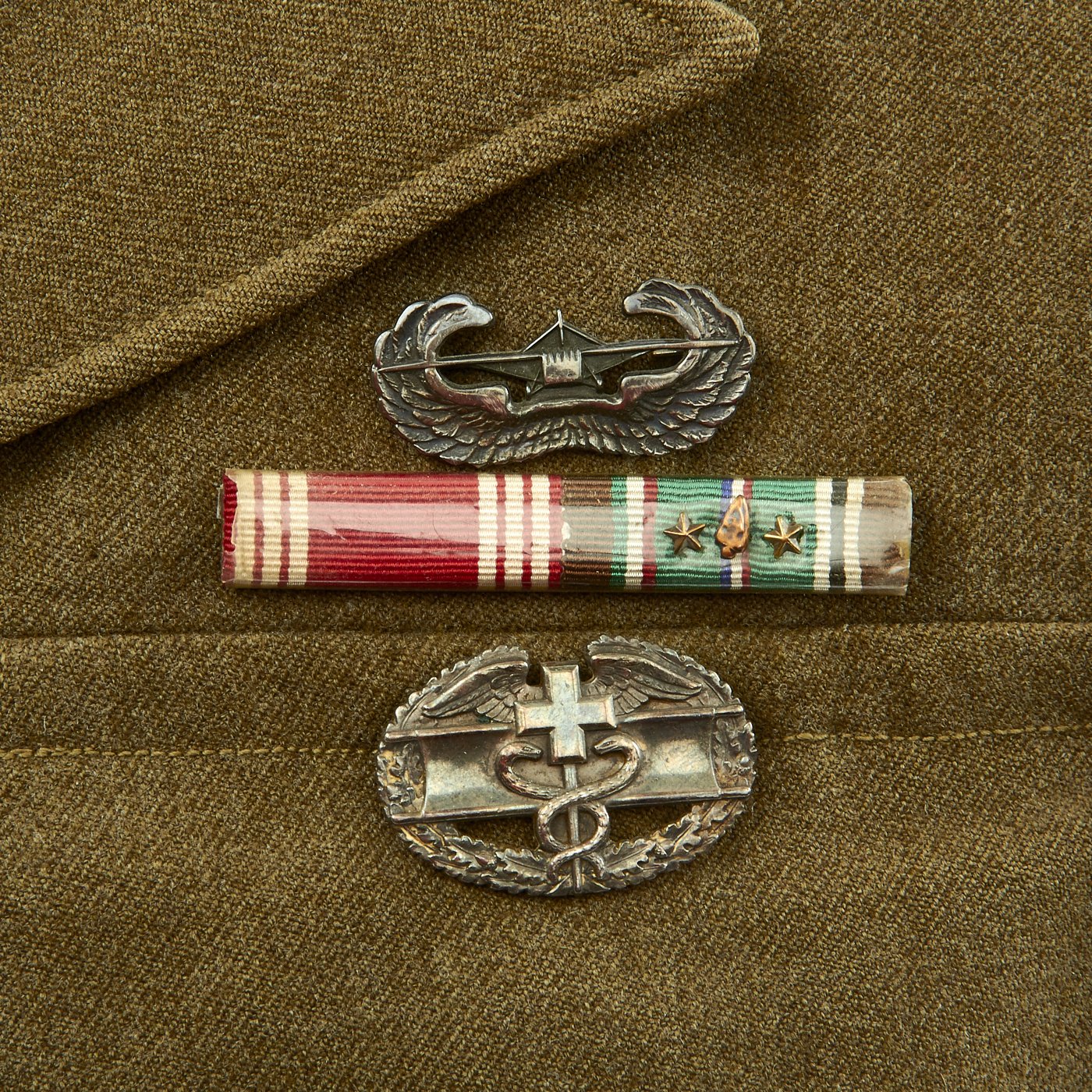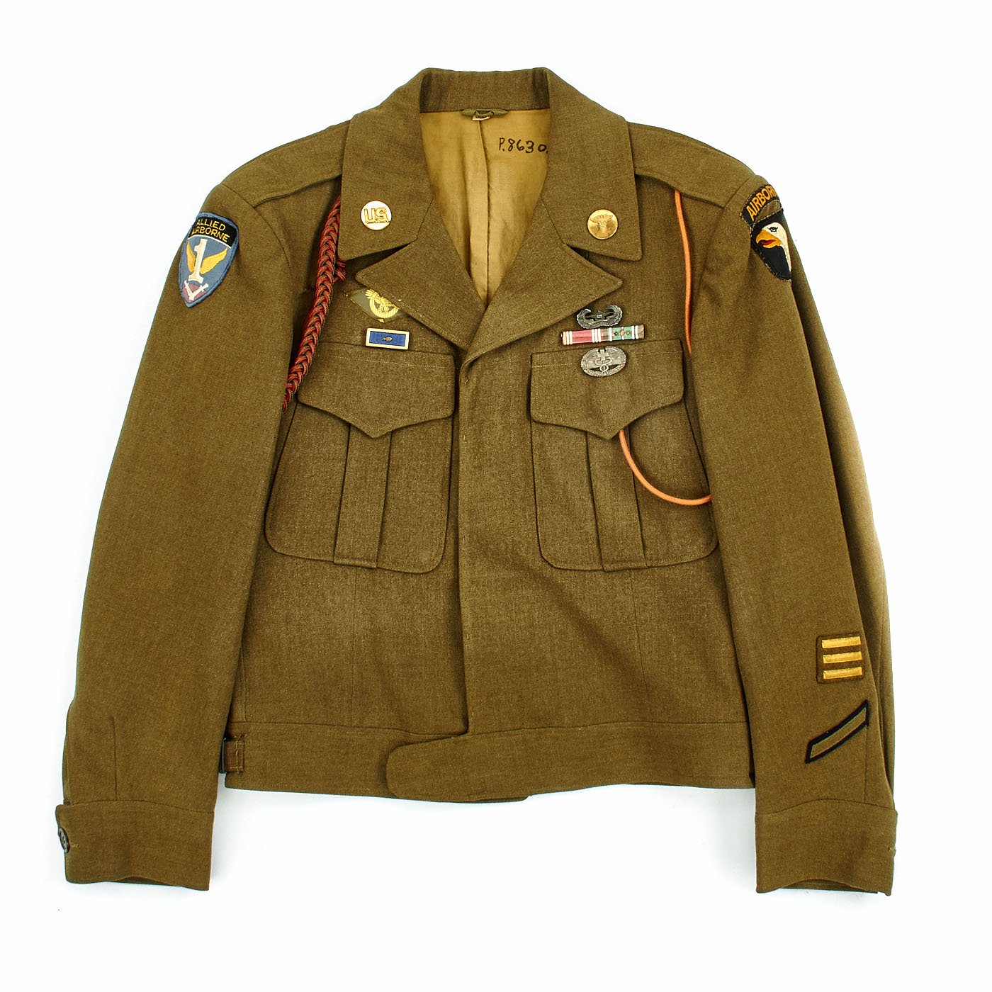 - Wonderful condition size 36S WW2 Ike jacket with Sterling Silver Combat Medic Badge, Sterling Silver Glider Jump Wings, the following medal ribbons: Good Conduct, European–African–Middle Eastern Campaign Medal with Arrow Head with two battle stars. 101st Airborne Patch on left shoulder, Allied Airborne patch on right shoulder, Presidential Unit Citation with Oak Leaf, Belgian Red and Green Fourragère shoulder cord, as well as the "Order of the Orange" shoulder cord awarded by the Dutch government for surviving Operation Market Garden. Left sleeve has 3 overseas bars indication 18+ months in overseas service. Inside lining of the jacket has laundry number in ink in neck that reads P.8630.