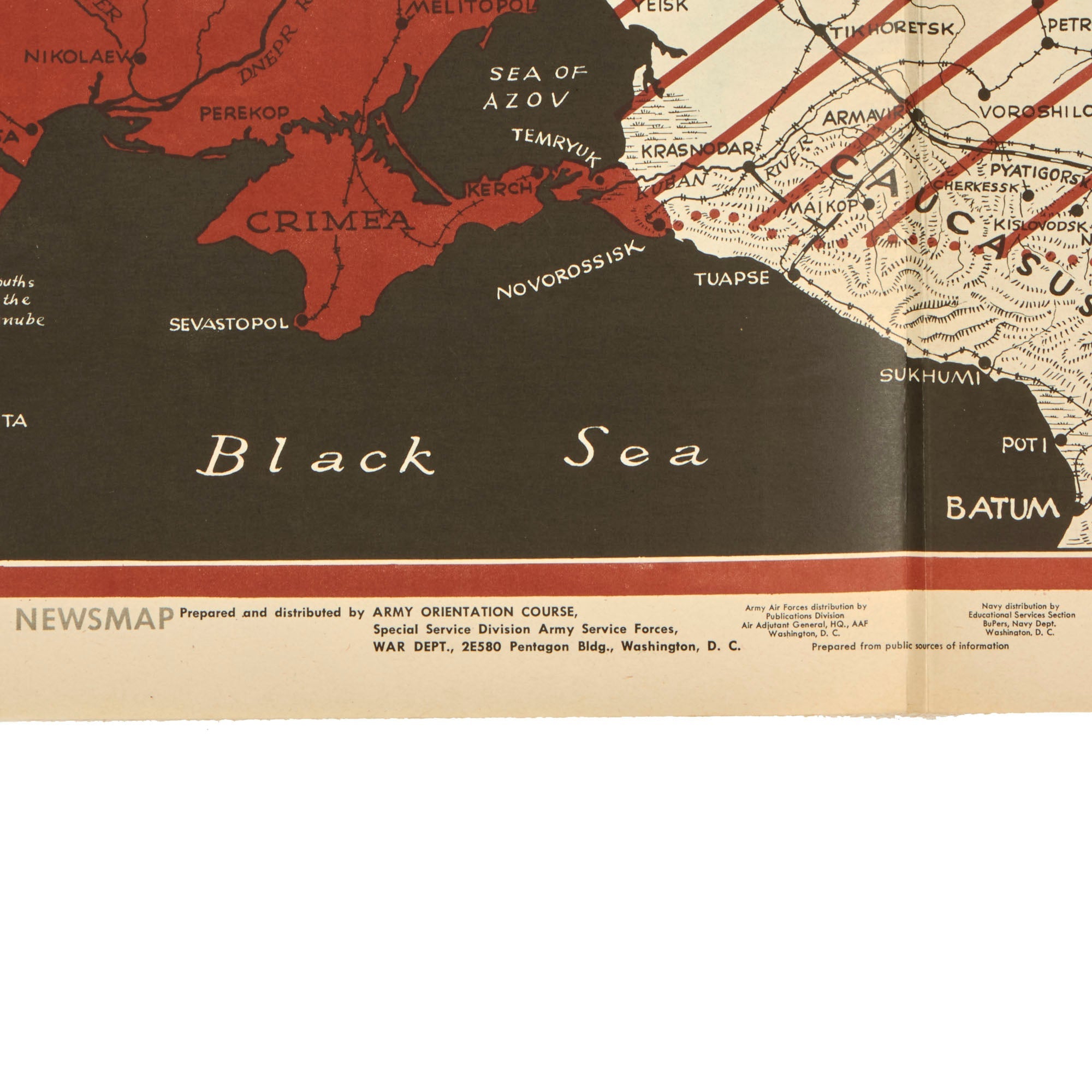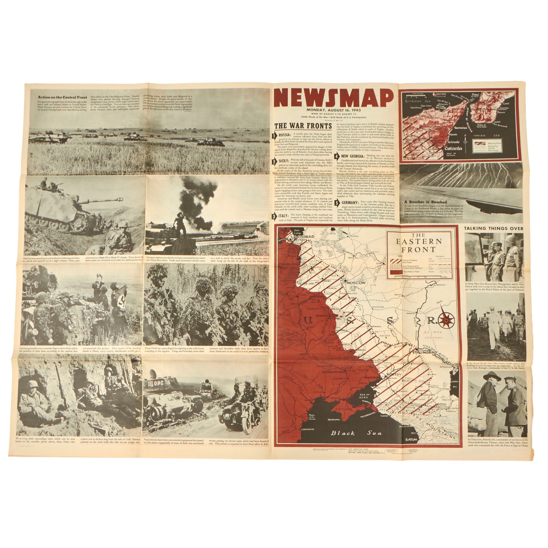 During most of the war, Newsmaps typically featured maps of the world and of local areas seeing fighting, brief summaries of military action during the week, and photographs of troops and materiel. The earliest Newsmaps were printed on one side only. However, beginning with volume 1, no. 5, most Newsmaps had a second side which provided recognition cues for tanks, ships, and planes; information about enemy organization, equipment, and uniform insignia; strategies for defeating or evading enemy weapons; detailed maps; highlights of service achievement; or inspirational posters or photo montages. As hostilities came to a close, Newsmap content switched to revelations of enemy atrocities, and to information on the peace process and reconstruction efforts around the world. Side two content on these later Newsmaps often focused on preparation for the return to civilian life.
