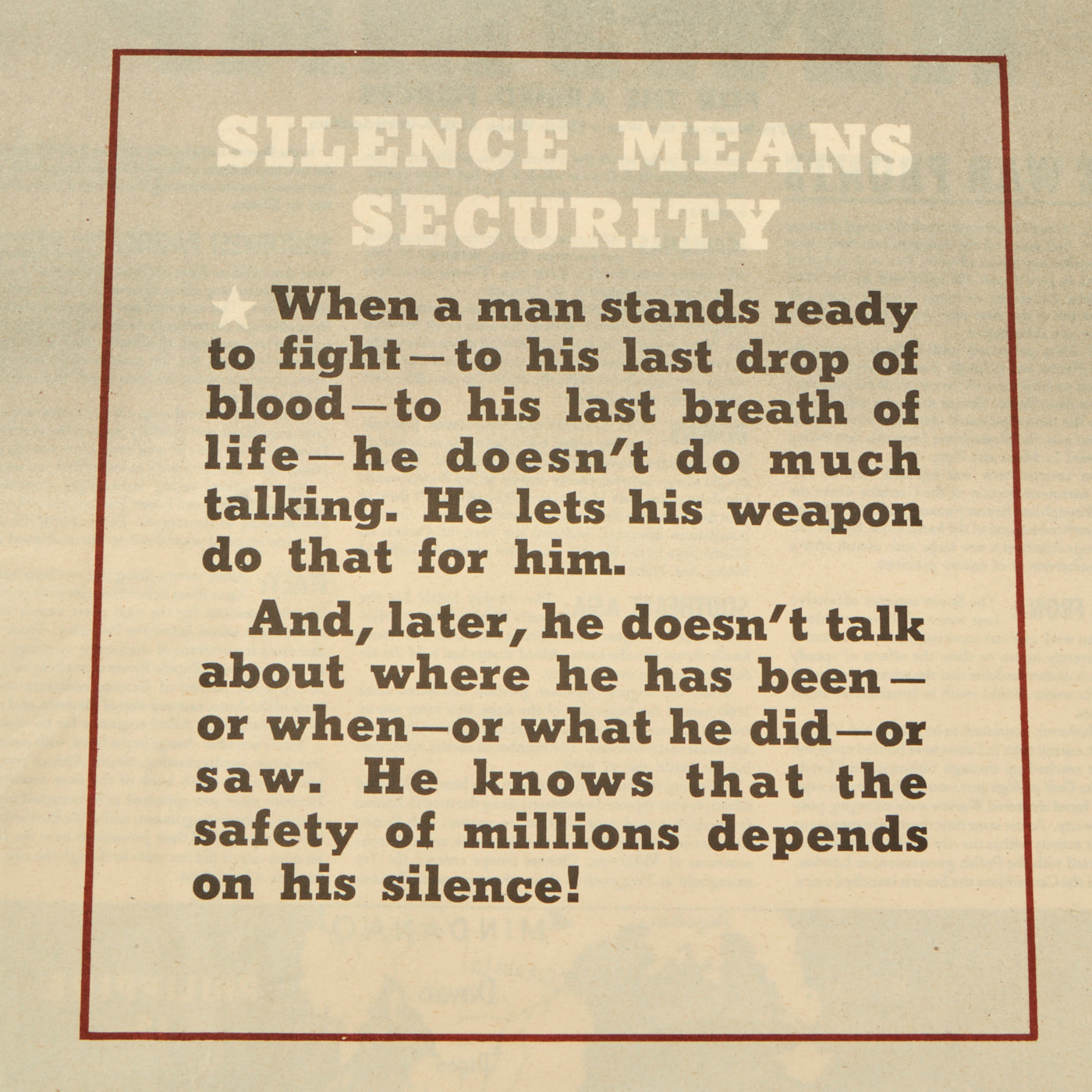 “Words are ammunition. Each word an American utters either helps or hurts the war effort. He must stop rumors. He must challenge the cynic and the appeaser. He must not speak recklessly. He must remember that the enemy is listening.”
