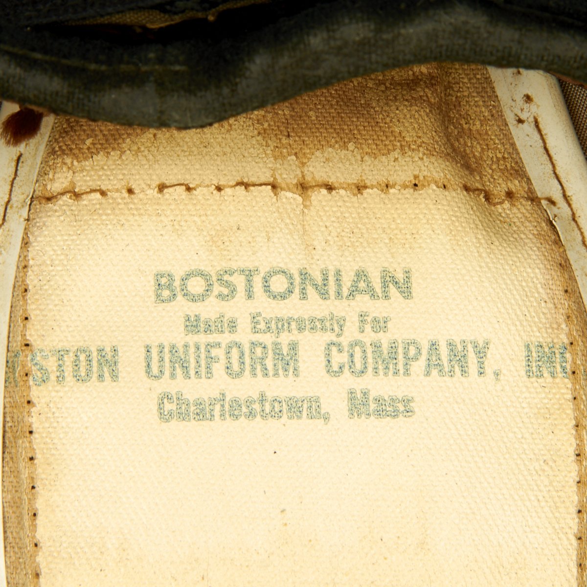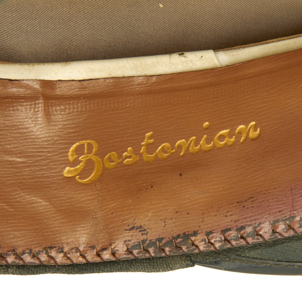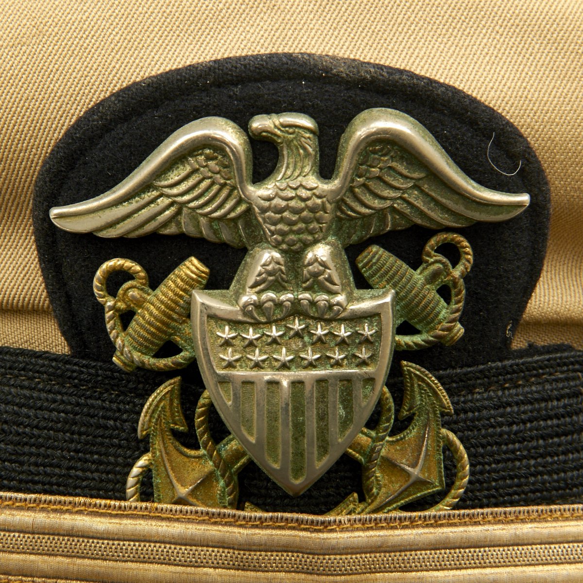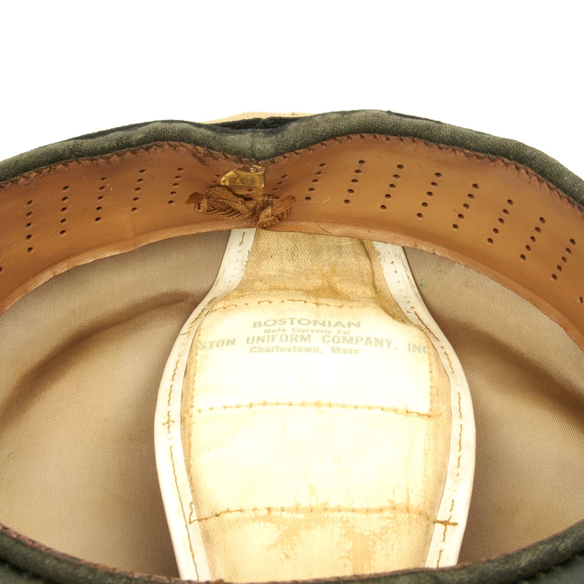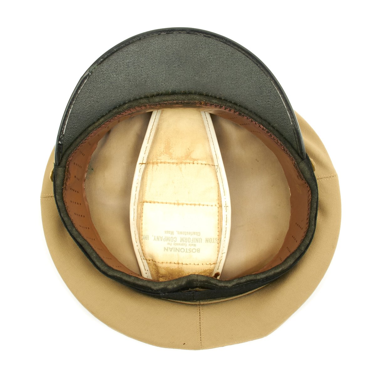 Original Item: One-of-a-kind. This is an original "Bostonian" model U.S. Navy Officer's Visor cap in summer Khaki issue color, was made for BOSTON UNIFORM COMPANY, INC., as marked on the top strap. The sweatband is embossed with Bostonian in gold, and there is still a faded paper tag on the back with the size 7 3/8. The cap still has the original size tag with the same size marked. The front of the cap has a stamped officer's Eagle badge over brass crossed anchors.