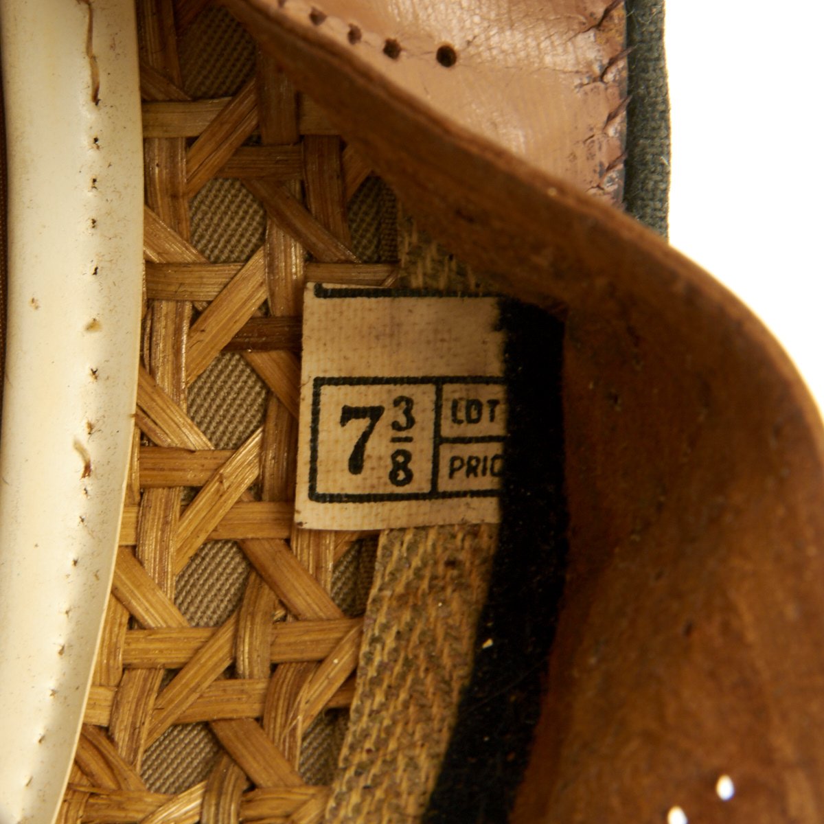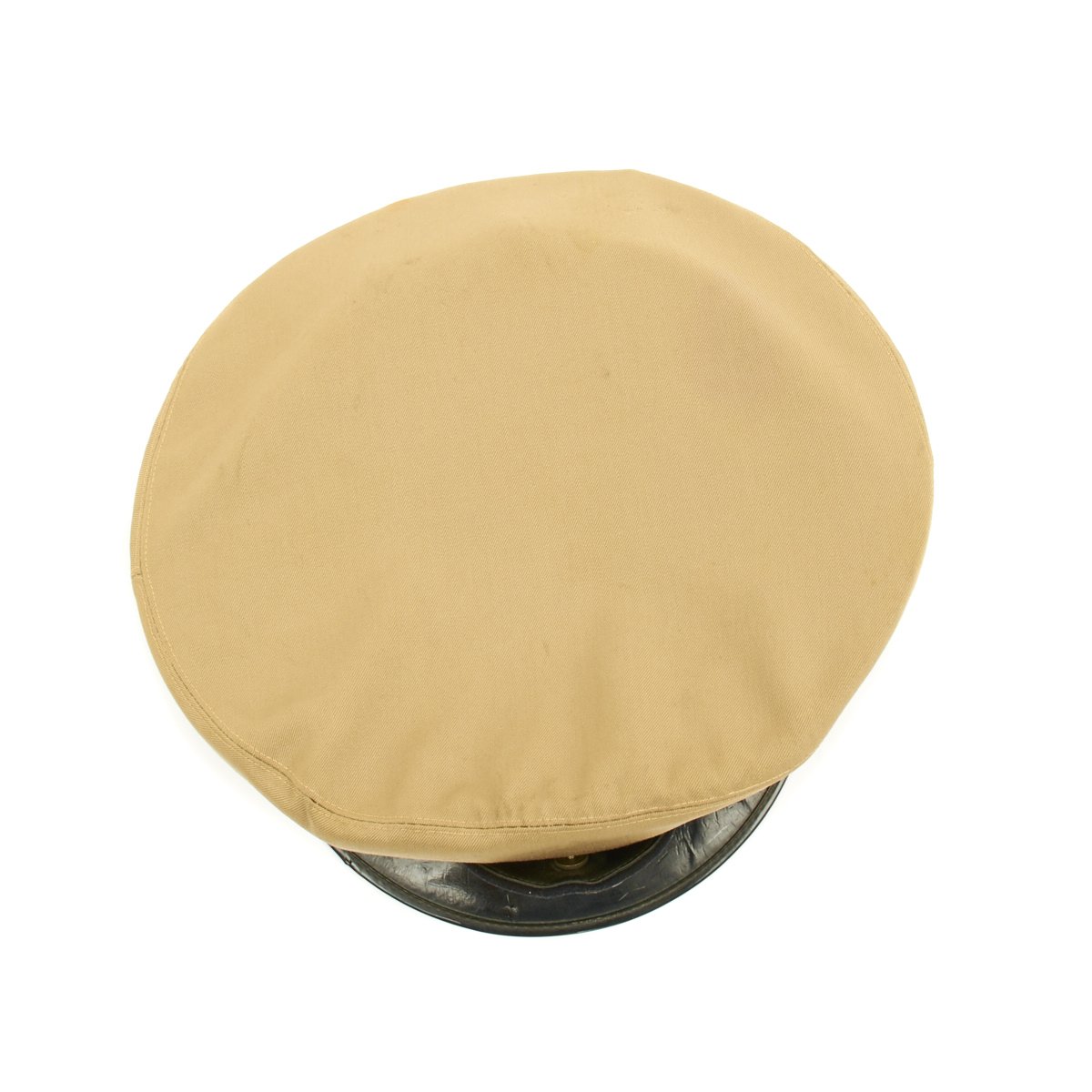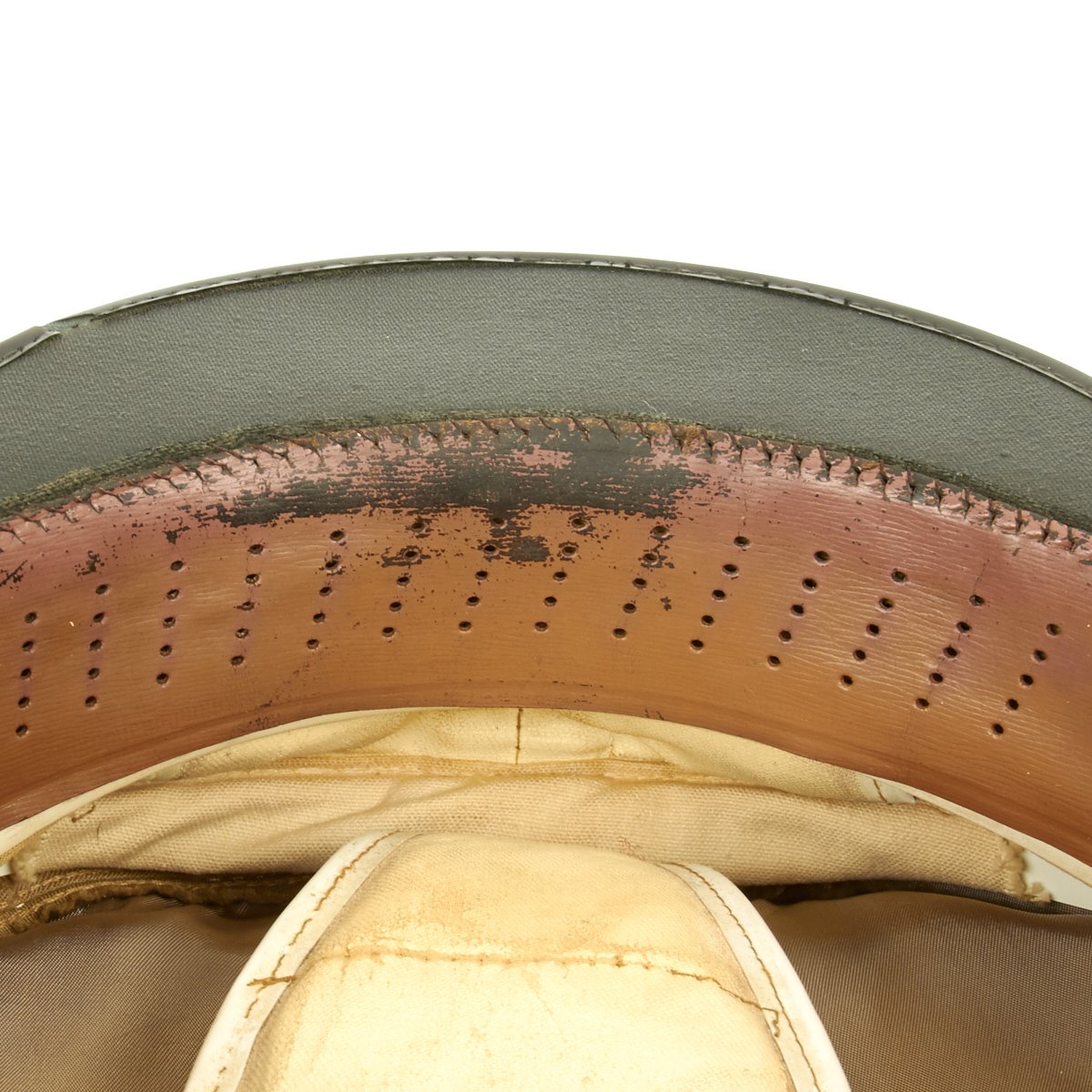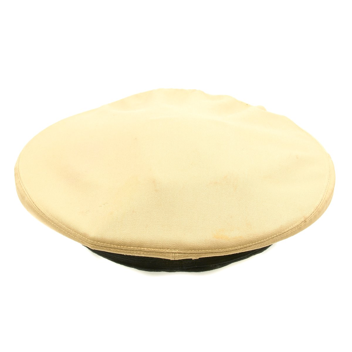 The cap is in great shape, with only minor staining to the fabric and a few small holes. The patent leather visor/peak does have a crack, and some wear, and there is general wear on the sweatband and surrounding area. The original stiffener is still intact, and attached to the top band.