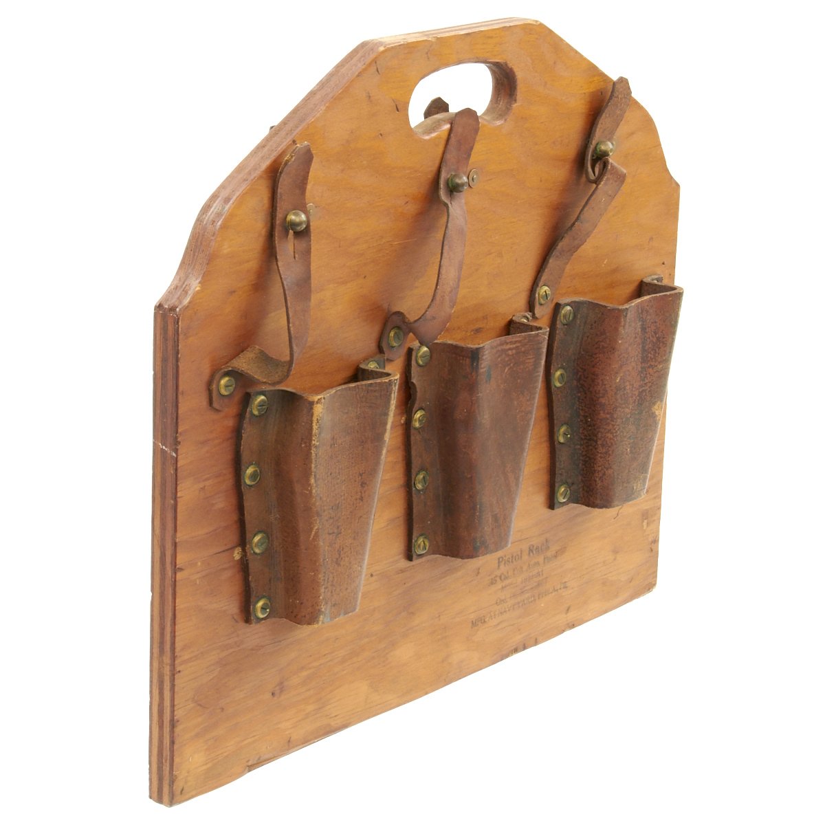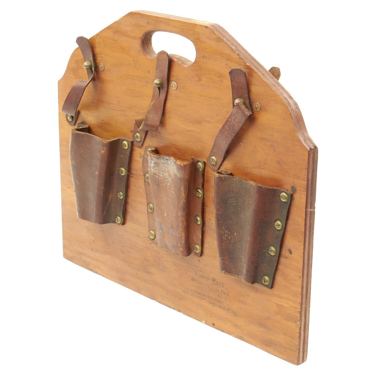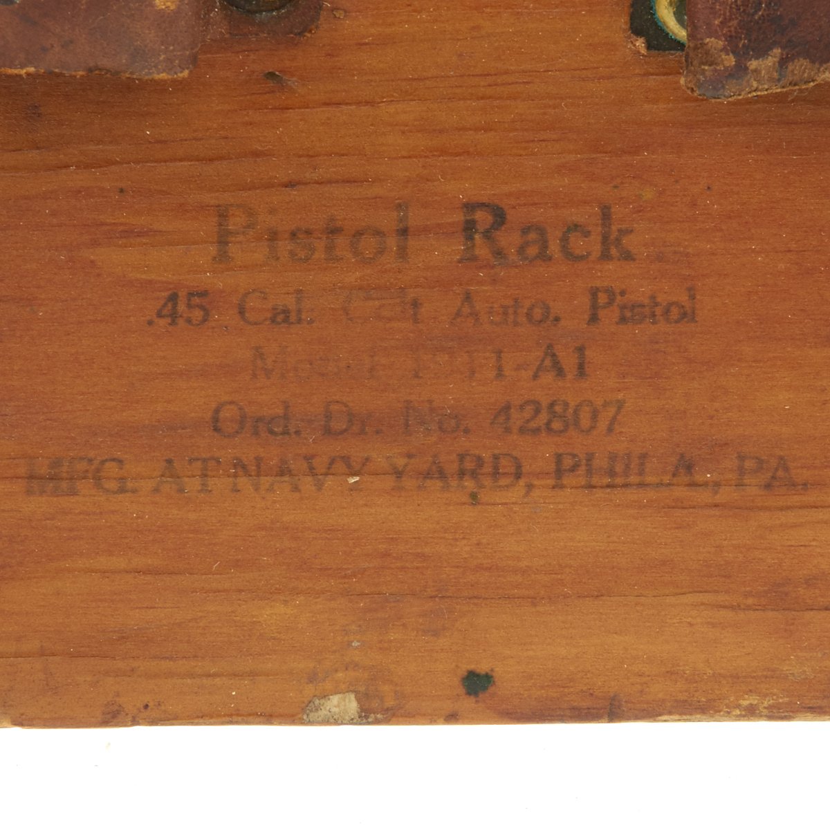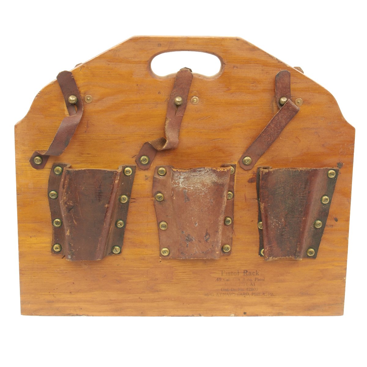 Original Item: Only One Available. This is a fantastic condition WW2 issue wood and leather rack used aboard U.S. Navy Ships to store up to 6 Colt 1911A1 Automatic Pistols.