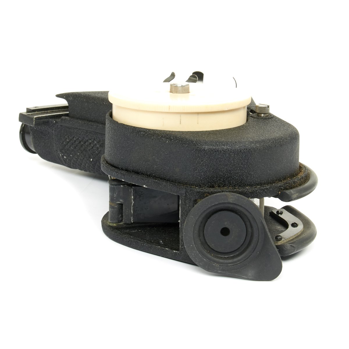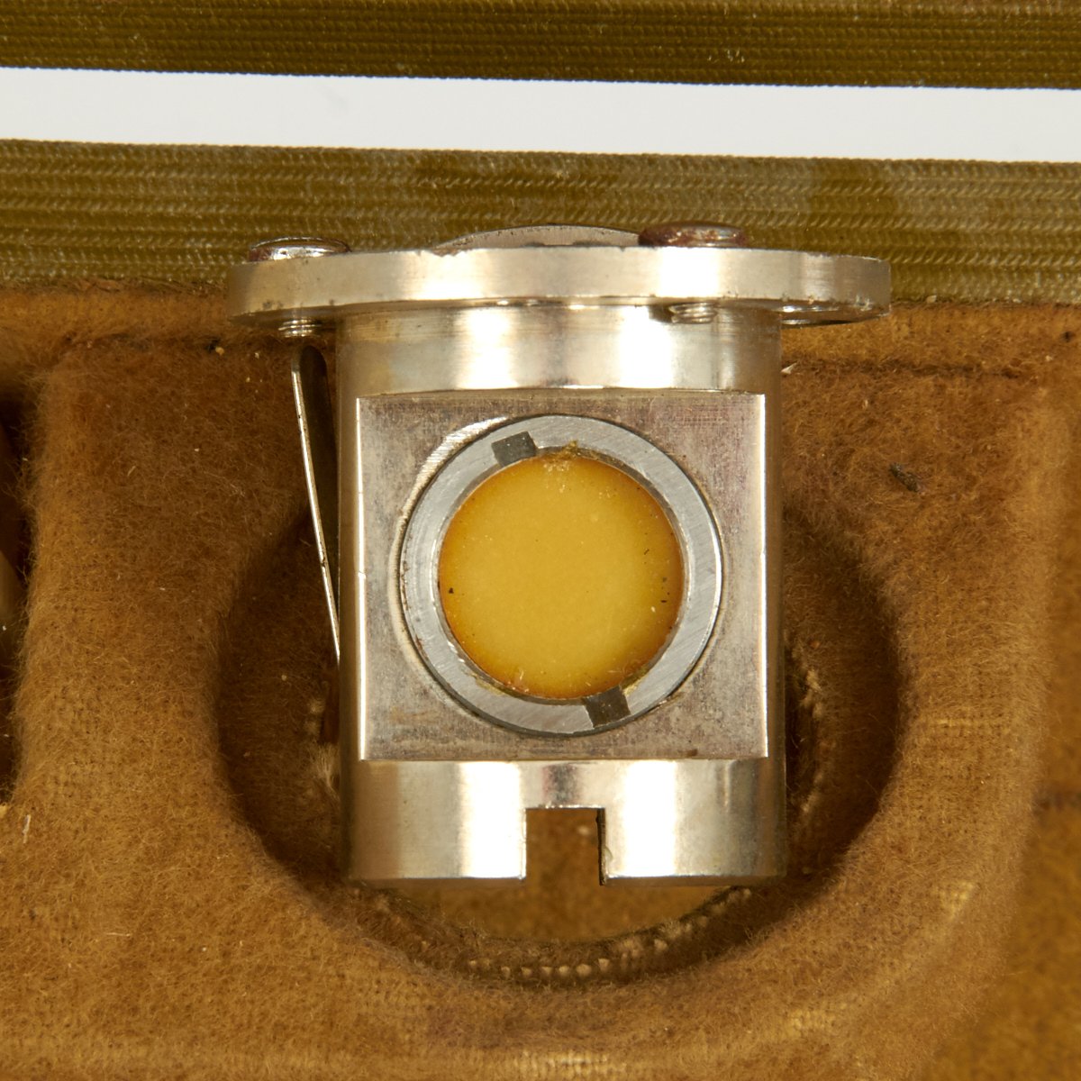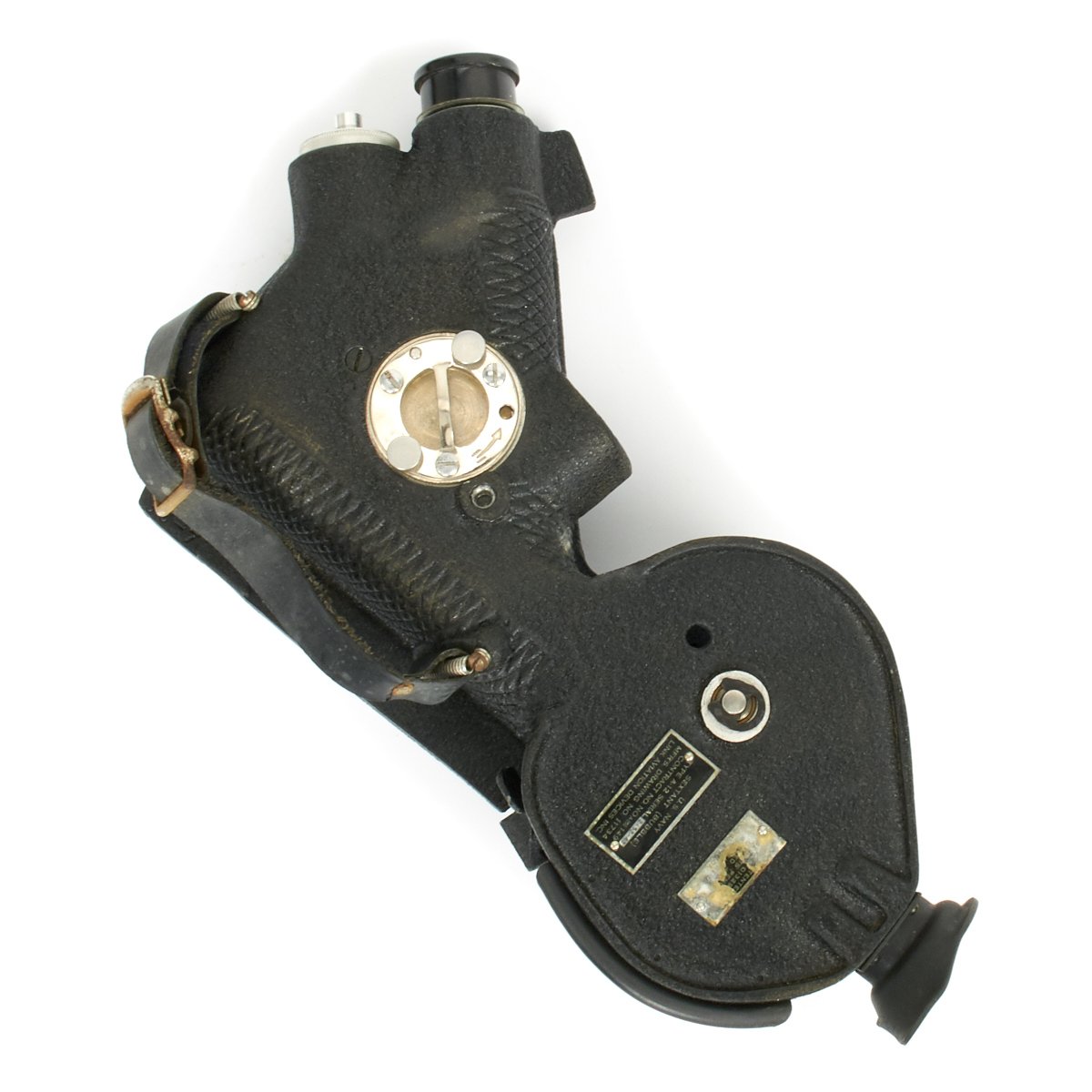 Celestial altitudes are measured by reference to an artificial bubble horizon. The bubble is electrically lighted for night use by standard C size batteries. The sextant is very unique in that it has two different optical paths that can be used. In one, the observer looks down into the sextant and sees the reflected image of the star overhead. We suspect this is the mode designed for open cockpits. In the other mode, the observer holds the sextant at arm’s length and sees the bubble reflected on a glass surface as an illuminated ring against the night sky. Readings are taken from a vernier scale.