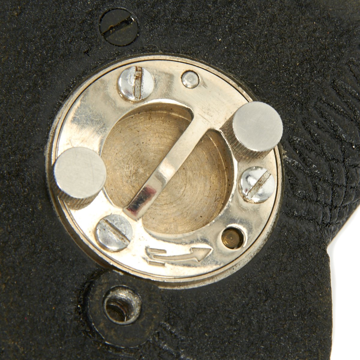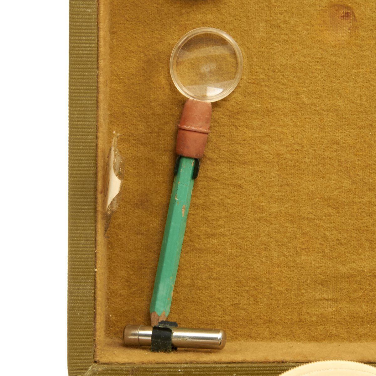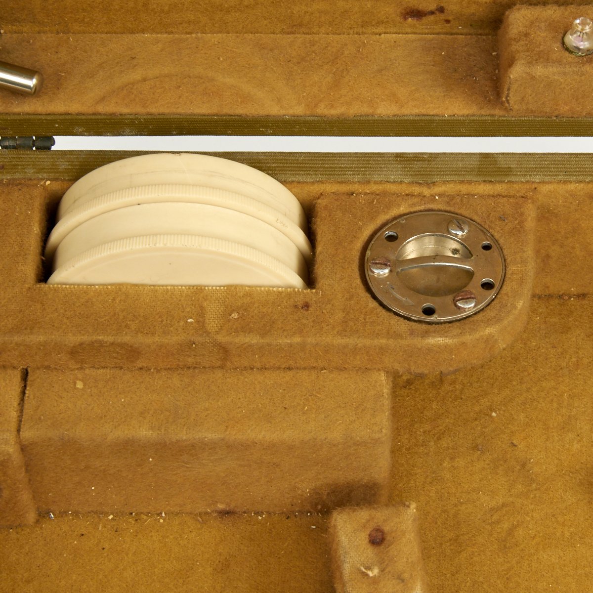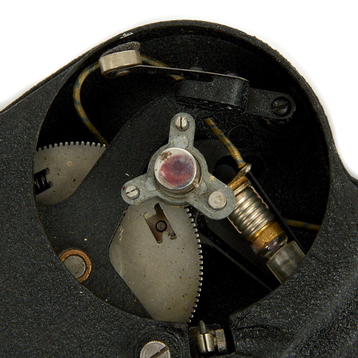 Celestial altitudes are measured by reference to an artificial bubble horizon. The bubble is electrically lighted for night use by standard C size batteries. The sextant is very unique in that it has two different optical paths that can be used. In one, the observer looks down into the sextant and sees the reflected image of the star overhead. We suspect this is the mode designed for open cockpits. In the other mode, the observer holds the sextant at arm’s length and sees the bubble reflected on a glass surface as an illuminated ring against the night sky. Readings are taken from a vernier scale.
