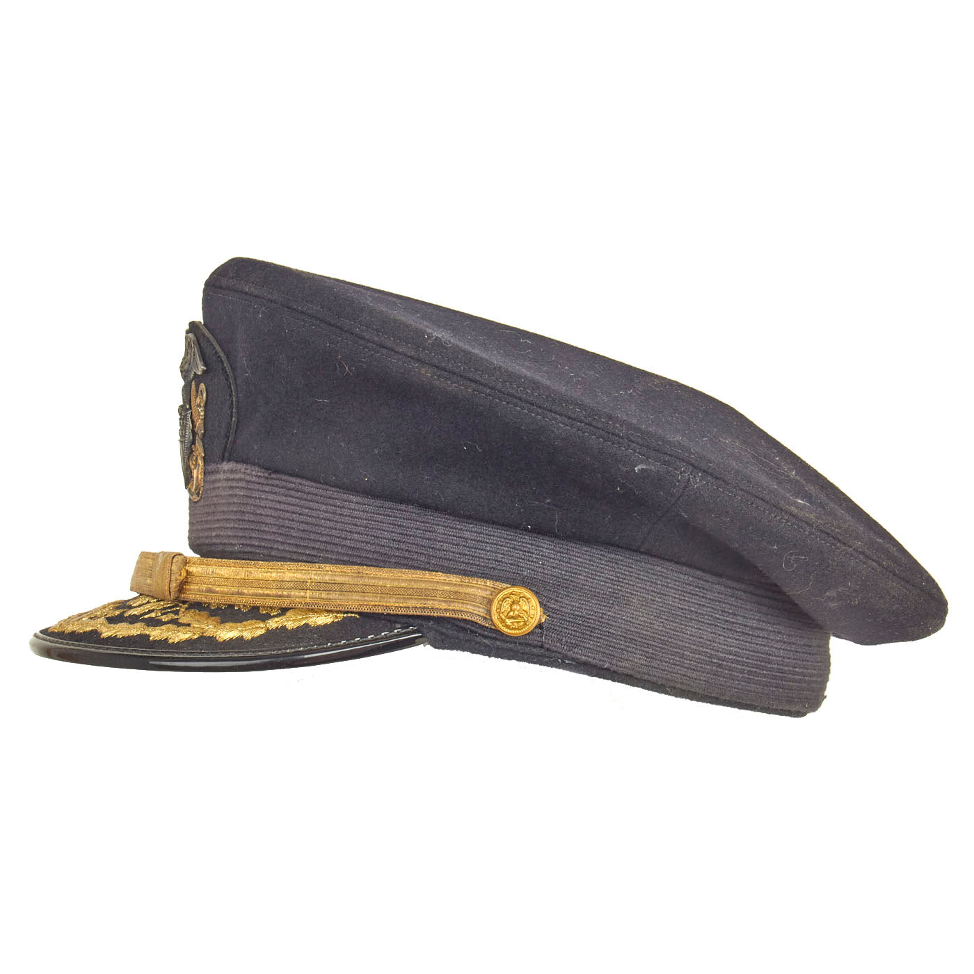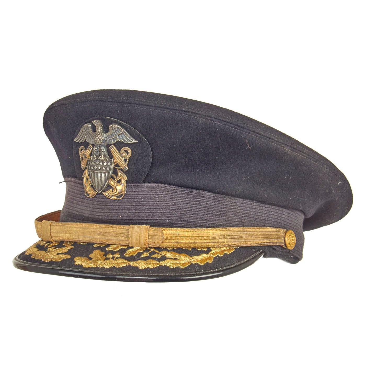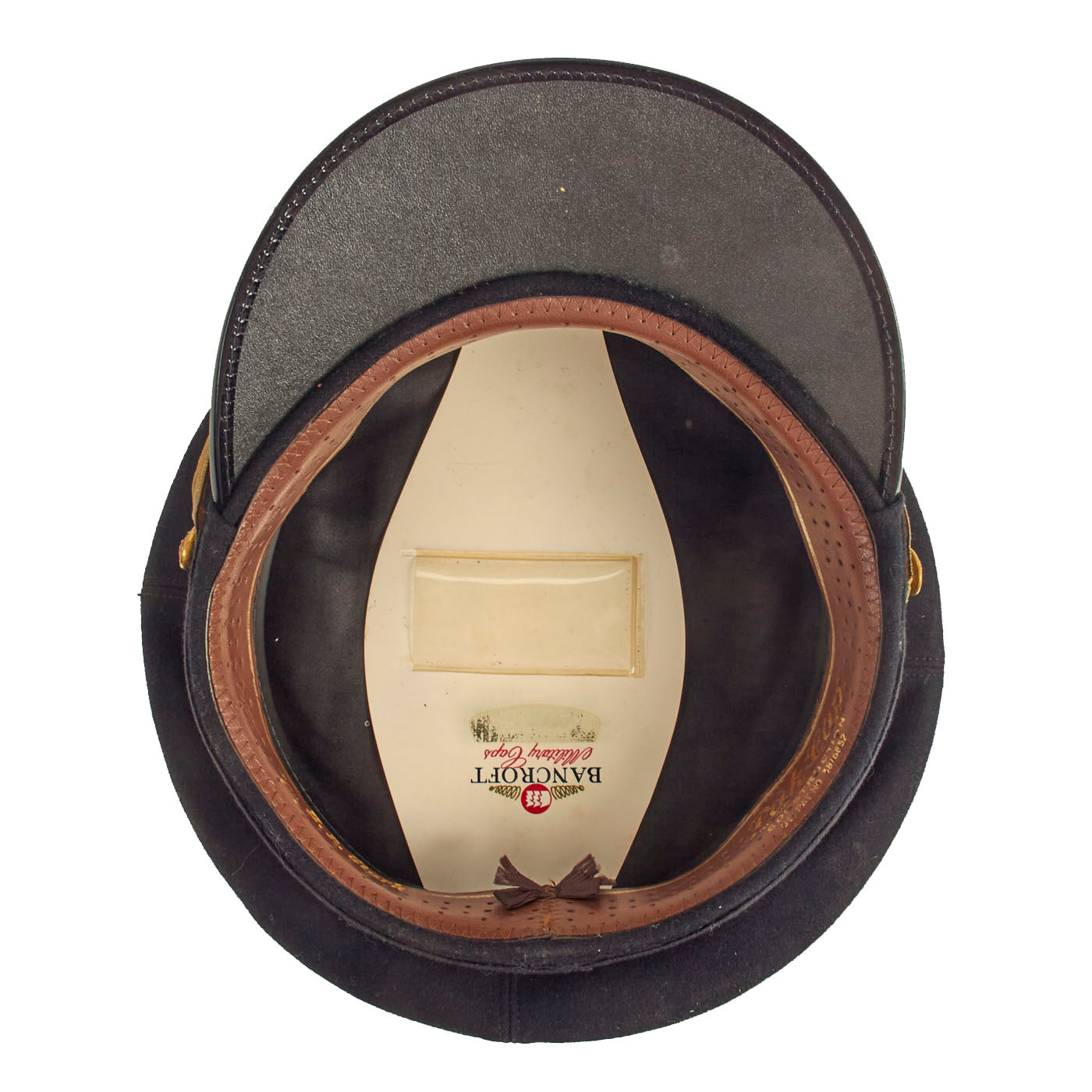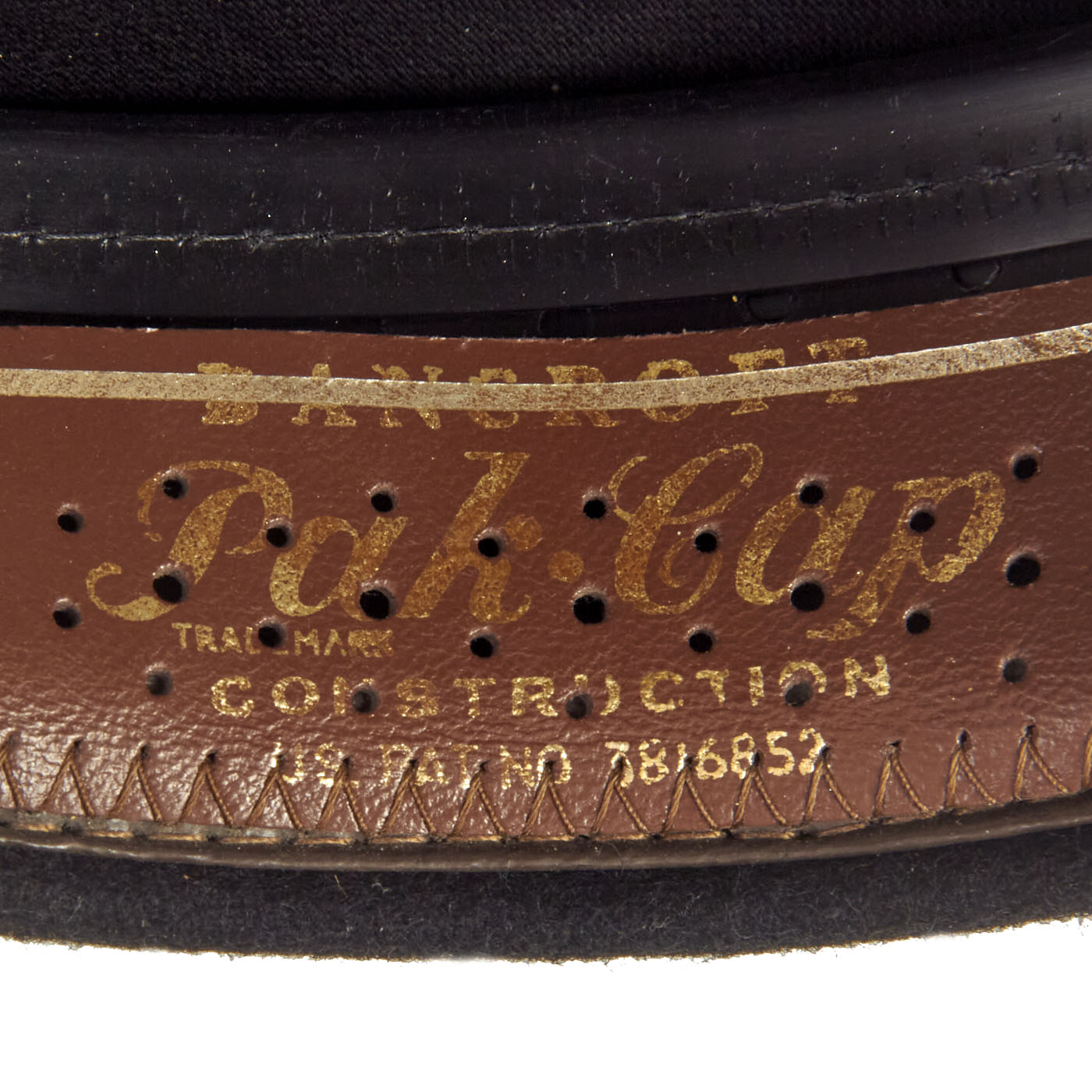 This is an original PAK CAP model U.S.Navy Admiral visor cap in black. It was made by BANCROFT who was known for the very finest quality hats. It features a black hard plastic/leather frame construction with wool topped leather visor with bullion oak leaf embroidery and a silver American eagle cap badge with a gold chinstrap.