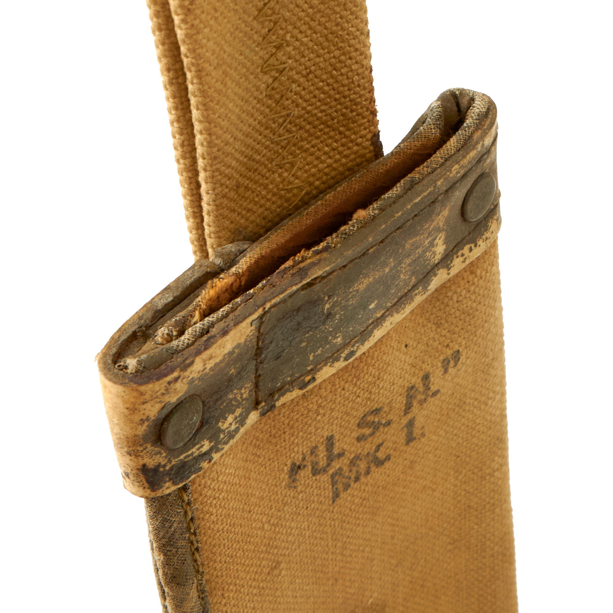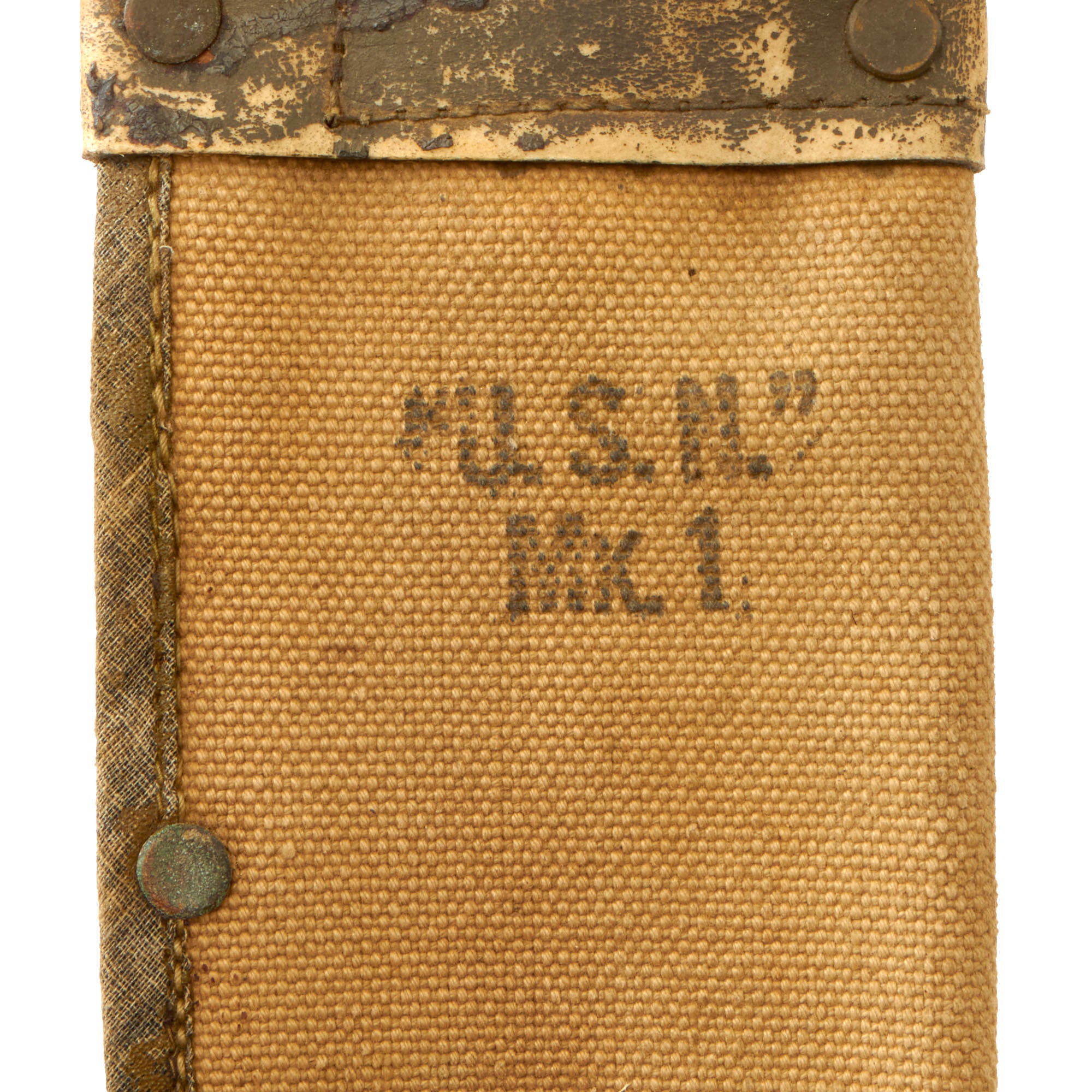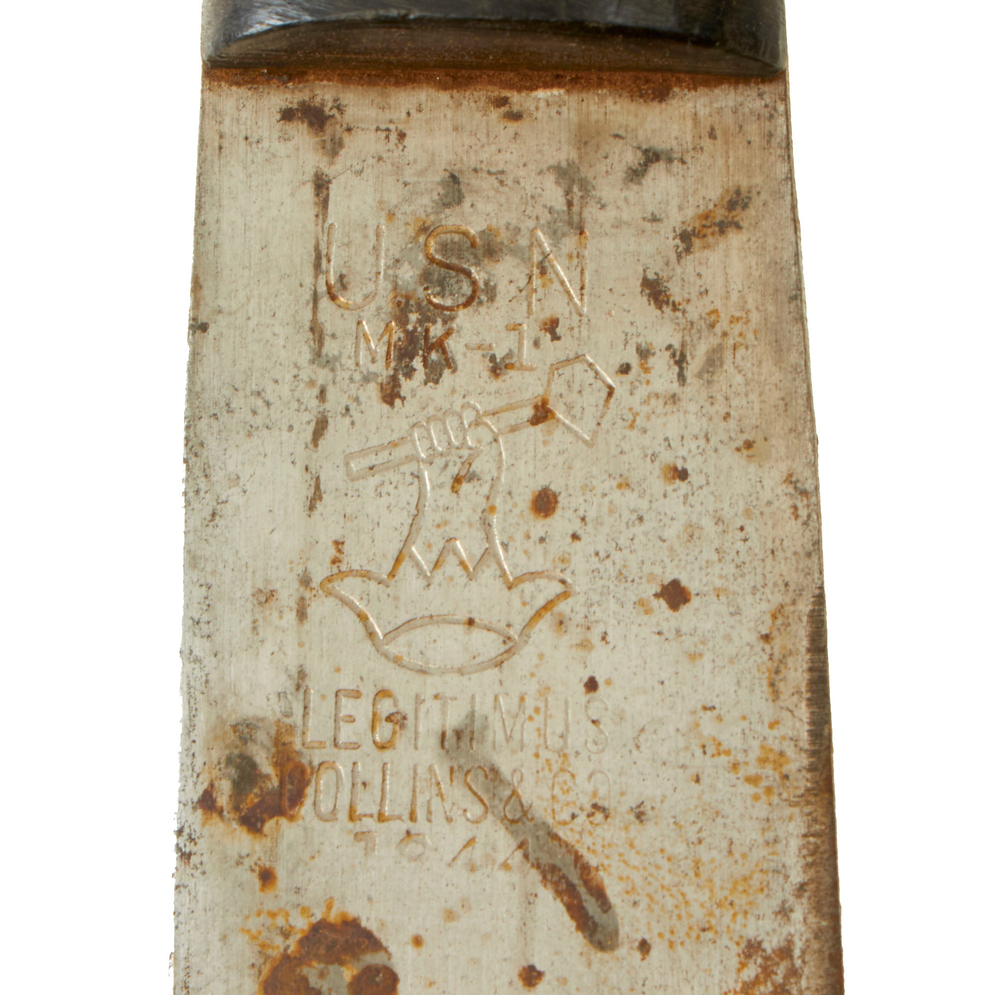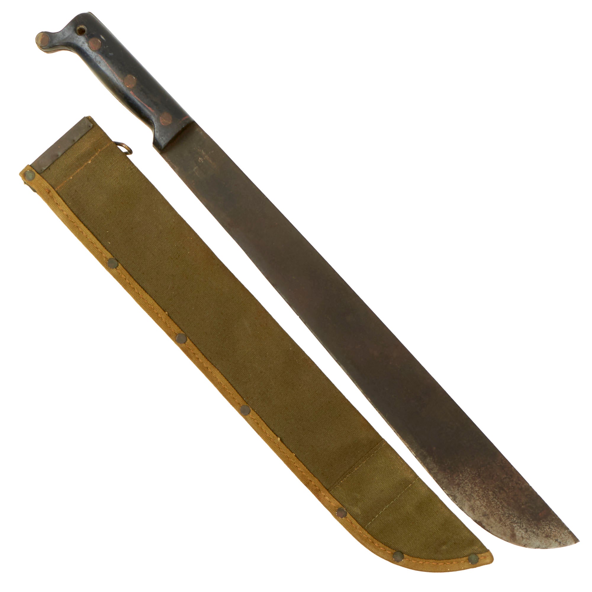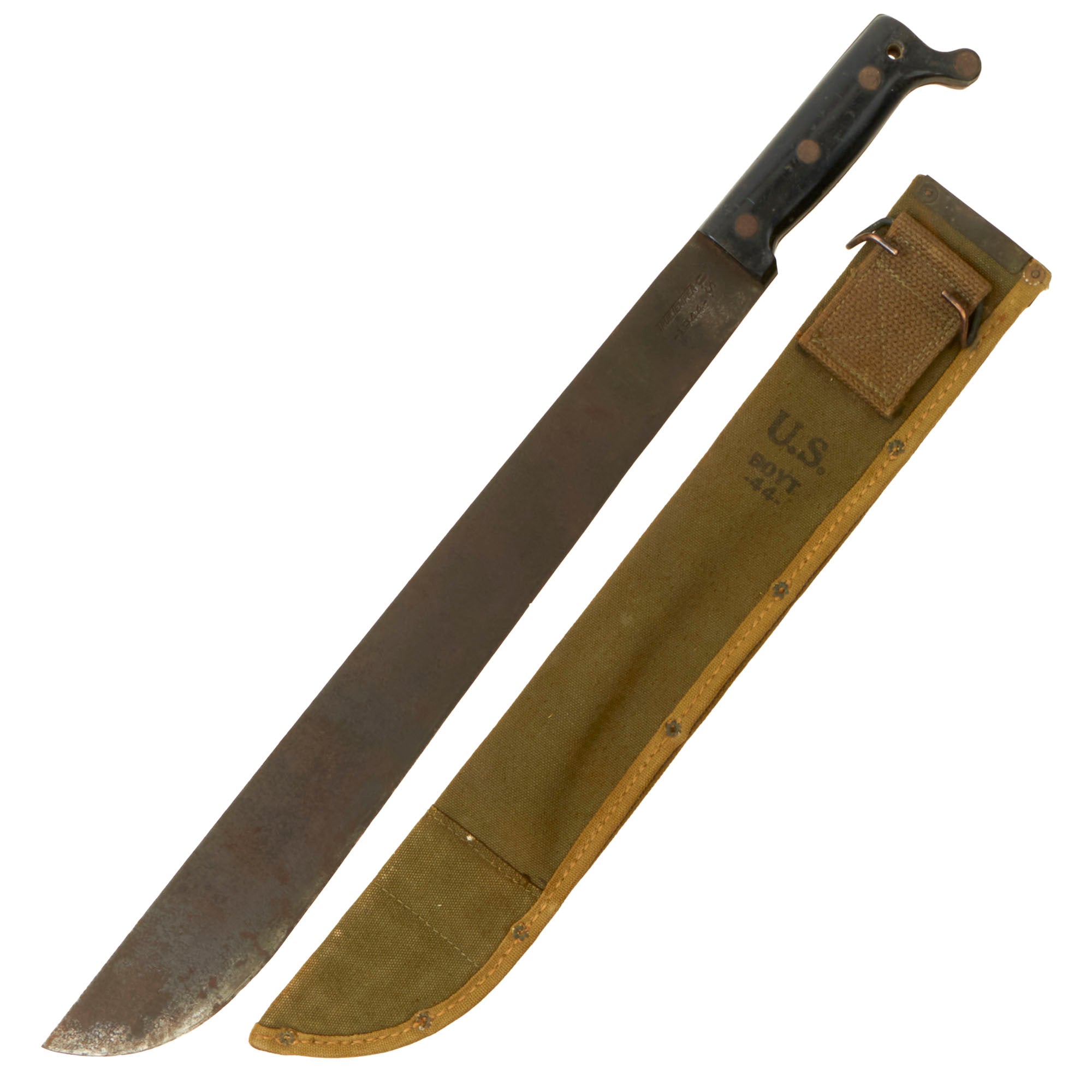 -1944 Dated Navy Legitimus Collins & Co Machete with U.S.N. Navy Mk. 1 Marked Scabbard: Made by Collins & Co. of Hartford, Conn, this is a LEGITIMUS model long jungle machete. The Machete has an impressive overall length of 31 ¼ inches, with a straight 26 inch Bush/Collins machete shape blade. The blade is about 2 ⅛ inches wide at the thickest point. The blade is heavily oxidized from age but the maker’s mark is still present. Good example overall.