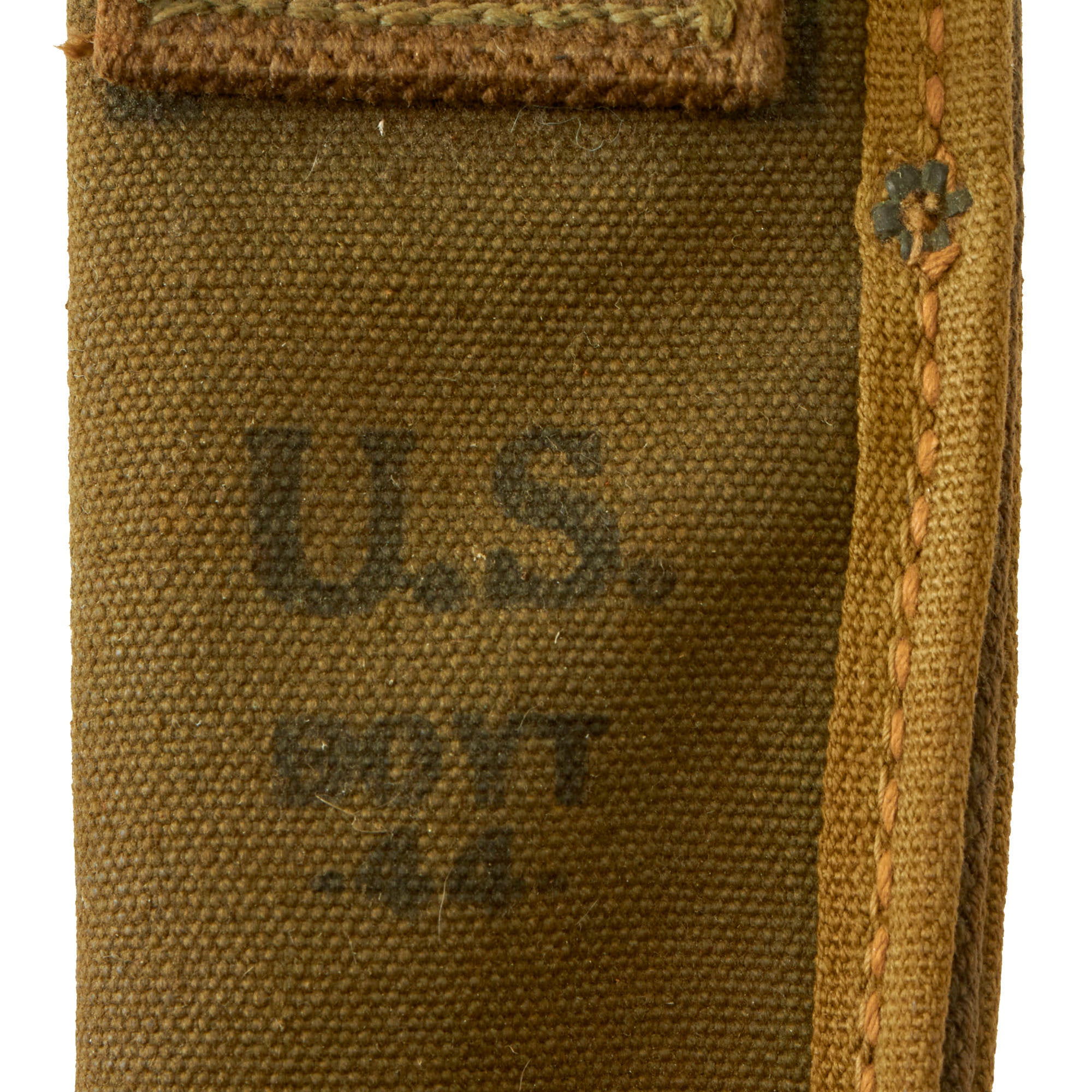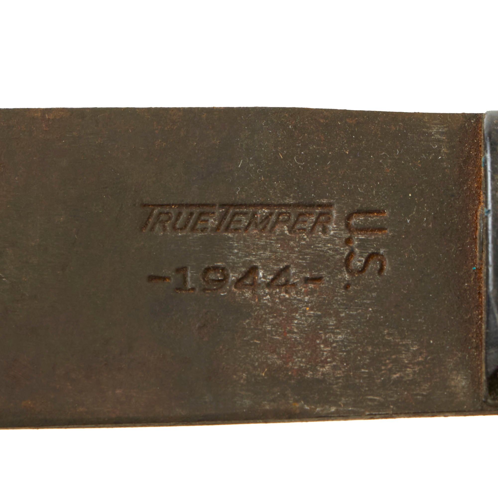 -1944 Dated Army 23” True Temper (American Fork & Hoe) Machete With Boyt Scabbard: Most of the early tools associated with the name TRUE TEMPER can be described as hand tools with wood handles. The blade on this example is heavily oxidized, and the rivets are just as oxidized, with a small red paint stripe on the hilt. The scabbard is in great shape and reads U.S. BOYT -44-. The blade measures roughly 18” long with an overall length of 23”.