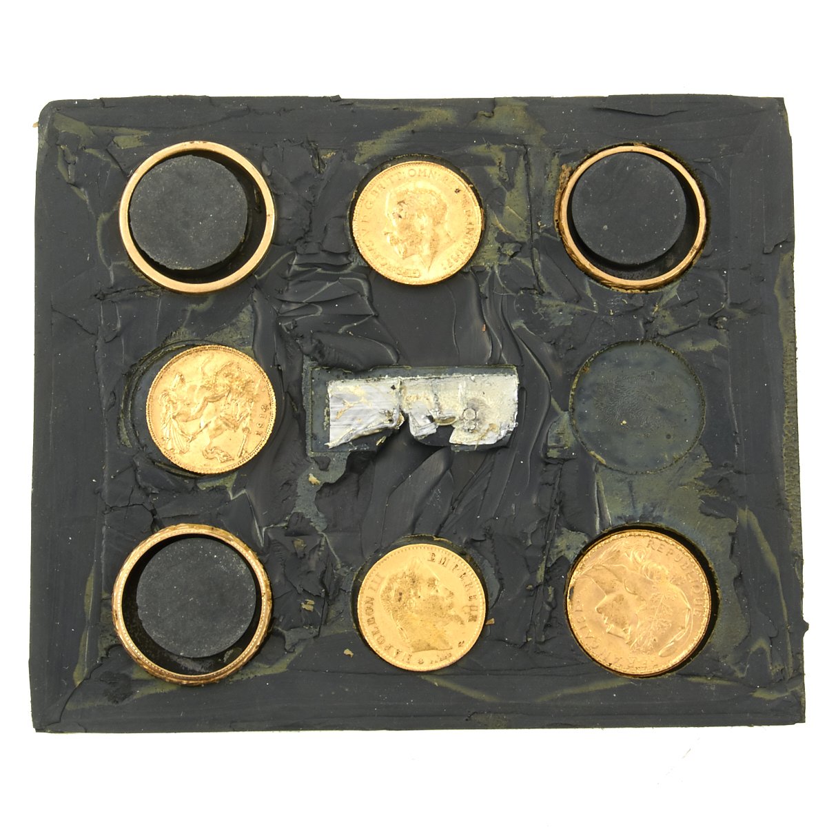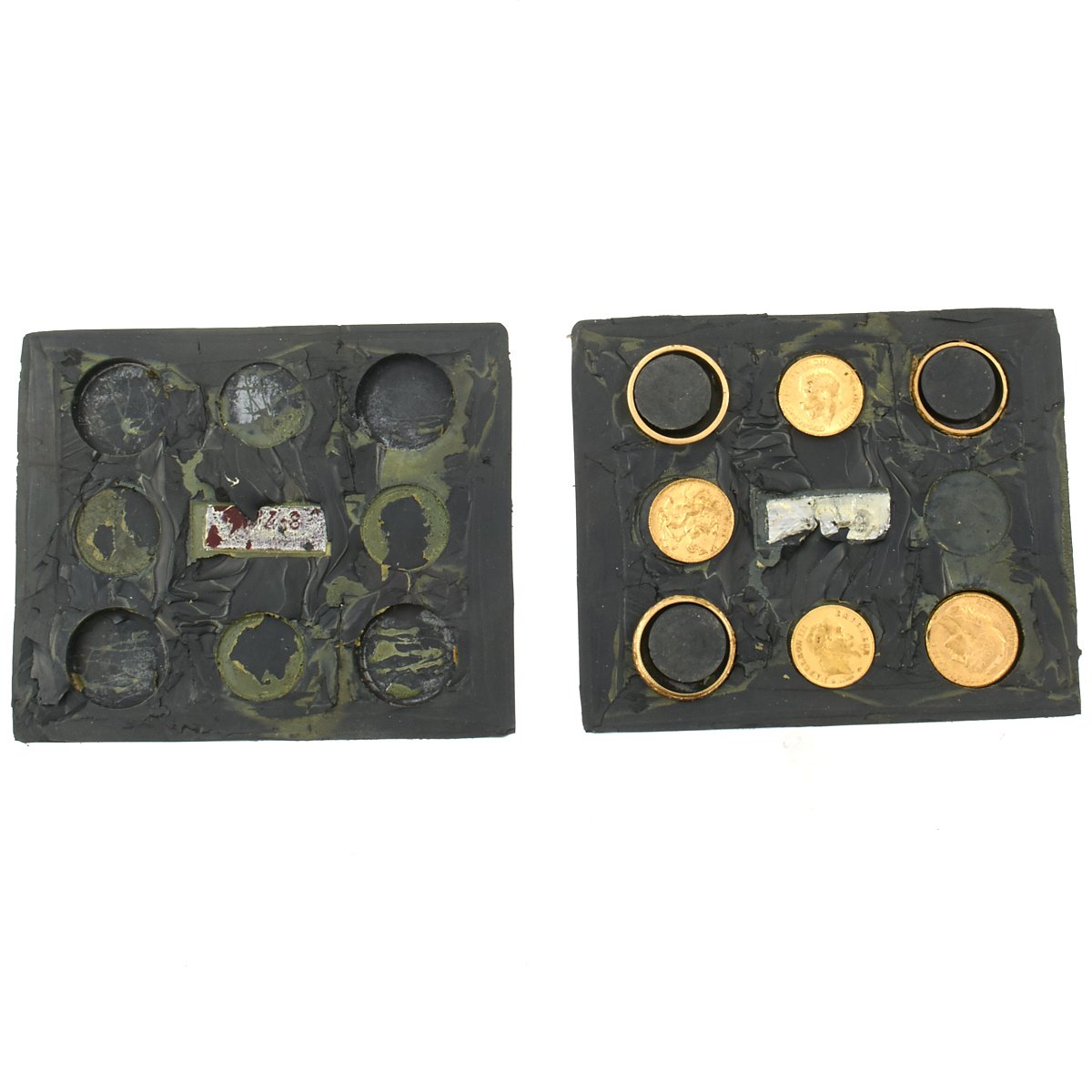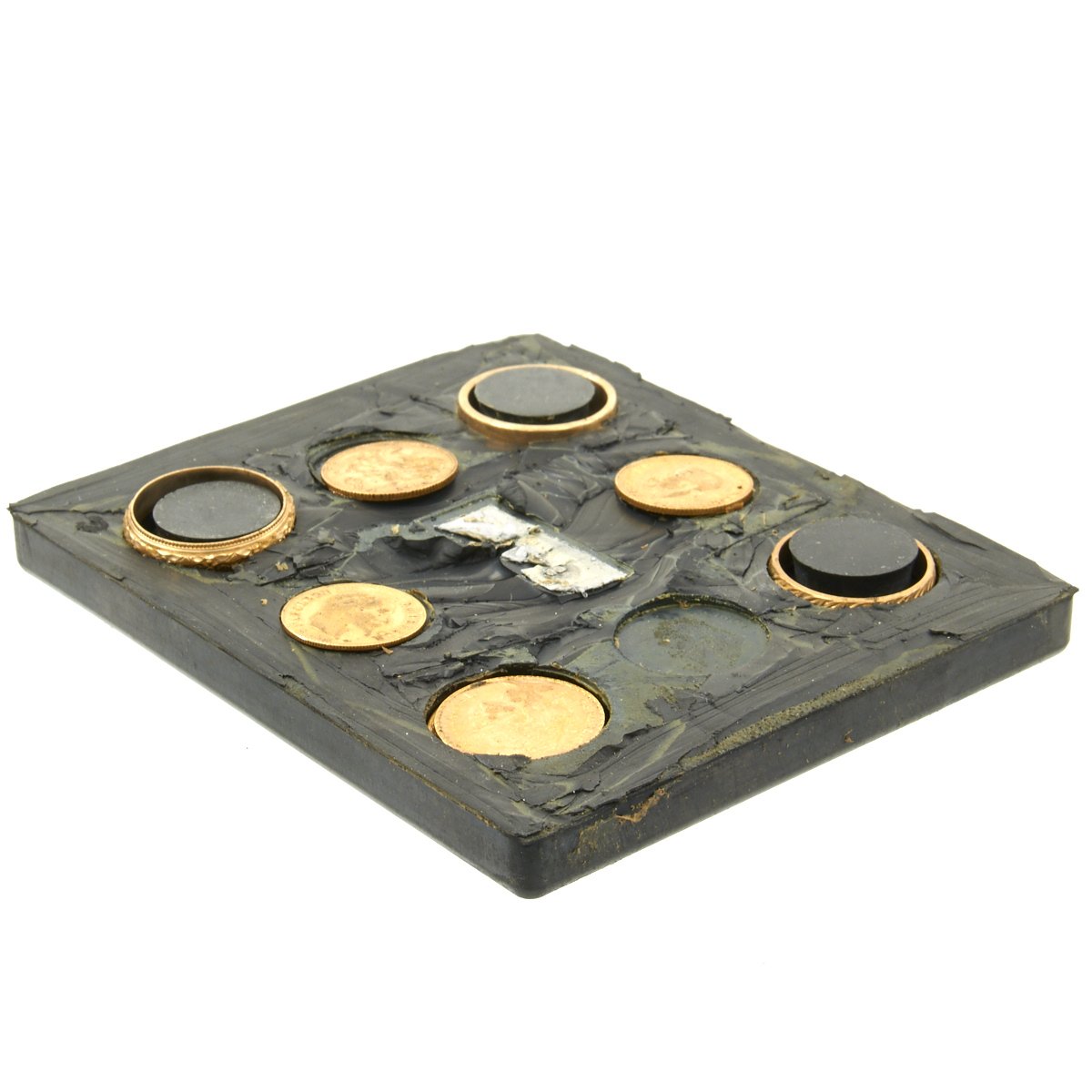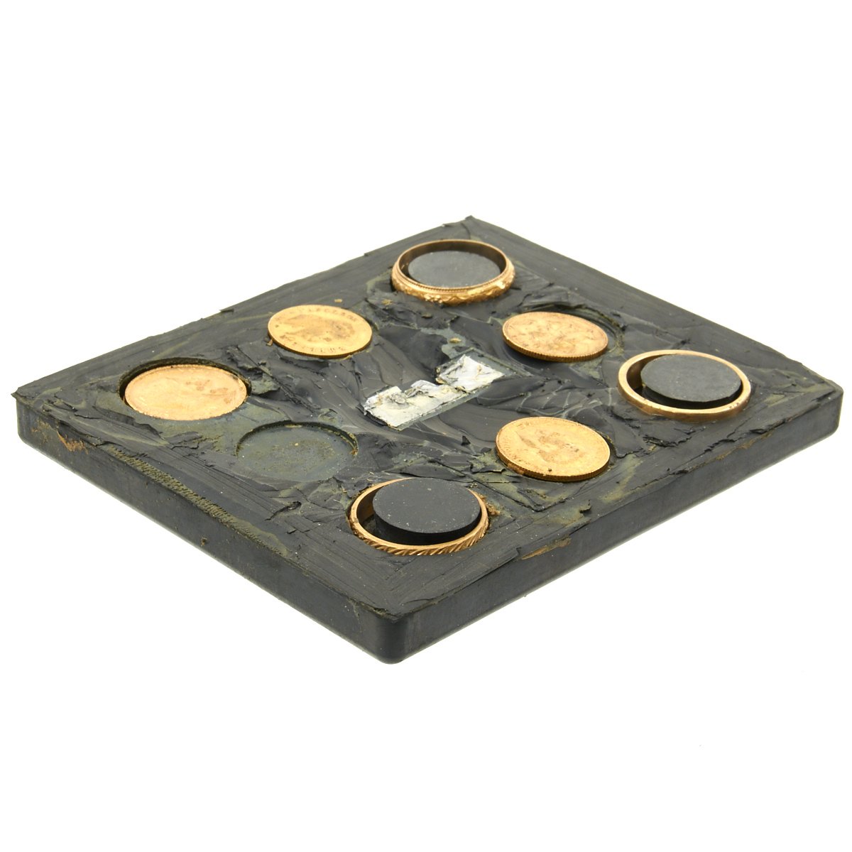 Issued to Navy pilots and aircrew, the Atlantic kits contained approximately .90 troy ounces of gold. The gold consists of 5 coins and three rings as follows: French 20 Franc, French 10 Franc, British Sovereign, 2 British Half Sovereigns, and 3 Gold Wedding Band Rings (two at 20K and one at 9K). All designed for military personnel caught behind enemy lines to use as barter, the outside of the kit reads IF FOUND RETURN TO COMNAVAIRLANT (ONAL 34) NORFOLK, VIRGINIA. All of this is contained in an individually numbered solid rubber block that measures 3-5/8" x 4-3/8". This unsealed complete kit is serial number 948. The value of the gold in today's market is approximately $1250.