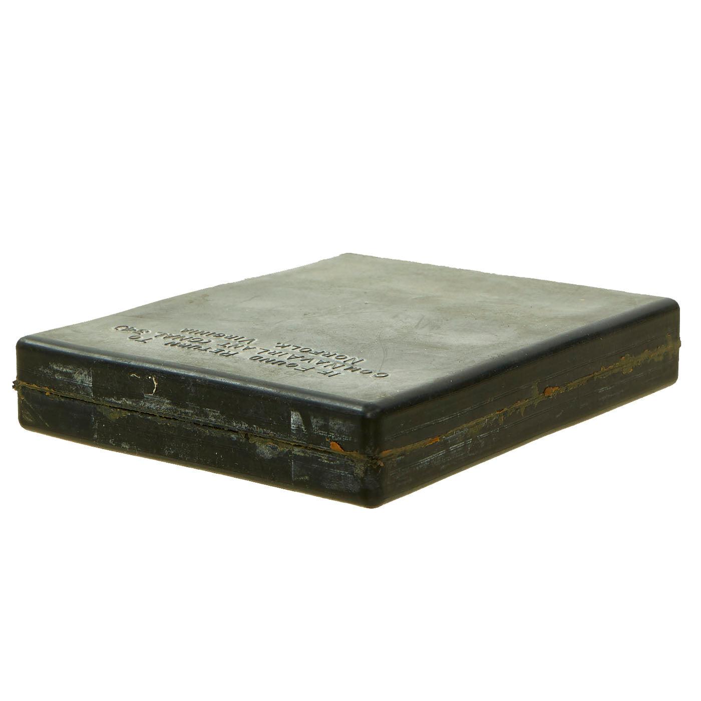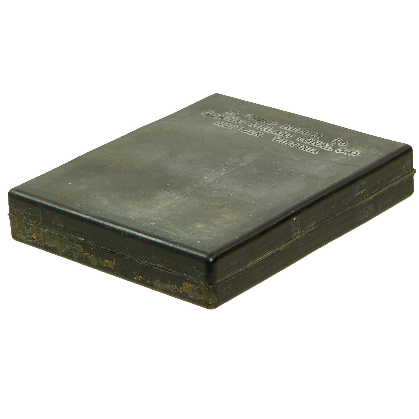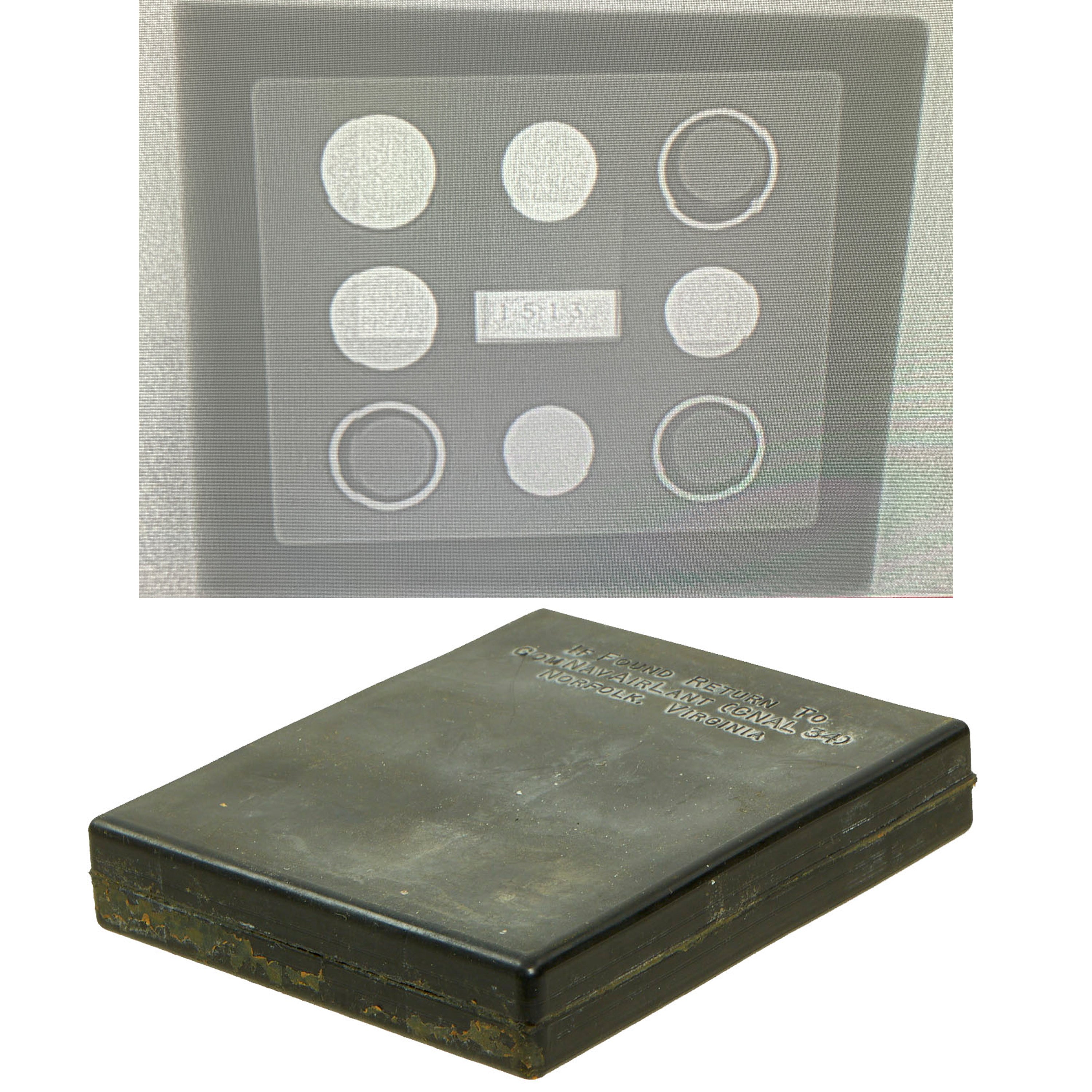 Issued to Navy pilots and aircrew, the Atlantic kits contained approximately .90 troy ounces of gold. The gold consists of 5 coins and three rings as follows: French 20 Franc, French 10 Franc, British Sovereign, 2 British Half Sovereigns, and 3 Gold Wedding Band Rings (two at 20K and one at 9K). All designed for military personnel caught behind enemy lines to use as barter, the outside of the kit reads IF FOUND RETURN TO COMNAVAIRLANT (ONAL 34) NORFOLK, VIRGINIA. All of this is contained in an individually numbered solid rubber block that measures 3-5/8" x 4-3/8". This sealed, never opened kit is serial number 1513. After an x-ray was performed on this particular kit to determine that it is complete and never tampered with you can even see the lead data plate inside the kit which clearly reads 1513. A printed copy of the x-ray will be included with the purchase of this kit. The number 1513 is also scratched into the rubber exterior which is correct for serial numbers 1000-1999. The value of the gold in today's market is approximately $1800.