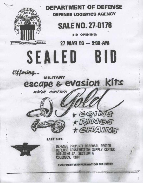 World War II United States Navy Escape and Evasion Barter "Atlantic Kit". The contents of the sealed hard rubber kits varied in contents, they were developed for use in Europe and Pacific theaters and they were issued to certain airmen. Referred to as "barter kits" for use in case of an emergency landing or bailout in an unfriendly or primitive area overseas. The airman could barter in aiding escape and evasion in difficult situations by local civilians. The kits being of such value were a controlled item and each kit had its own serial number. They were accountable, and the airman had to sign for each kit upon issue and return as instructed if not used. Note: Gold value during this time period was approximately $25 per ounce market value.
