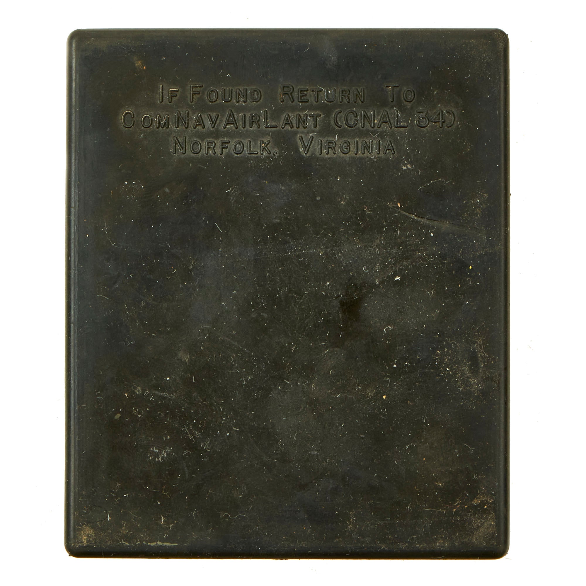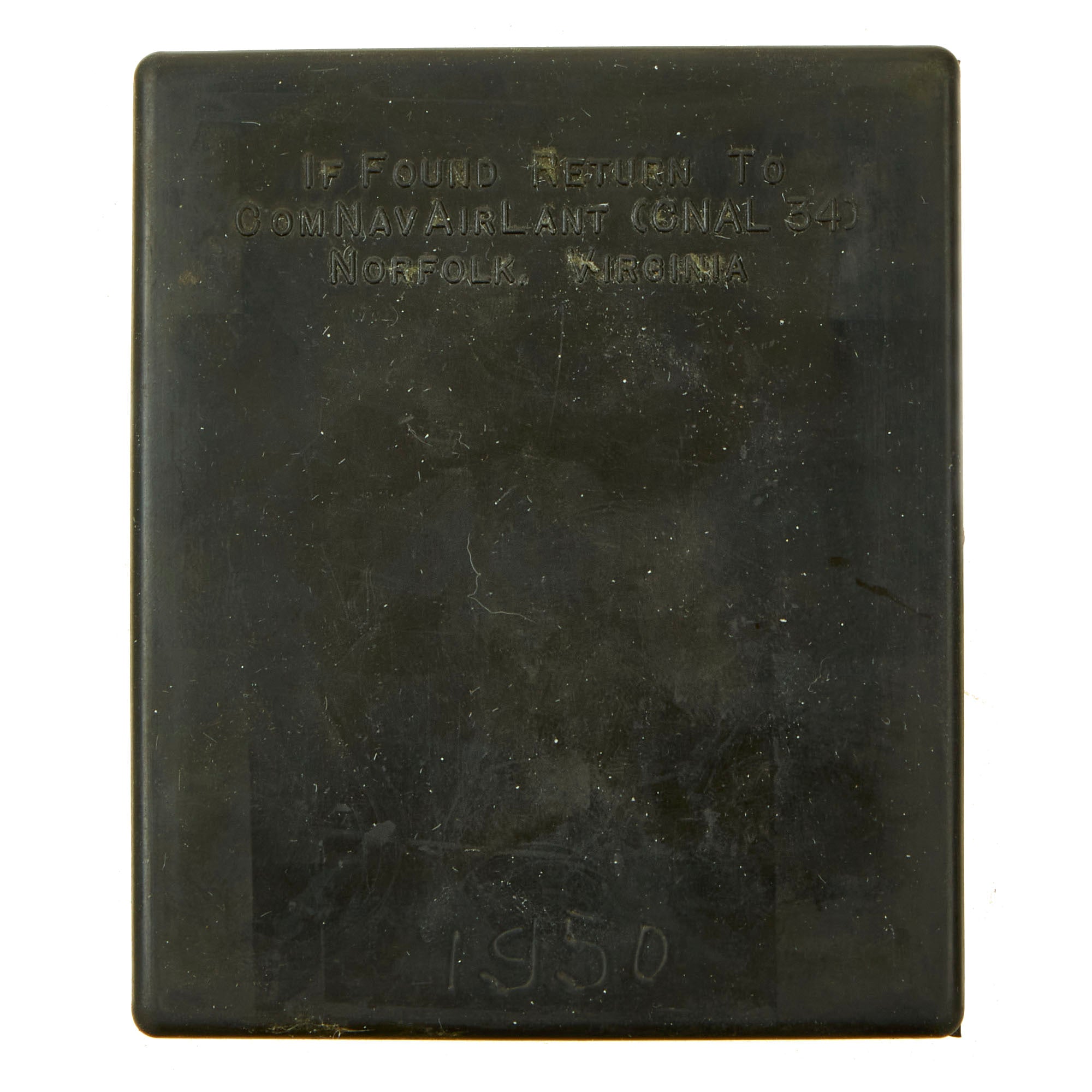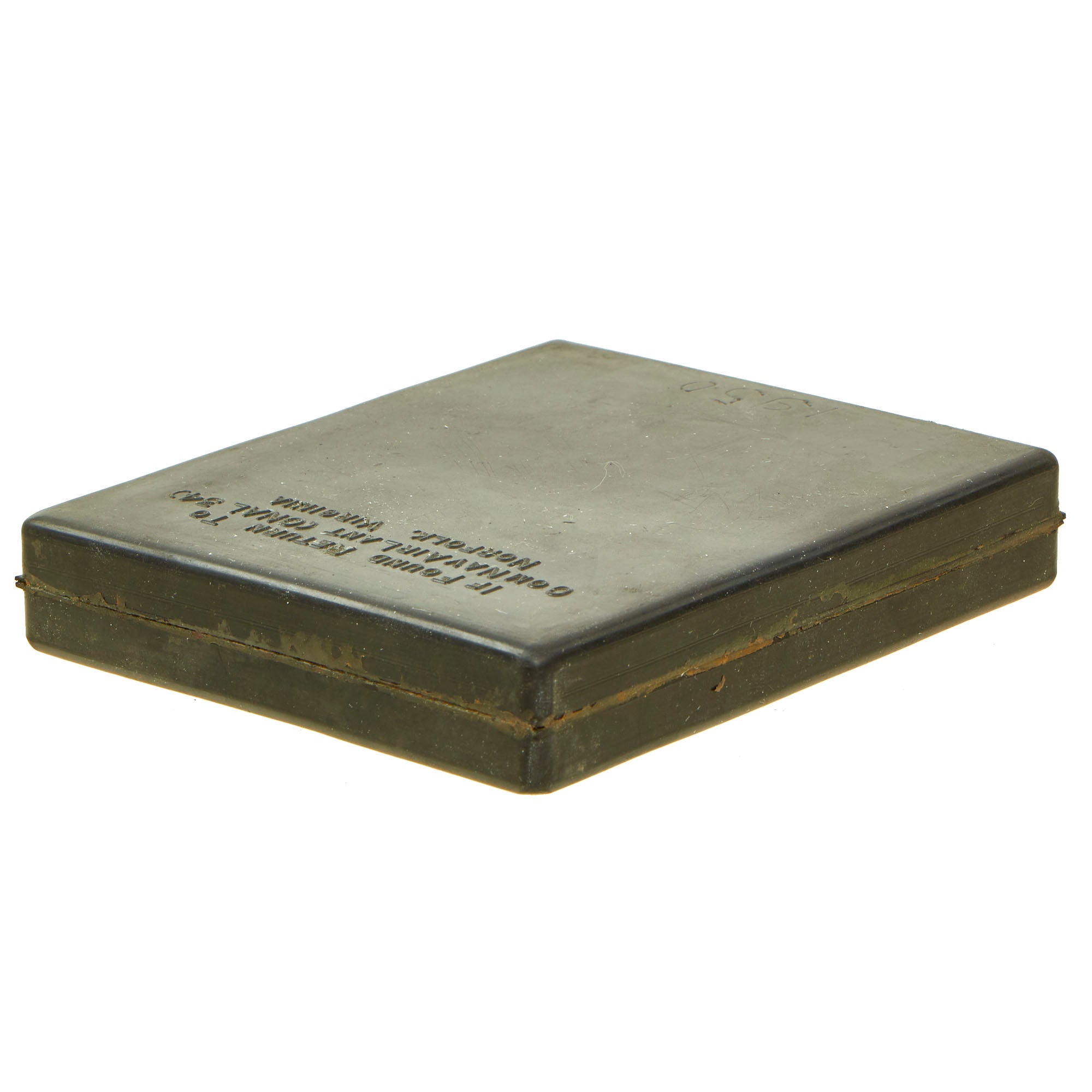 Issued to Navy pilots and aircrew, the Atlantic kits contained approximately .90 troy ounces of gold. The gold consists of 5 coins and three rings as follows: French 20 Franc, French 10 Franc, British Sovereign, 2 British Half Sovereigns, and 3 Gold Wedding Band Rings (two at 20K and one at 9K). All designed for military personnel caught behind enemy lines to use as barter, the outside of the kit reads IF FOUND RETURN TO COMNAVAIRLANT (ONAL 34) NORFOLK, VIRGINIA. All of this is contained in an individually numbered solid rubber block that measures 3-5/8" x 4-3/8". This sealed, never opened kit is serial number 1950. After an x-ray was performed on this particular kit to determine that it is complete and never tampered with you can even see the lead data plate inside the kit which clearly reads 1950. A printed copy of the x-ray will be included with the purchase of this kit. The number 1950 is also scratched into the rubber exterior which is correct for serial numbers 1000-1999. The value of the gold in today's market is approximately $1800.
