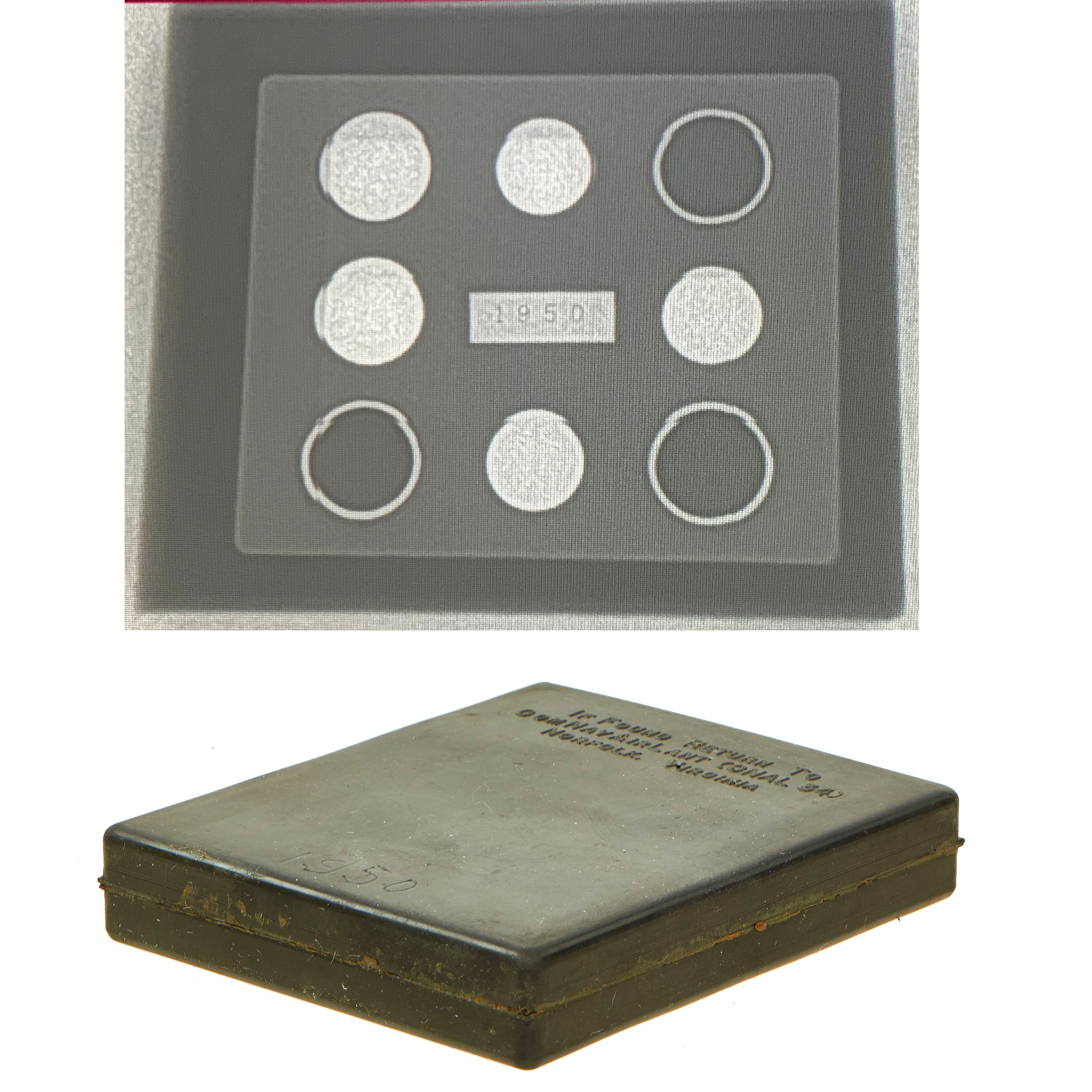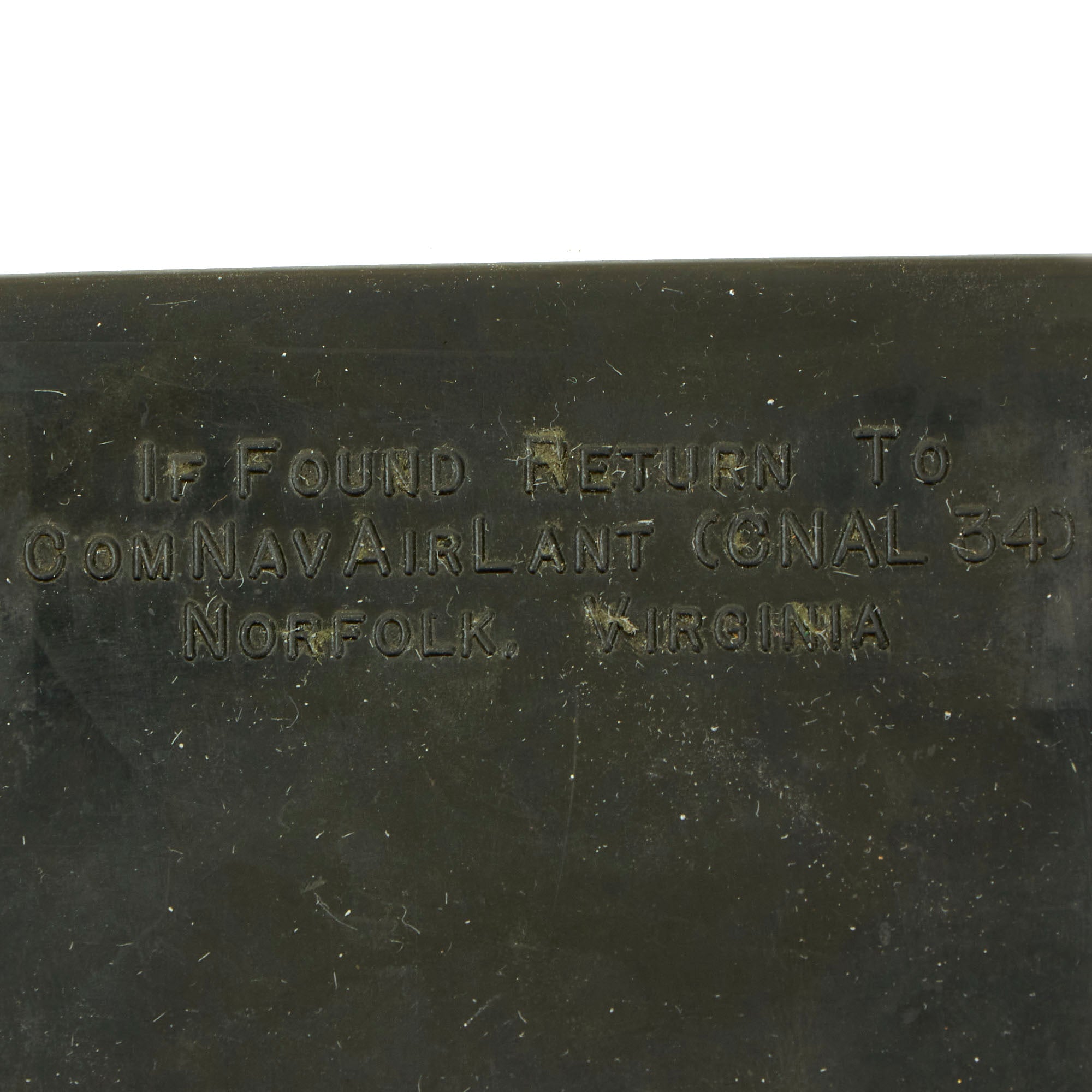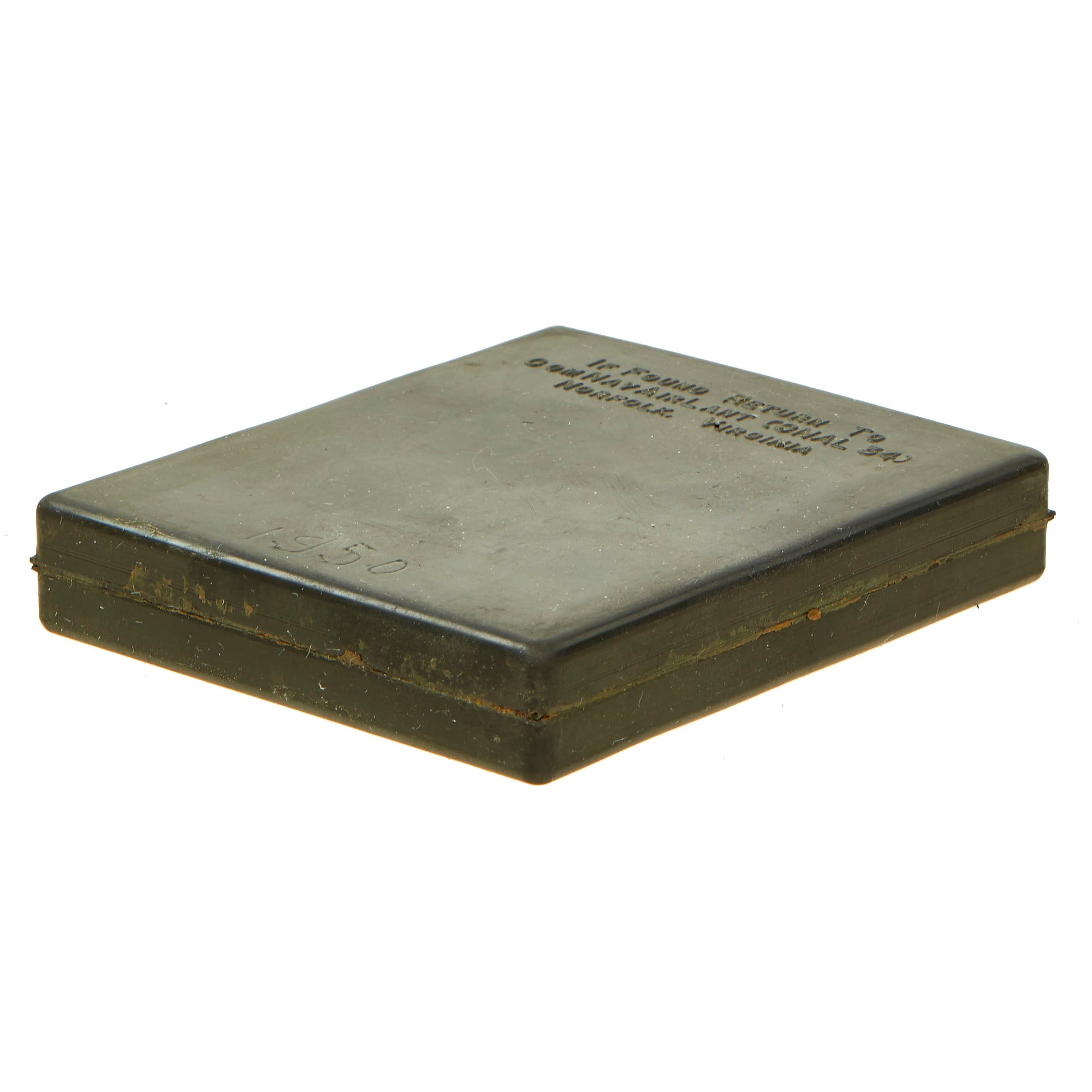 Issued to Navy pilots and aircrew, the Atlantic kits contained approximately .90 troy ounces of gold. The gold consists of 5 coins and three rings as follows: French 20 Franc, French 10 Franc, British Sovereign, 2 British Half Sovereigns, and 3 Gold Wedding Band Rings (two at 20K and one at 9K). All designed for military personnel caught behind enemy lines to use as barter, the outside of the kit reads IF FOUND RETURN TO COMNAVAIRLANT (ONAL 34) NORFOLK, VIRGINIA. All of this is contained in an individually numbered solid rubber block that measures 3-5/8" x 4-3/8". This sealed, never opened kit is serial number 1950. After an x-ray was performed on this particular kit to determine that it is complete and never tampered with you can even see the lead data plate inside the kit which clearly reads 1950. A printed copy of the x-ray will be included with the purchase of this kit. The number 1950 is also scratched into the rubber exterior which is correct for serial numbers 1000-1999. The value of the gold in today's market is approximately $1800.