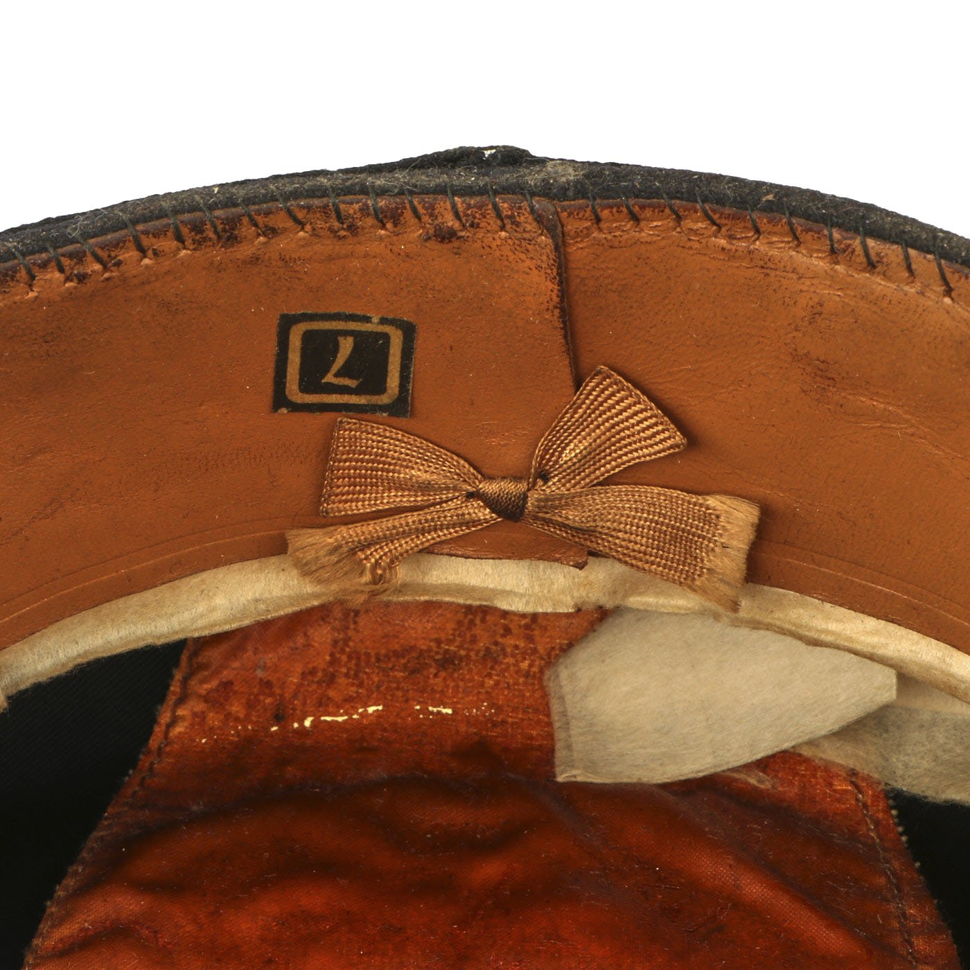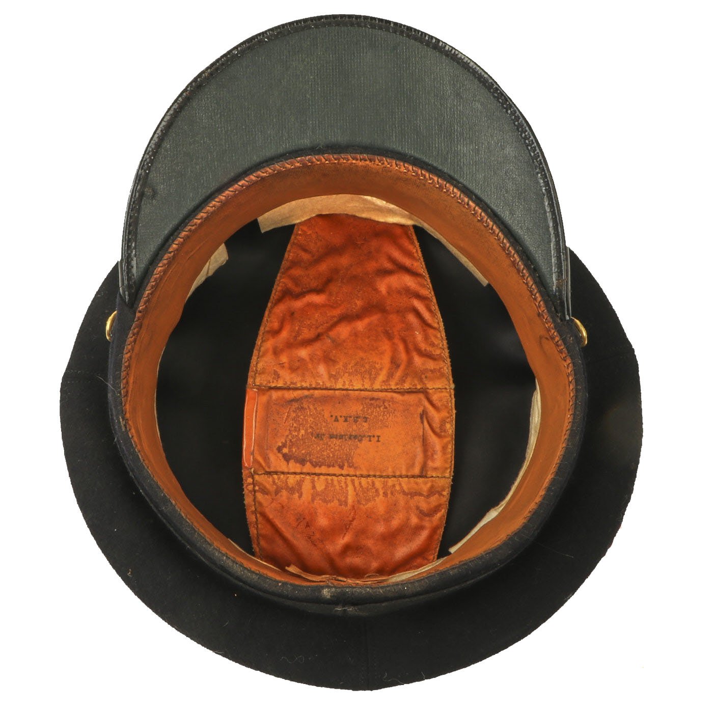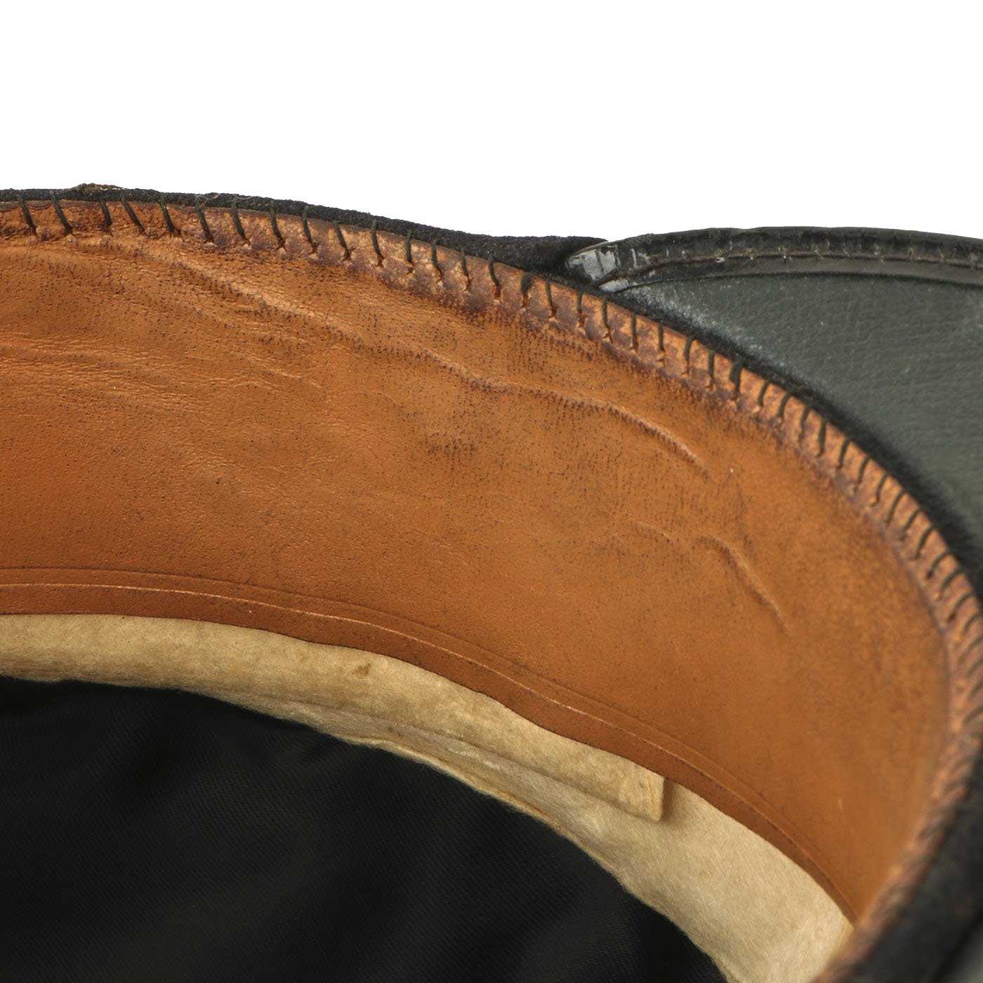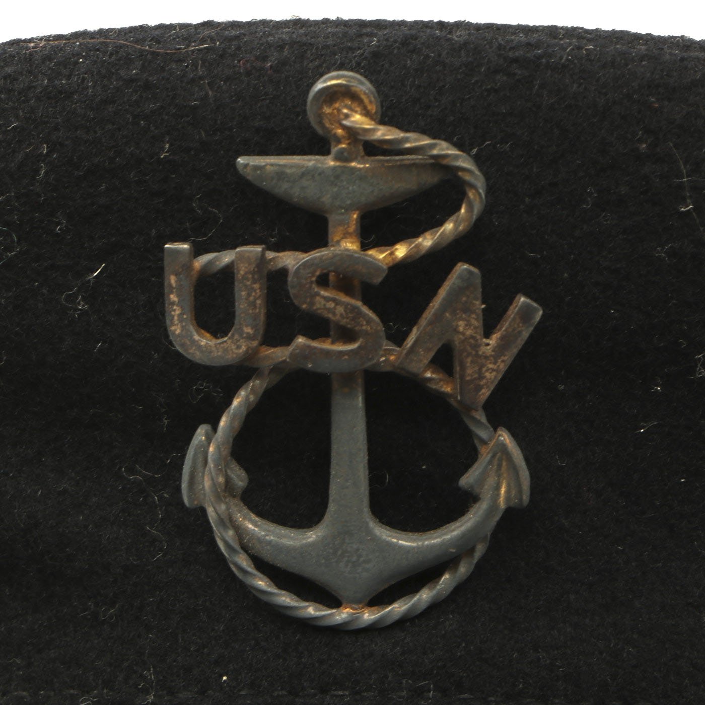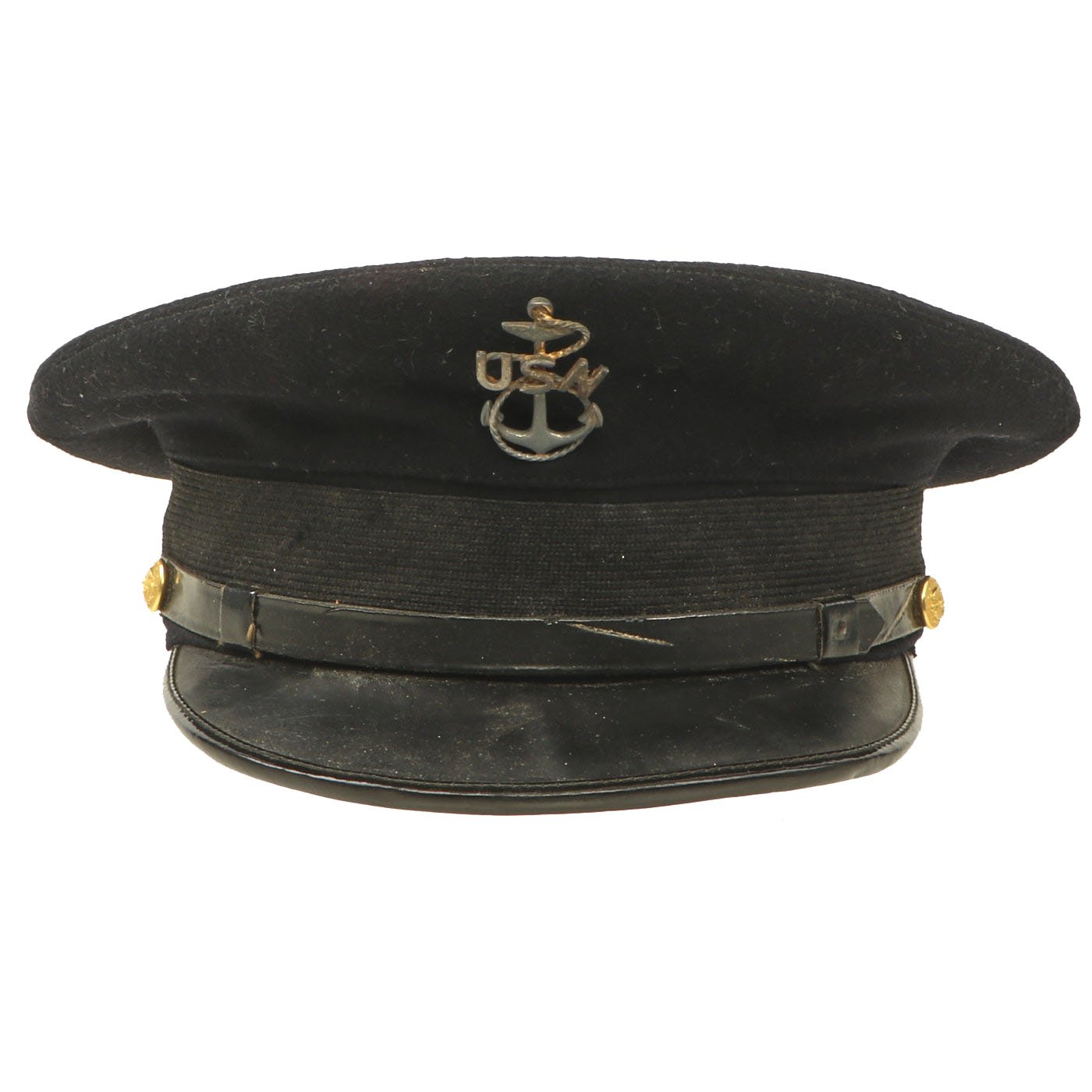 Original Item: Only One Available. Regulation WWII era U.S. Navy Cap issued for a USN Chief Petty Officer. Constructed of navy blue wool in Size 7. Features a wicker frame with leather sweatband and pin back CPO badge. Offered in very good condition with little wear. Named on the crown.