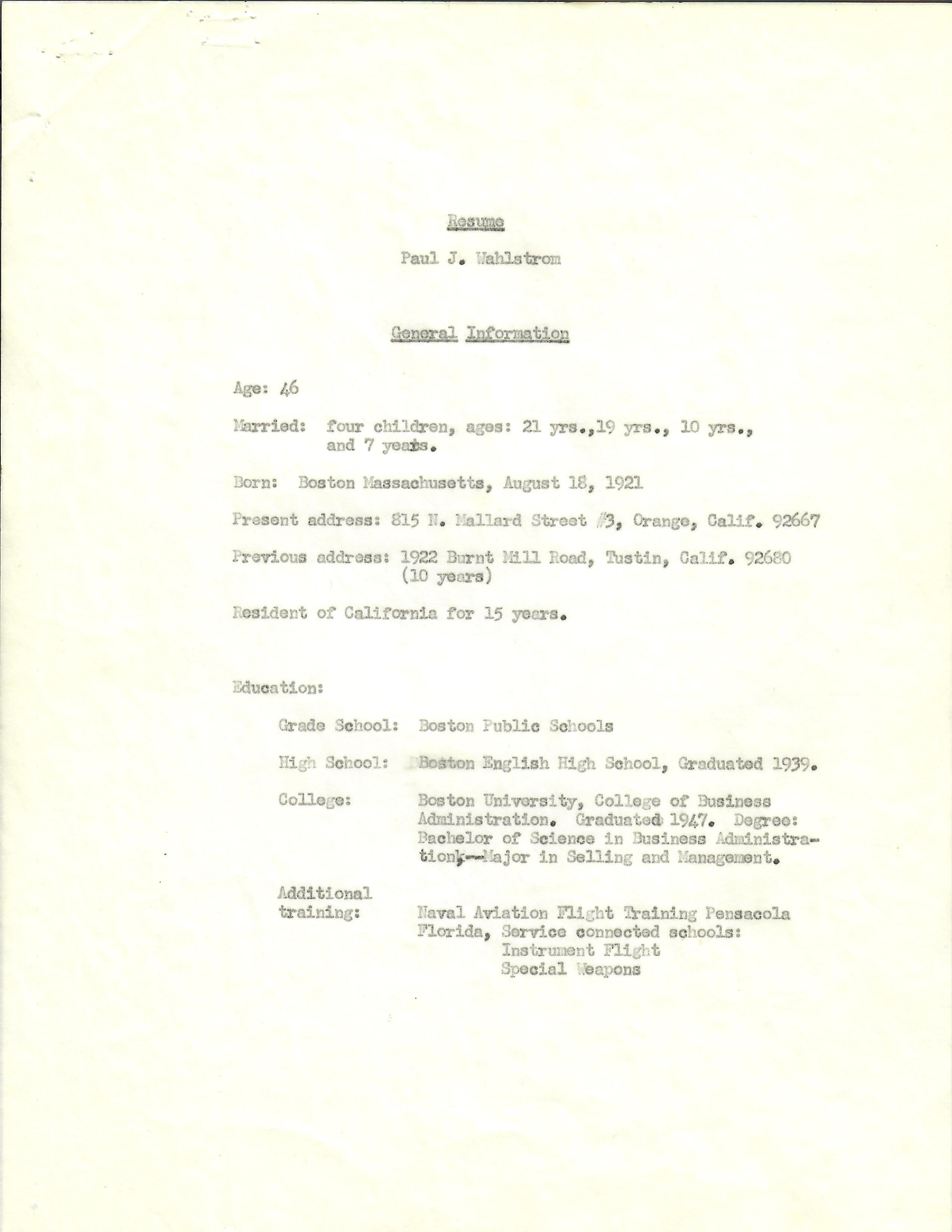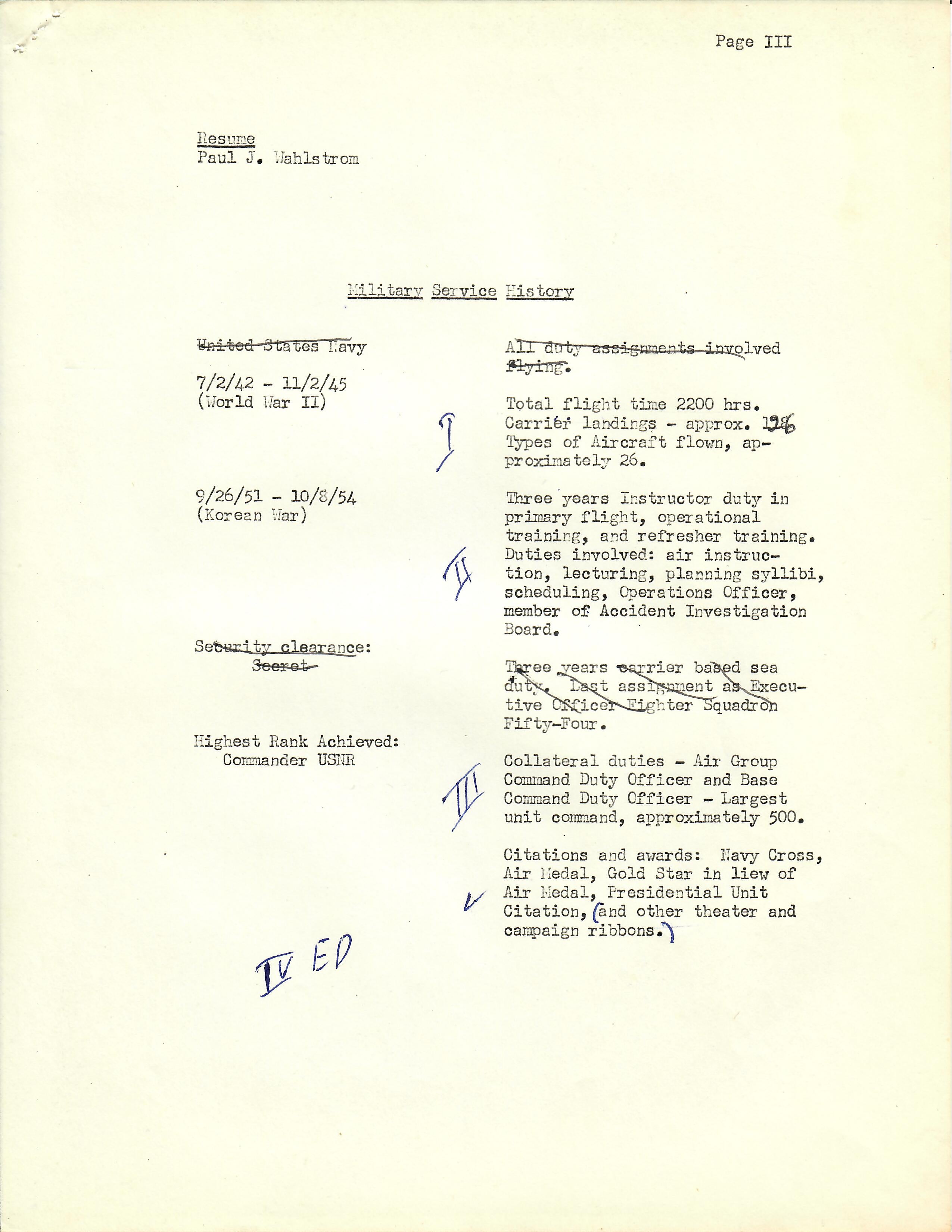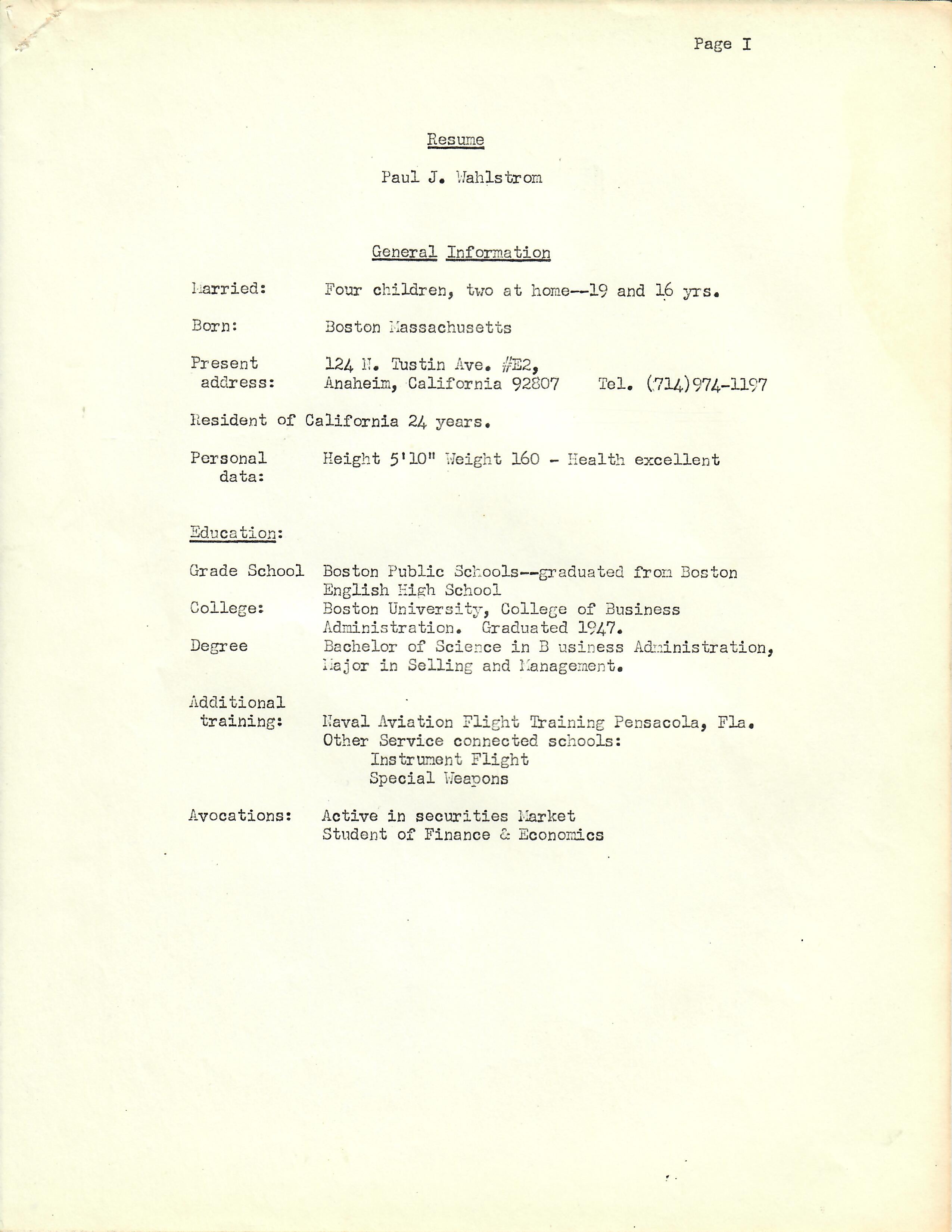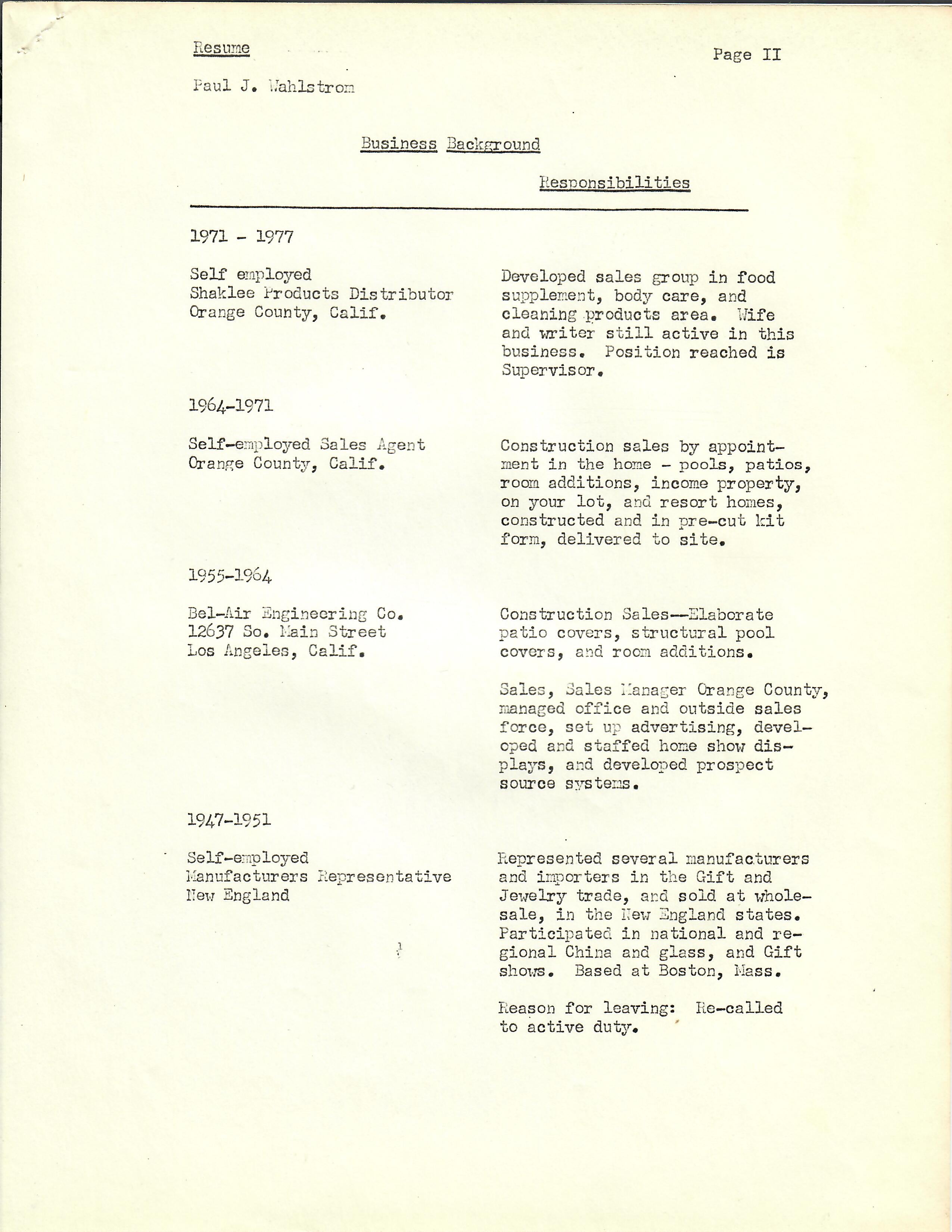 Other items are his personal resumes from the late 40s up into the 70s and letters from a friend to a Congressman concerned about Wahlstrom’s homelessness and living out of his car.