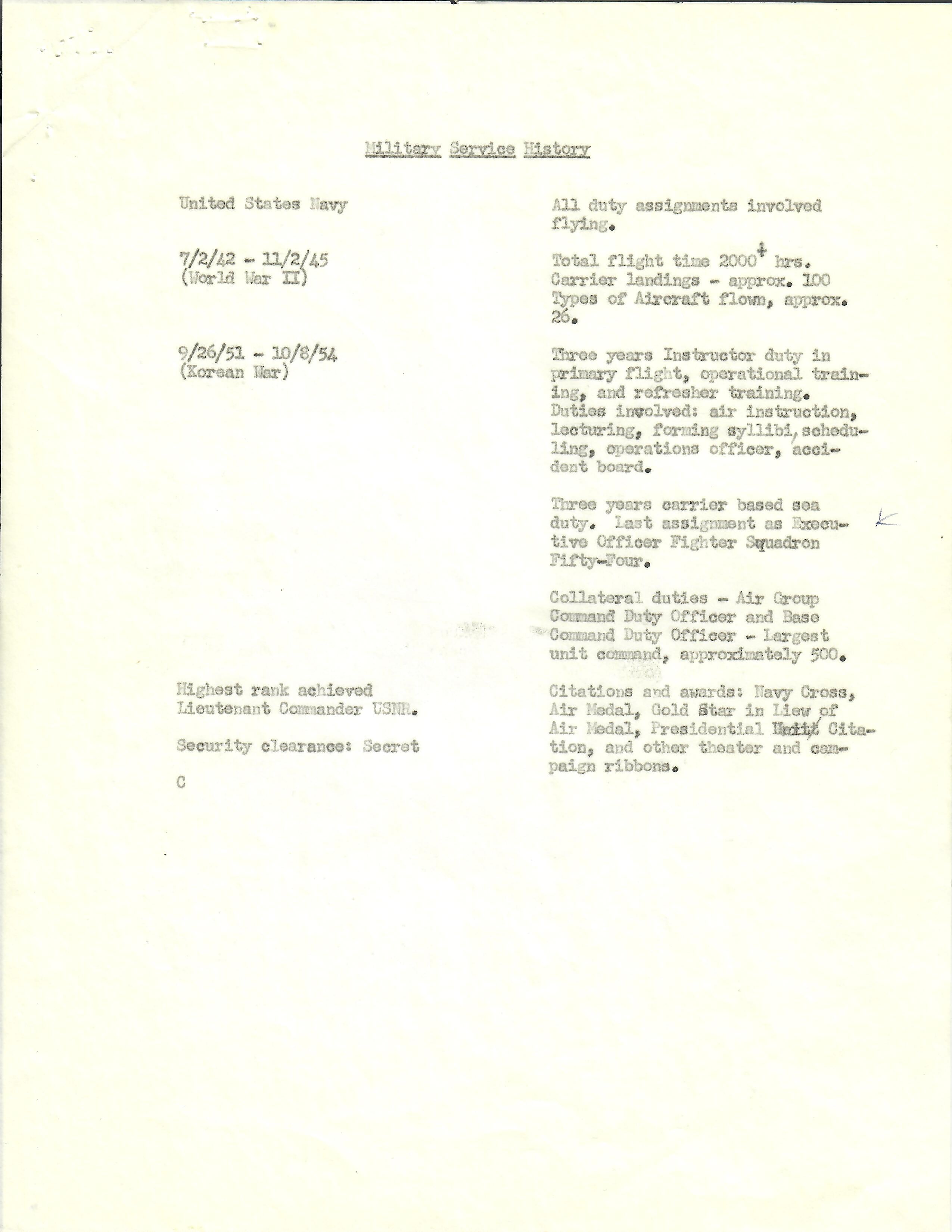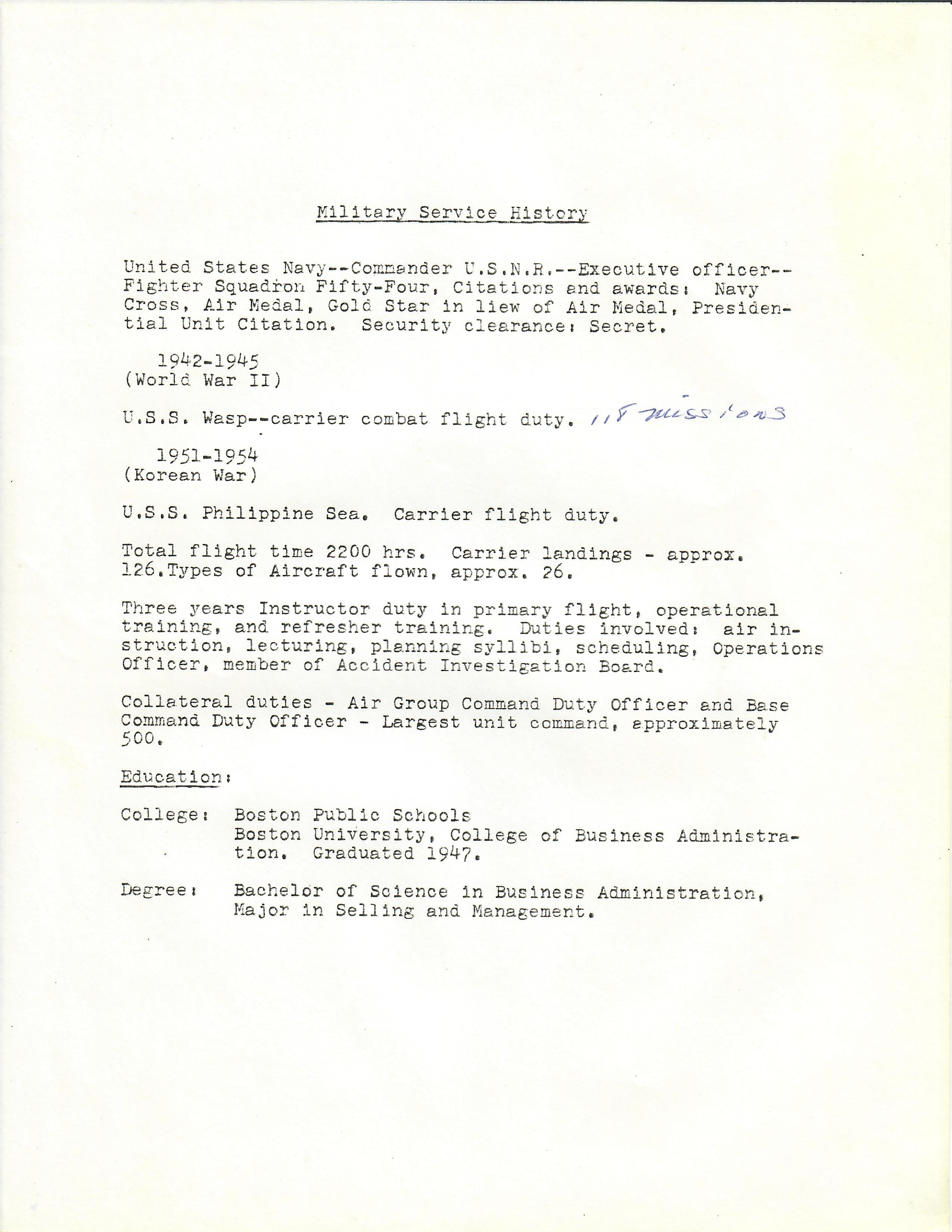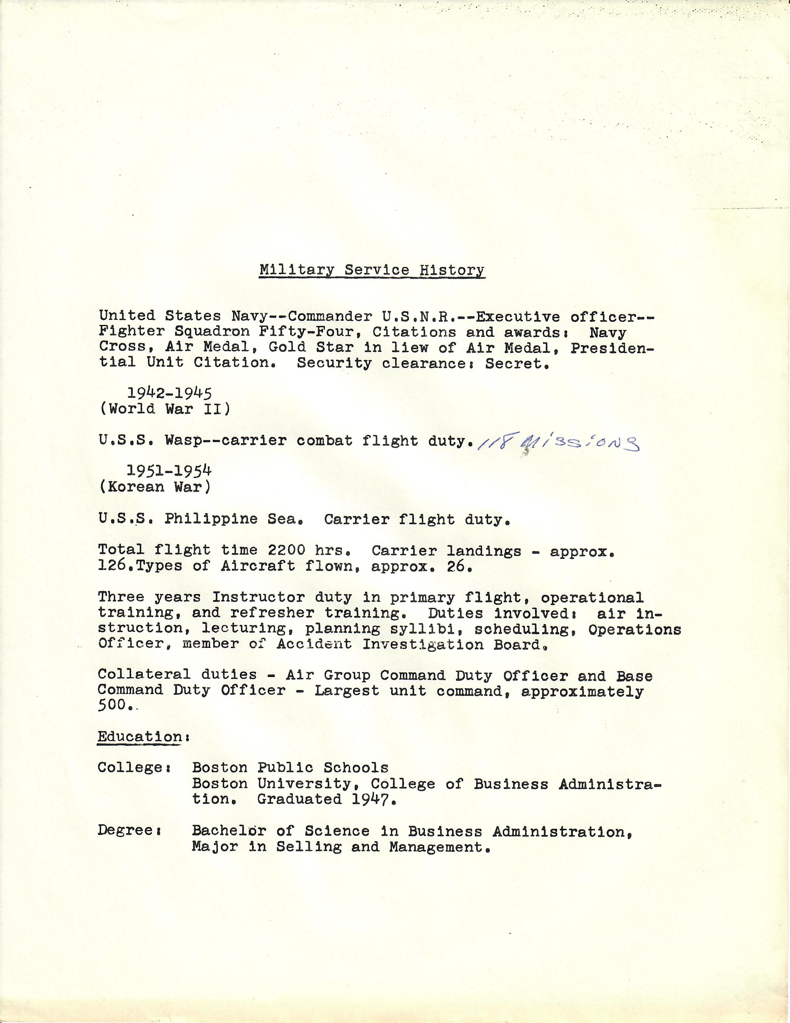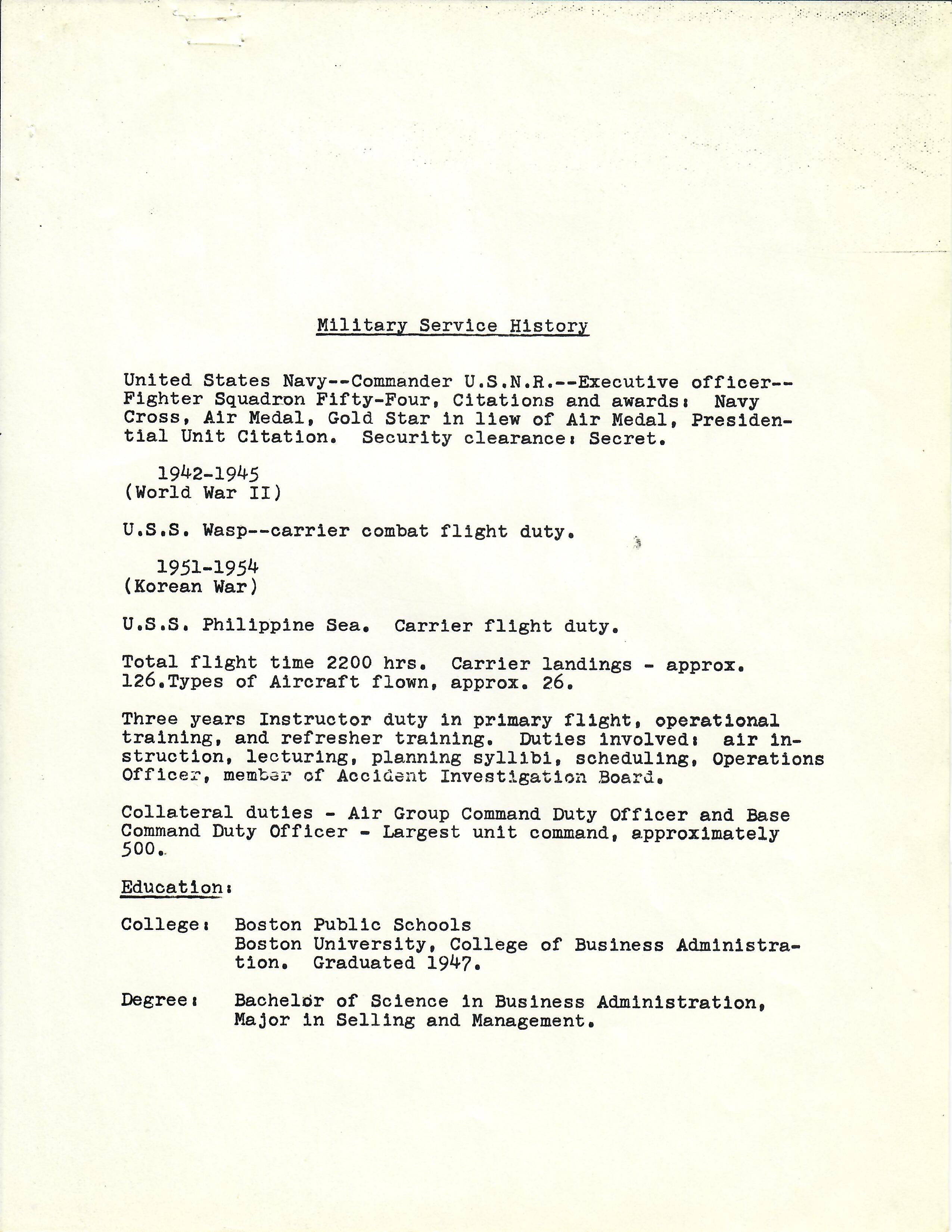 This grouping contains a lot of documents, resumes and biographies that document his incredible military service, which carried on into the Korean War as well. During WWII he served from July 2, 1942 to November 11, 1945 with all of his duty assignments involving flying. His total flight time during the war was over 2,200 hours with over 118 carrier landings! This was a man that appears to have spent more time in the air than on the ground during his career. Over the course of the war he was qualified to fly approximately 26 types of aircraft, which in itself is amazing. Most impressively he was credited with a sinking of a Japanese Aircraft carrier on February 17th, 1945 for which he was awarded the Navy Cross. A copy of the original citation is included with this grouping.