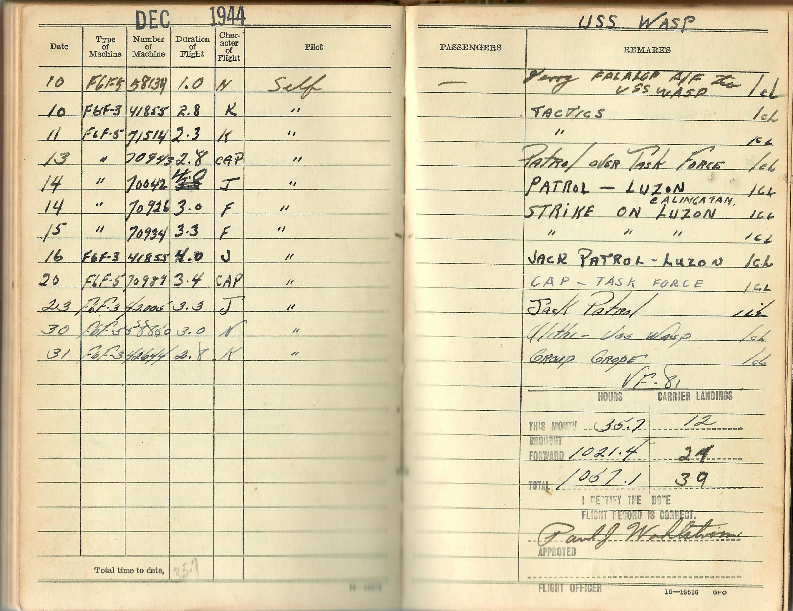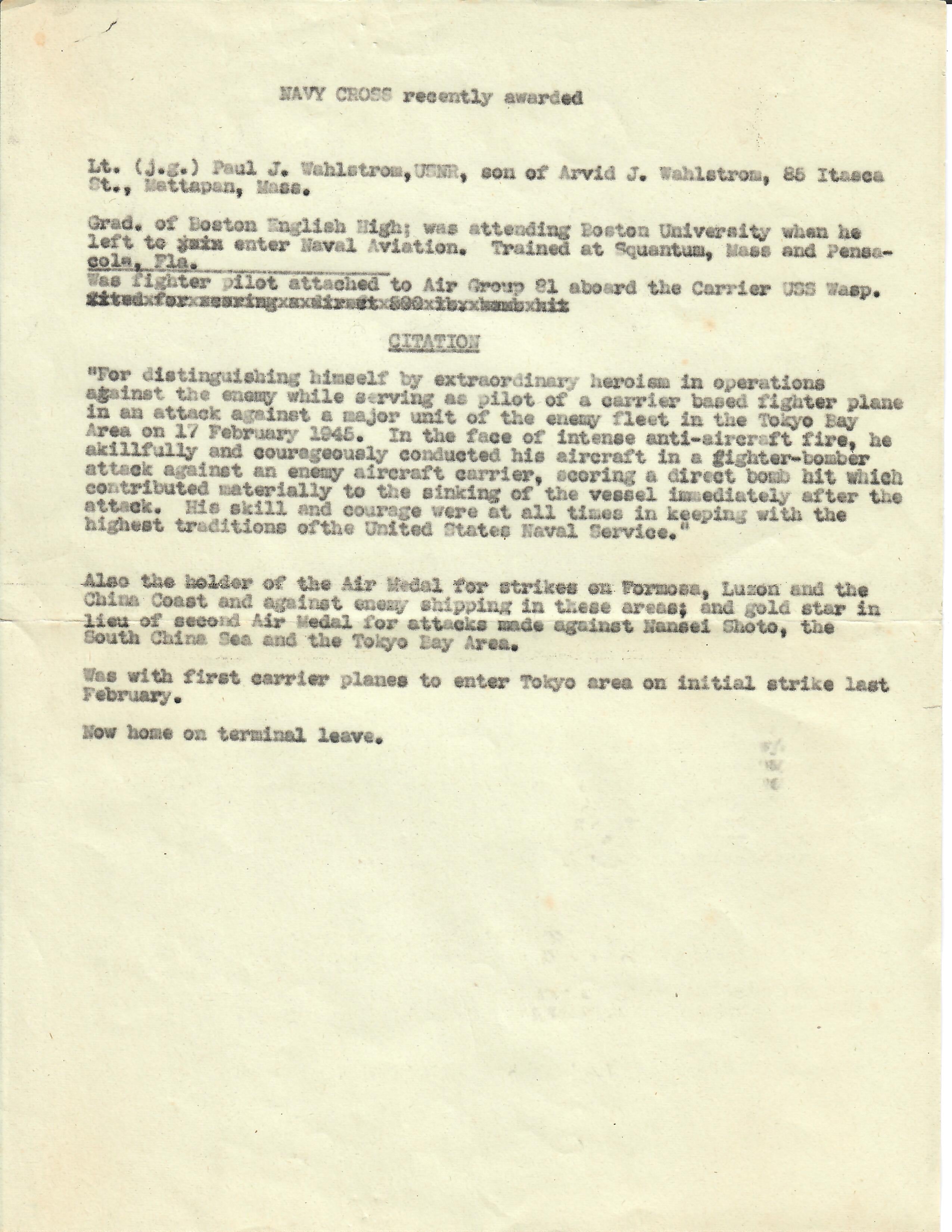 The President of the United States of America takes pleasure in presenting the Navy Cross to Lieutenant, Junior Grade Paul Johan Wahlstrom (NSN: 0-250882), United States Naval Reserve, for extraordinary heroism in operations against the enemy while serving as Pilot of a carrier-based Navy Fighter Plane in Fighting Squadron EIGHTY-ONE (VF-81), attached to the U.S.S. WASP (CV-18), in an attack against a major unit of the enemy Fleet in the Tokyo Bay Area, on 17 February 1945. In the face of intense anti-aircraft fire, Lieutenant, Junior Grade, Wahlstrom skillfully and courageously conducted his aircraft in a fighter-bomber attack against an enemy aircraft carrier, scoring a direct bomb hit which contributed materially to the sinking of the vessel immediately after the attack. His outstanding courage and determined skill were at all times inspiring and in keeping with the highest traditions of the United States Naval Service.