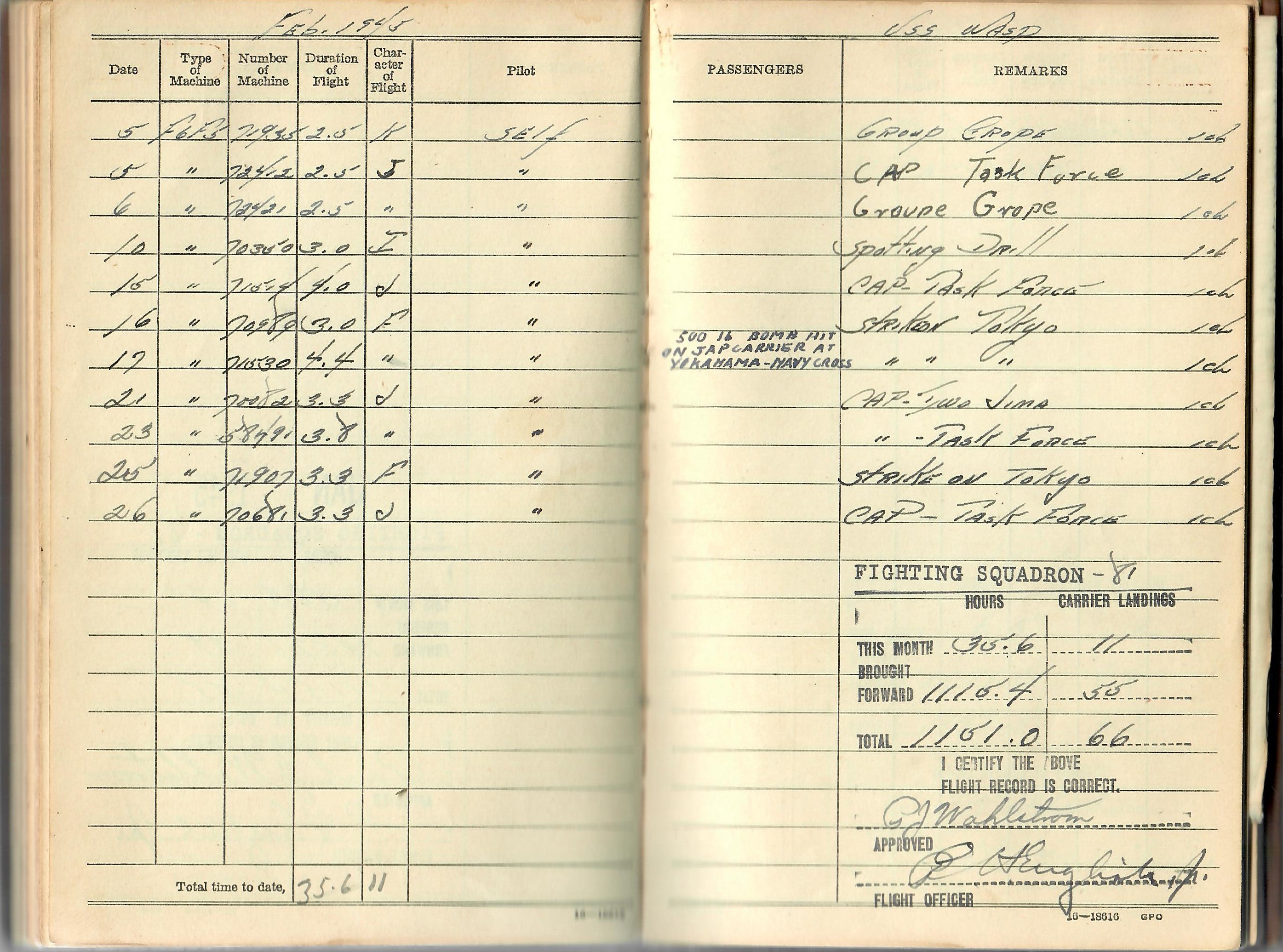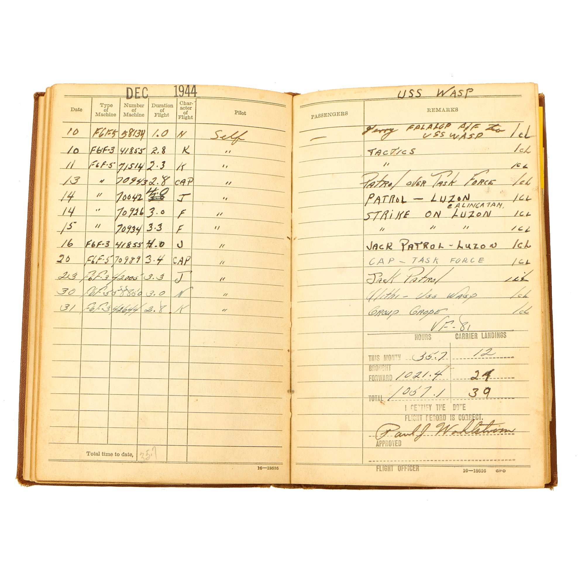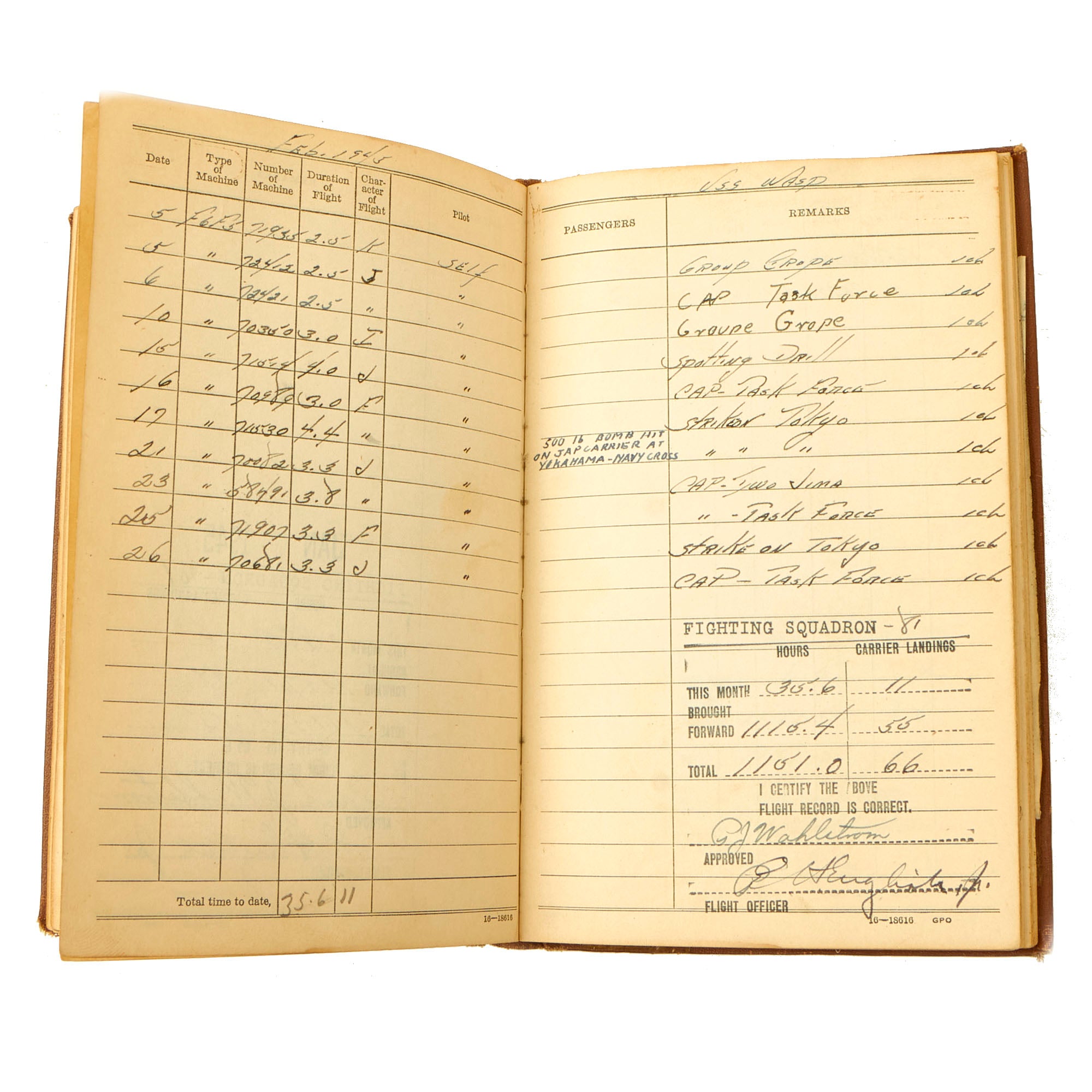 Original Items: Only One Grouping Available. Now this is a spectacular grouping of items. These items belonged to Lieutenant Junior Grade Paul Johan Wahlstrom USNR who received a Navy Cross for sinking a Japanese Aircraft Carrier during an attack against a major unit of the Japanese Fleet in the Tokyo Bay area on February 17, 1945. LTJG Wahlstrom served during WWII with the Fighting Squadron 81 (VF-81) while attached to the carrier USS WASP (CV-18).