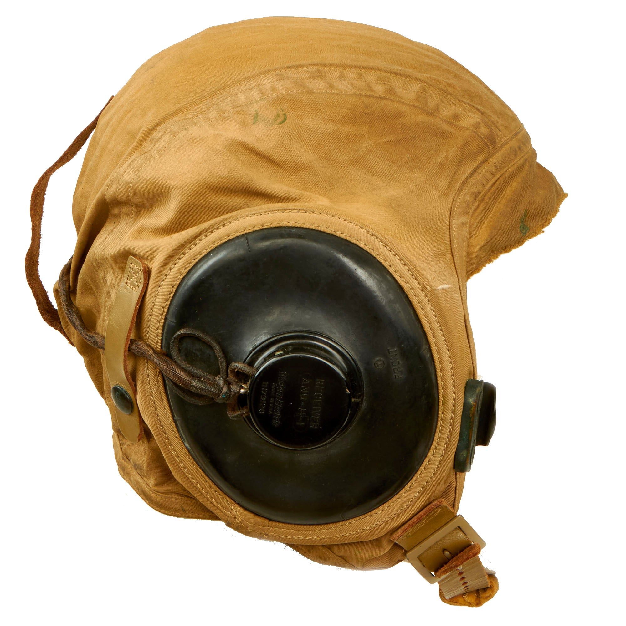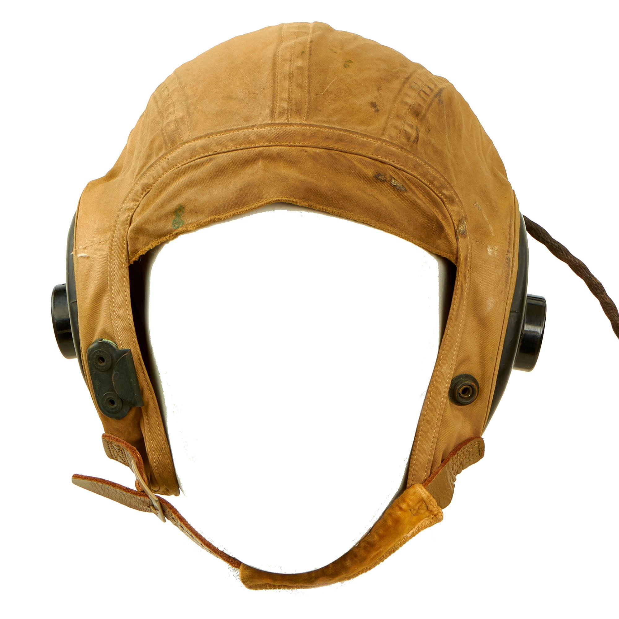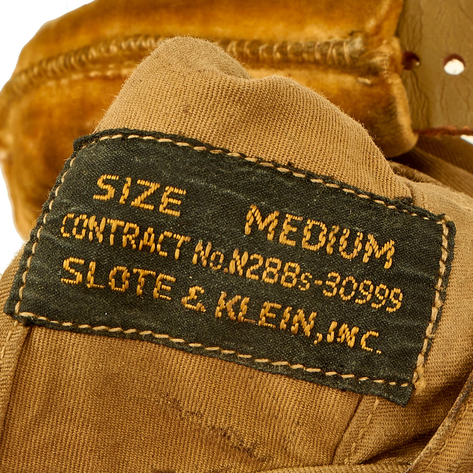 - U.S. Navy WWII Medium N288s-27405 Summer Flight Helmet by Slote & Klein: This is a very nice flight helmet set, which was exactly what Aviators of the U.S. Navy used during WWII. The helmet is a very nice khaki tan canvas "summer weight" style, and has a nice chamois lined "visor" and ear cups. The chin strap is still intact with the retaining buckle still retained. It still has the original maker label at the rear.