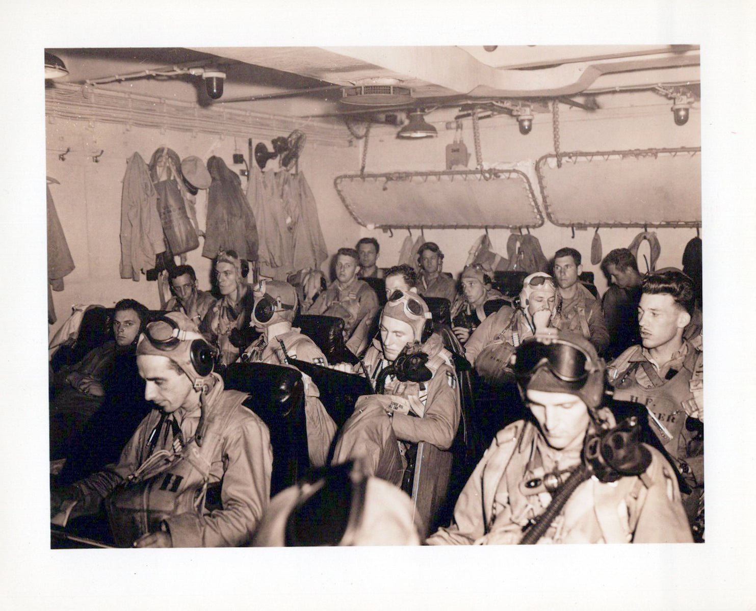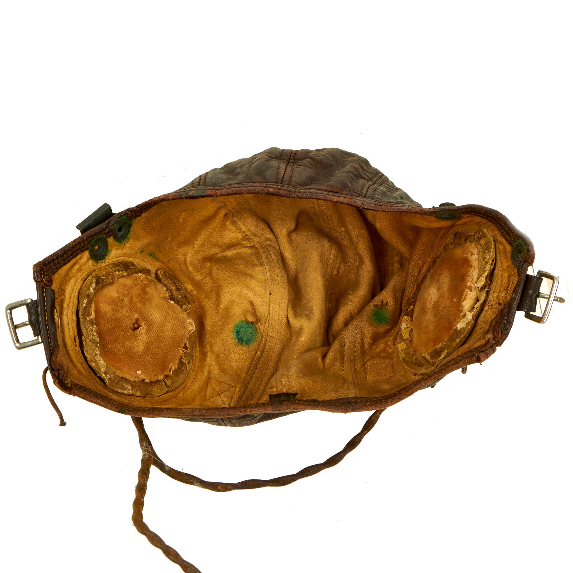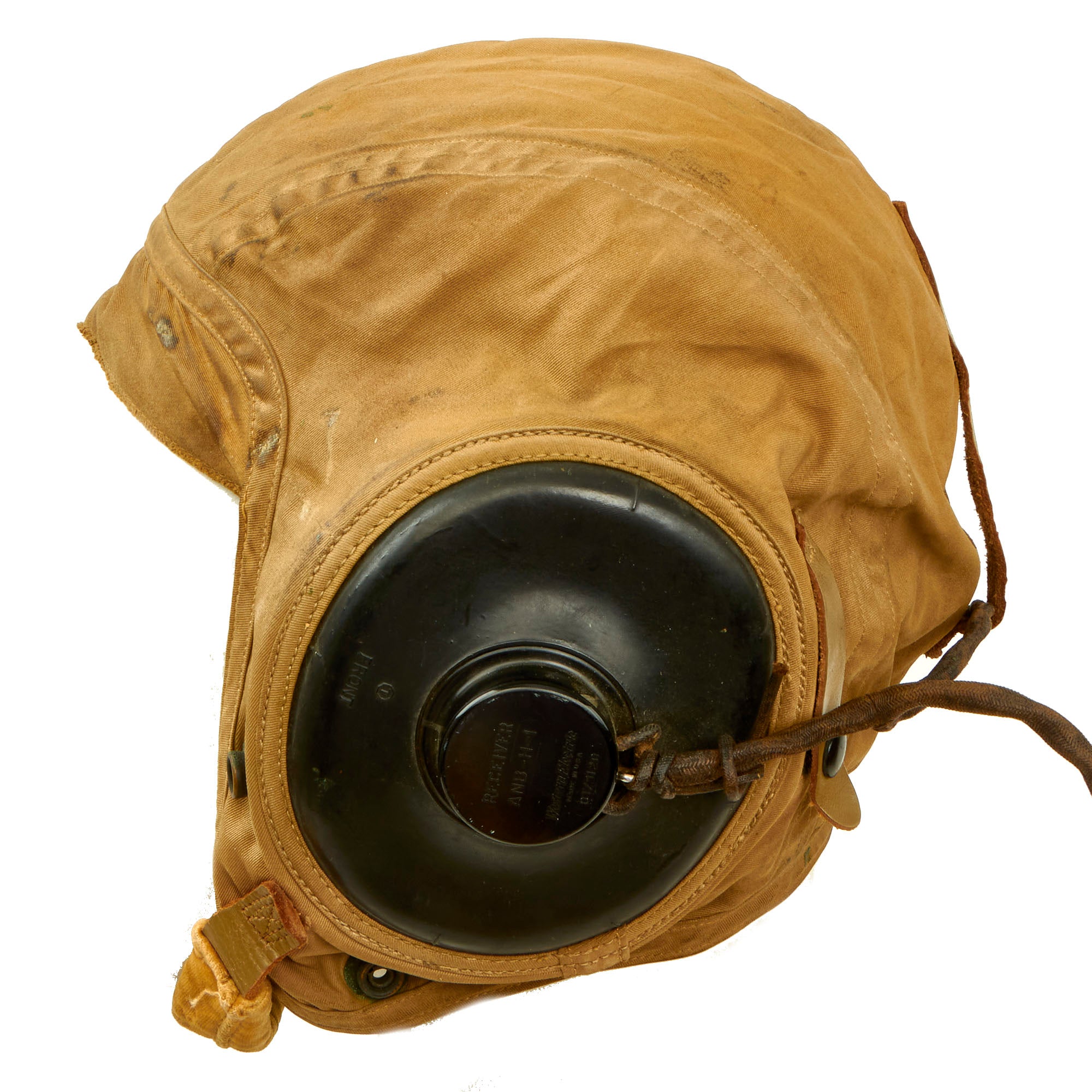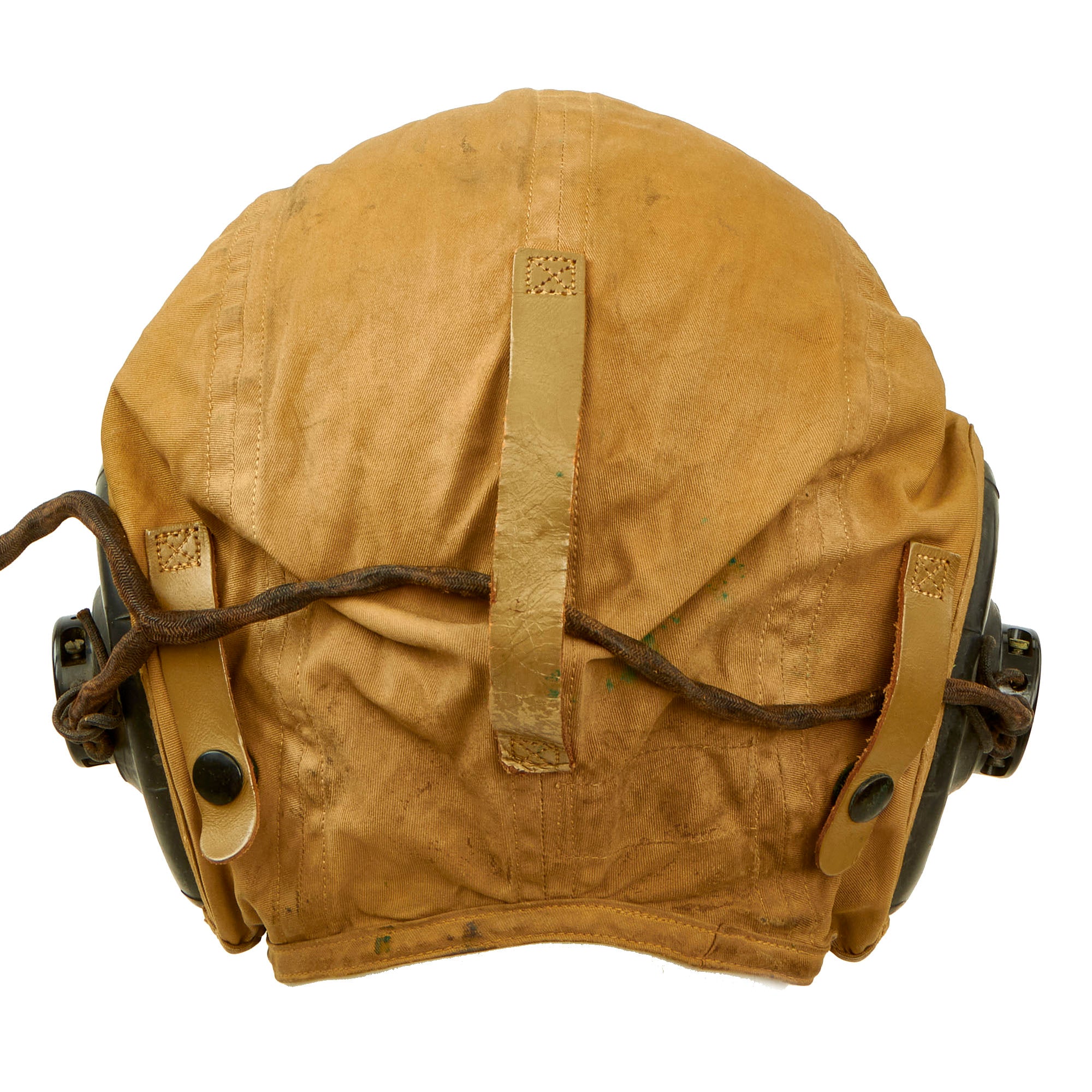 - U.S. Navy WWII Medium N288s-27405 Summer Flight Helmet by Slote & Klein: This is a very nice flight helmet set, which was exactly what Aviators of the U.S. Navy used during WWII. The helmet is a very nice khaki tan canvas "summer weight" style, and has a nice chamois lined "visor" and ear cups. The chin strap is still intact with the retaining buckle still retained. It still has the original maker label at the rear.