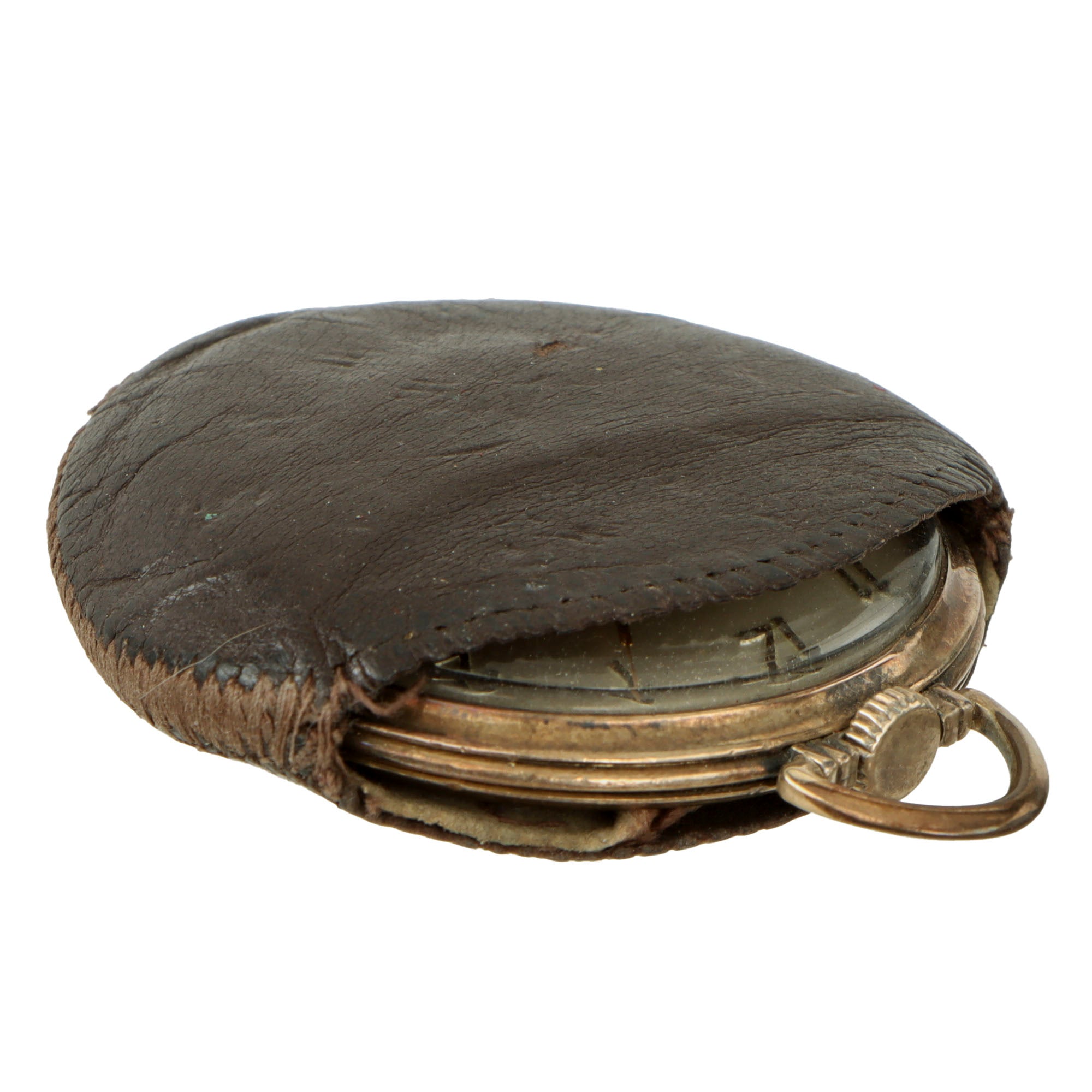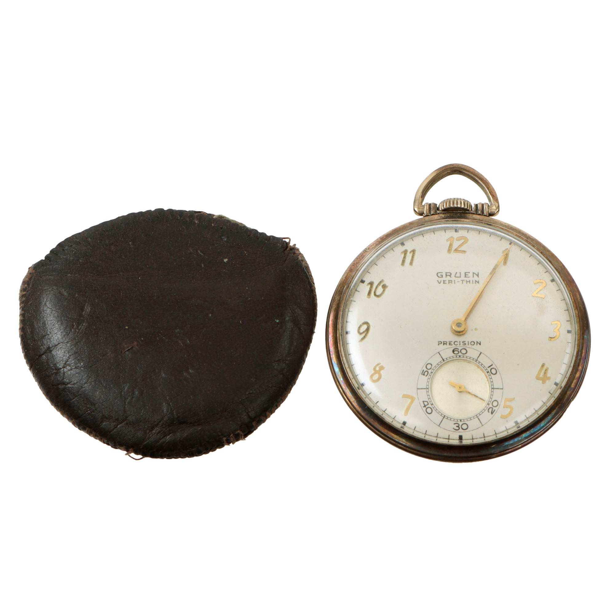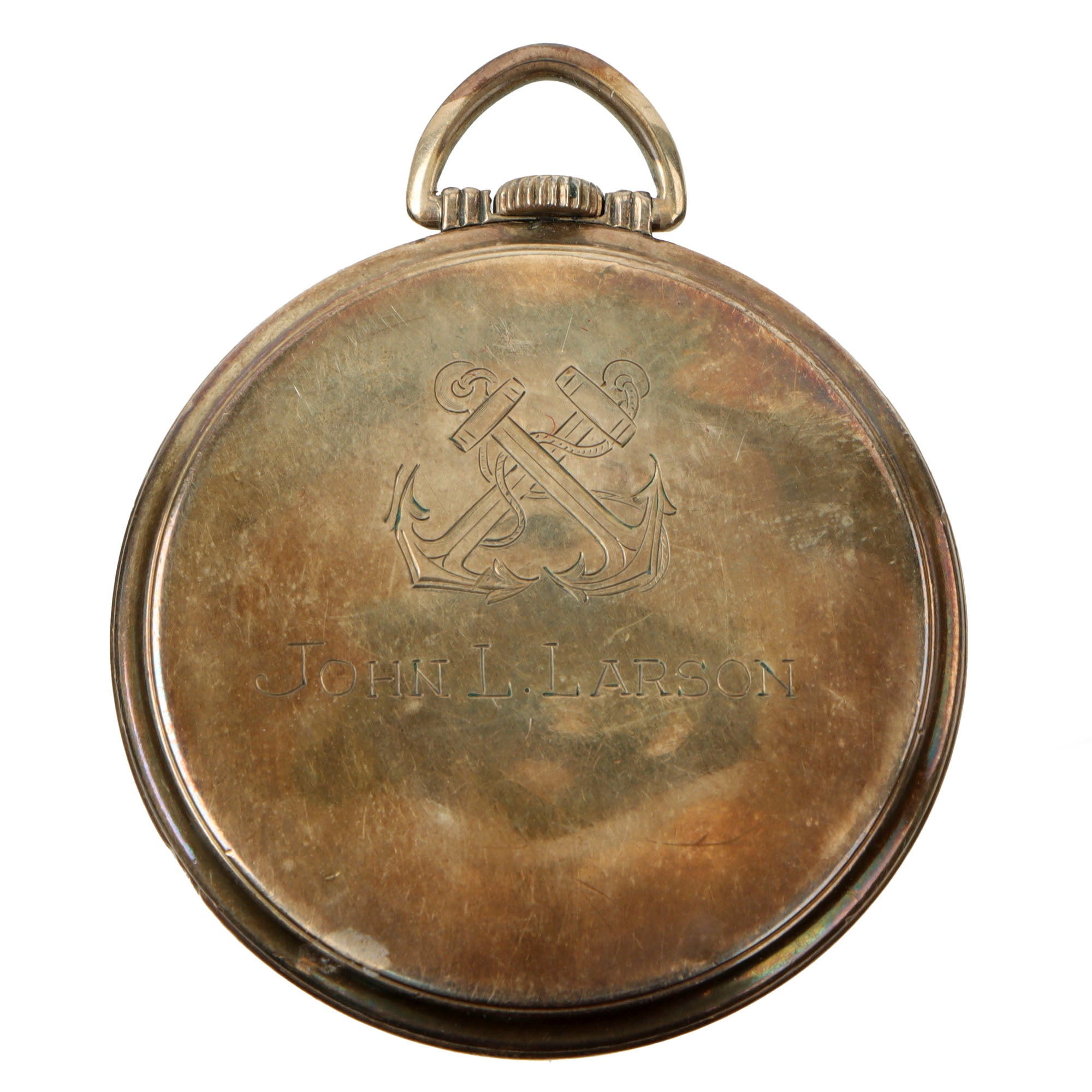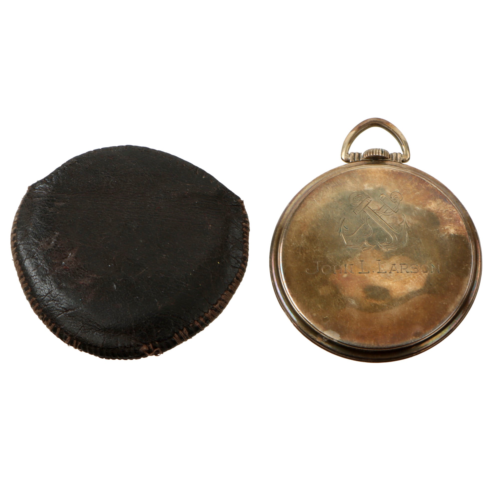 The pocket watch comes in its original small leather pouch, and is a Precision watch by Gruen, marked Veri-Thin. The back of the watch has engraved crossed anchors over JOHN L. LARSON. The watch still works, although we cannot guarantee it will continue to work.