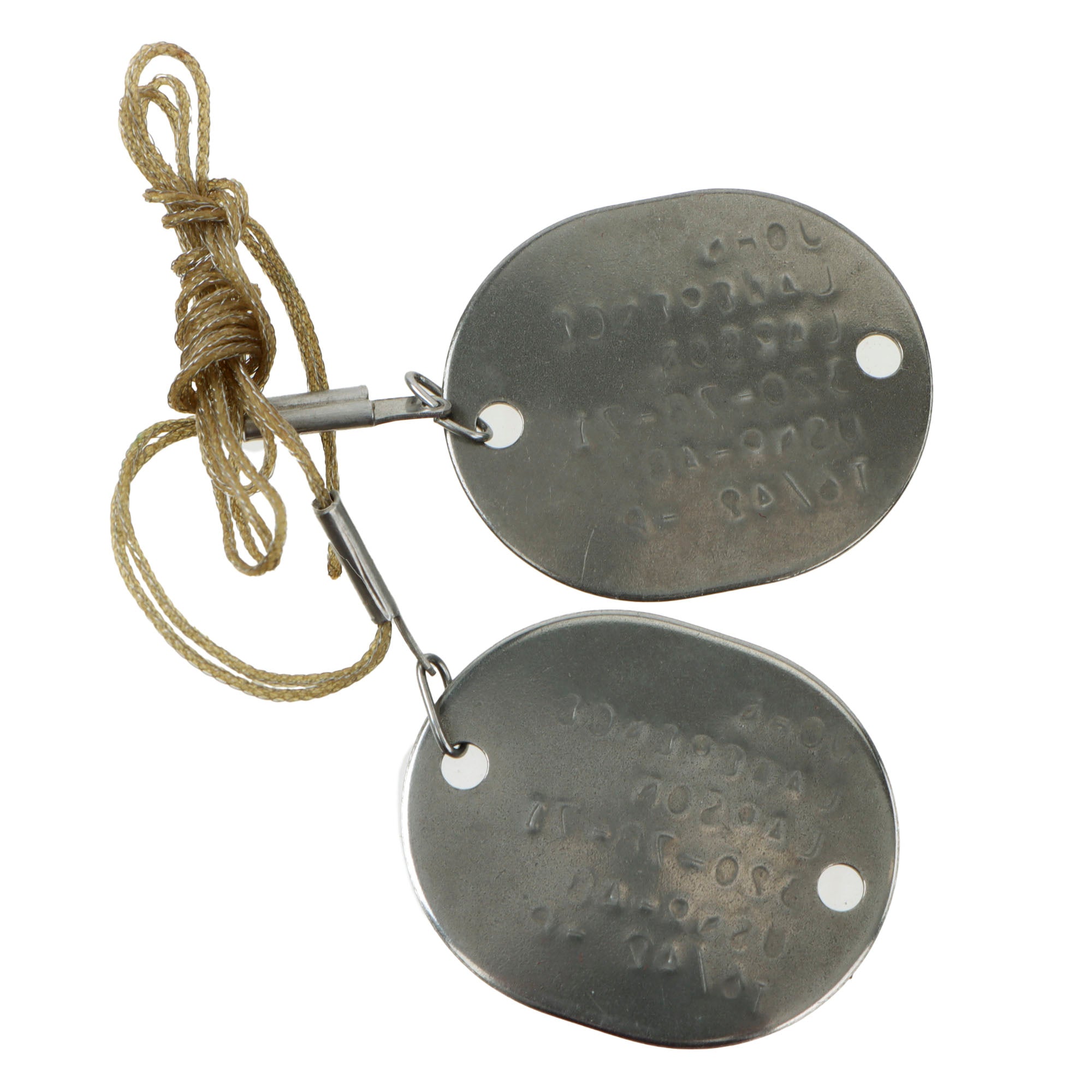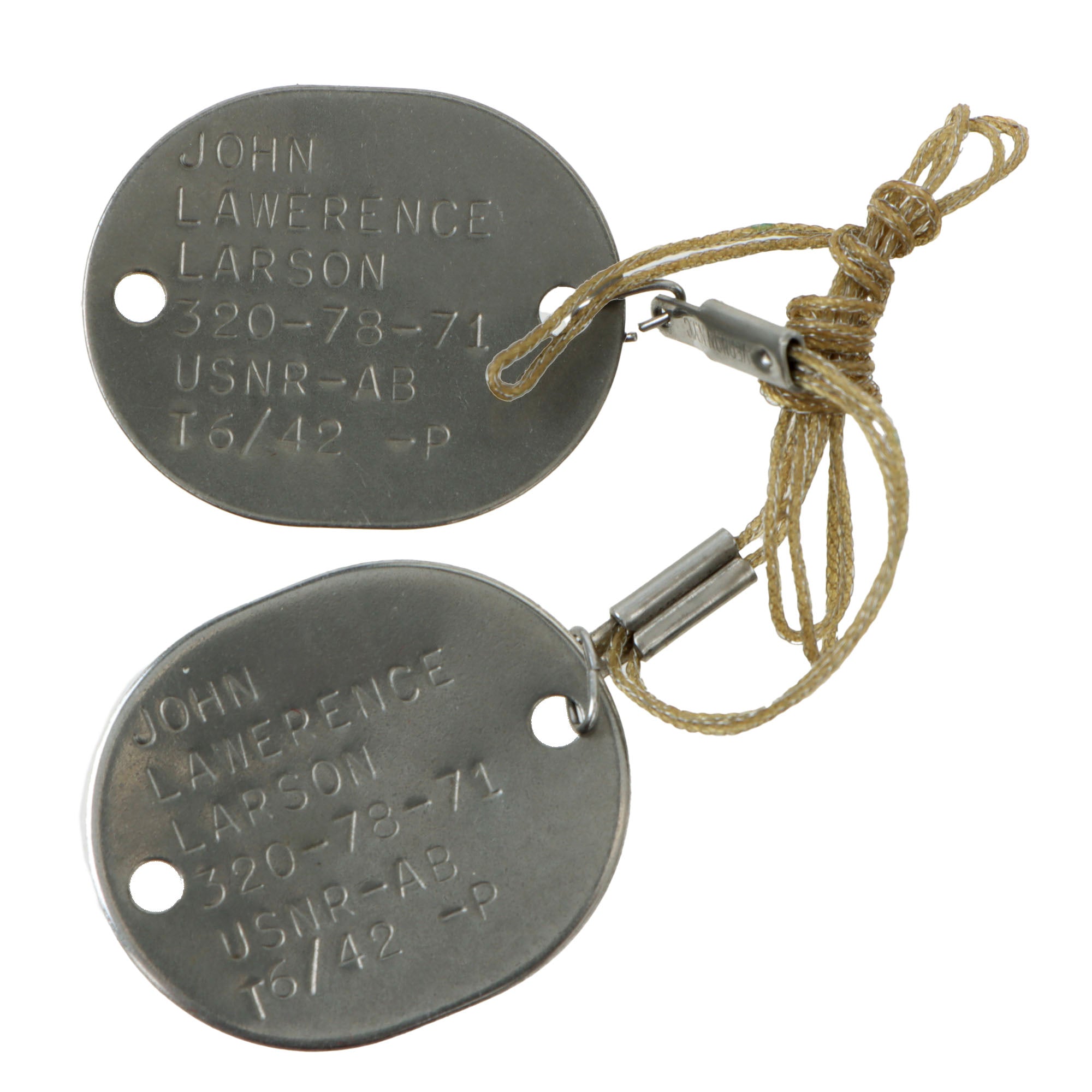 The dog tags are retained on their original braided cord, and show his serial number as 320-78-71, and is marked USNR-AB / TG/42-P.