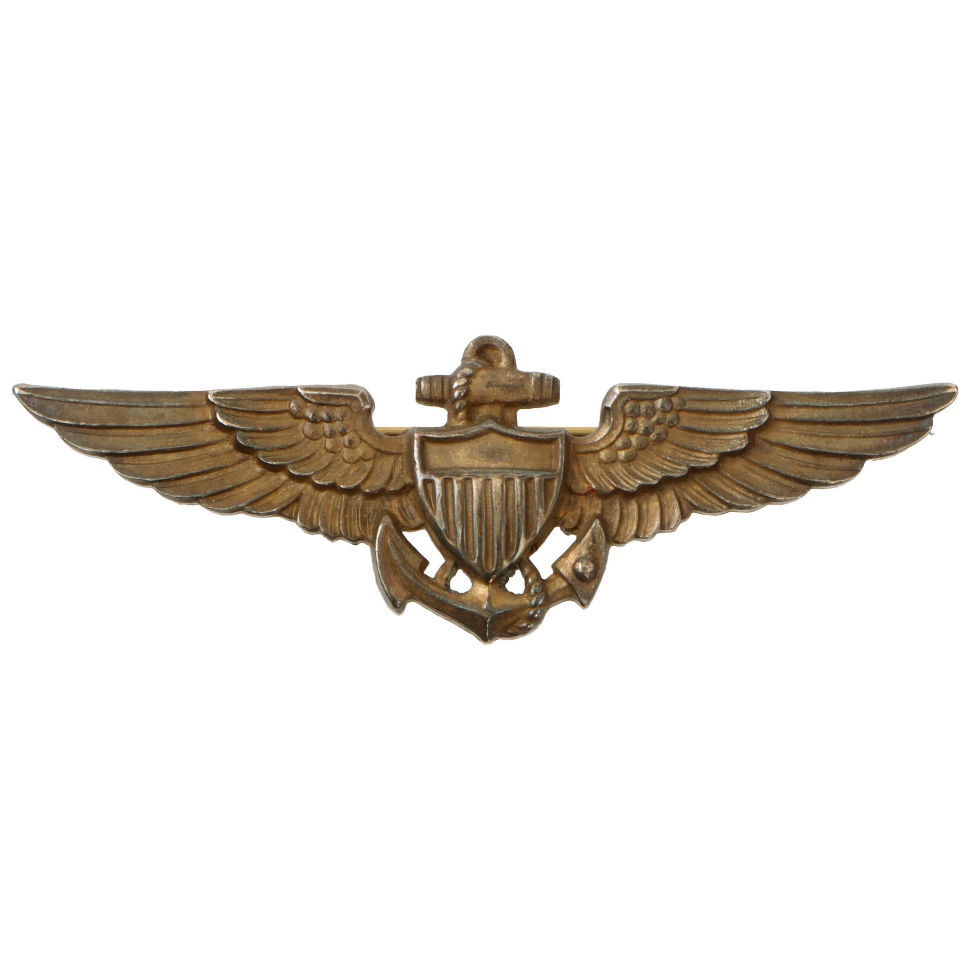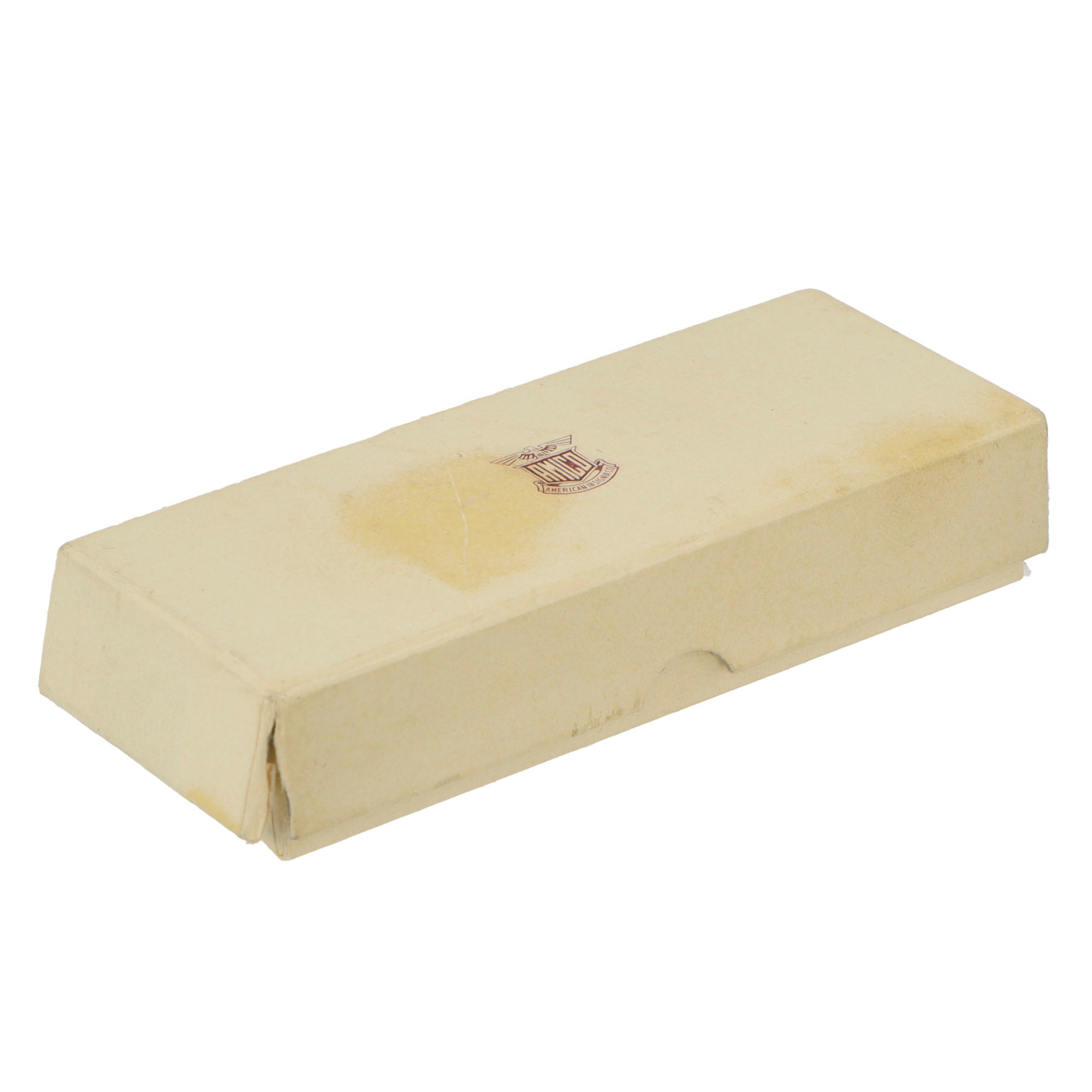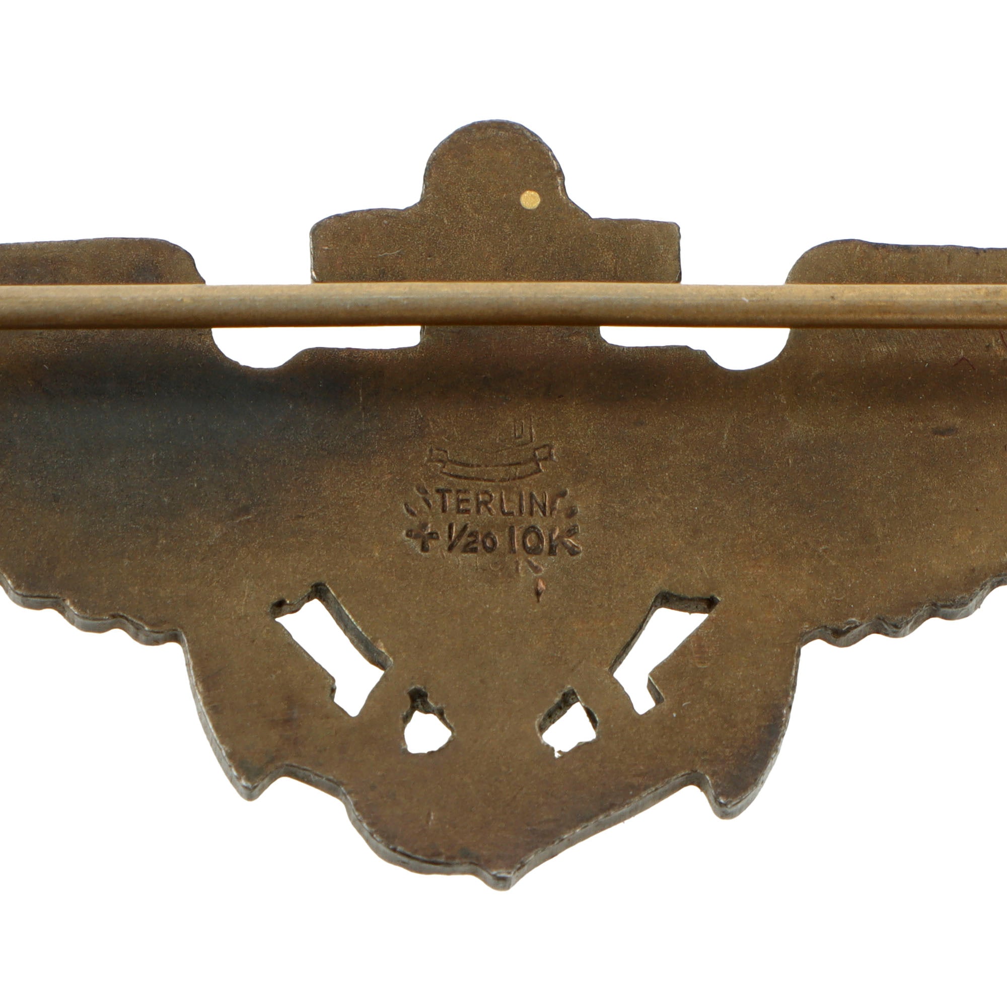 The pilot’s wings come in their original case by American Insignia Co. They are marked STERLING + 1/20 10K. The case is damaged with tears along the edges.