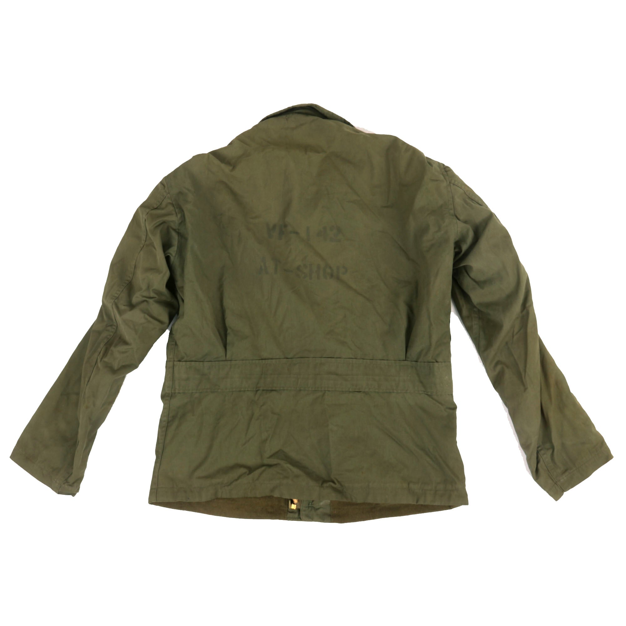 Original Item. Only One Available. This is a great 1944-contract dated Navy deck jacket with unit markings on the back for the A.T. Shop (electronic maintenance) of Fighter Squadron VF-142, the Ghostriders. VF-142 was established on on 24 August 1948 as VF-193, and wasn’t redesignated as VF-142 until 15 October 1963, meaning this jacket was most likely used into the 1960s.