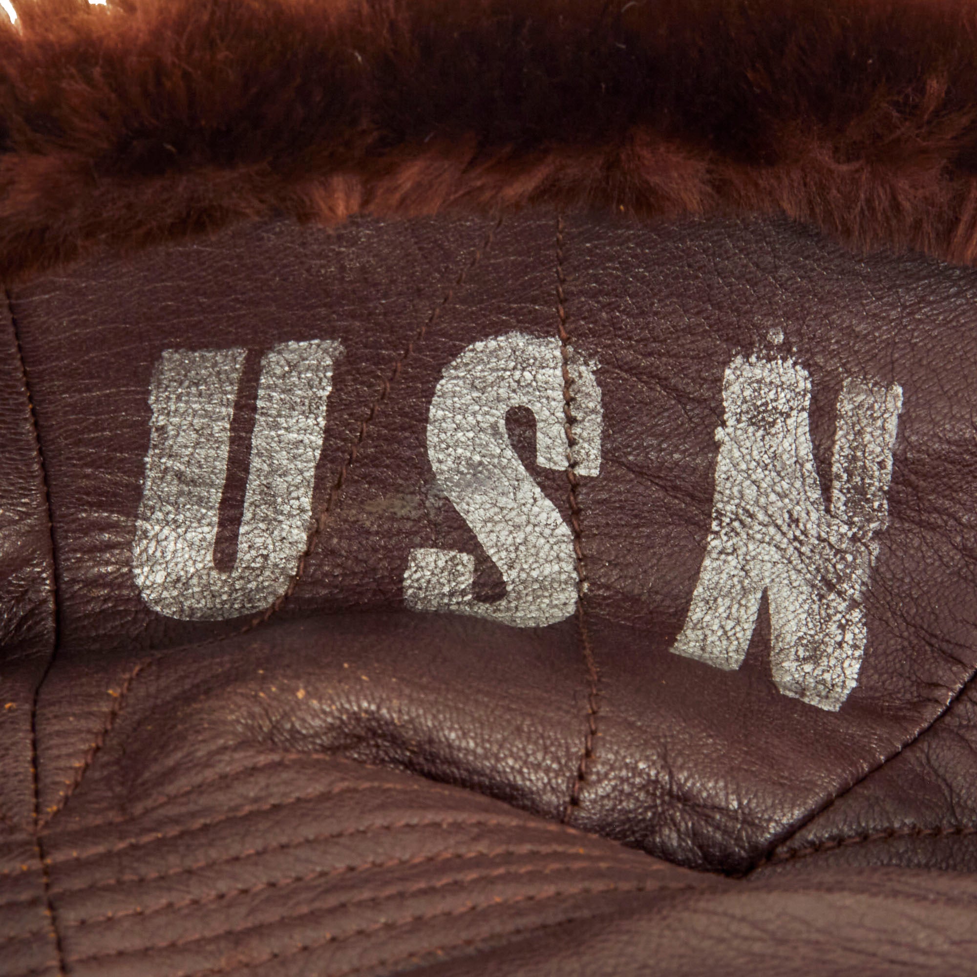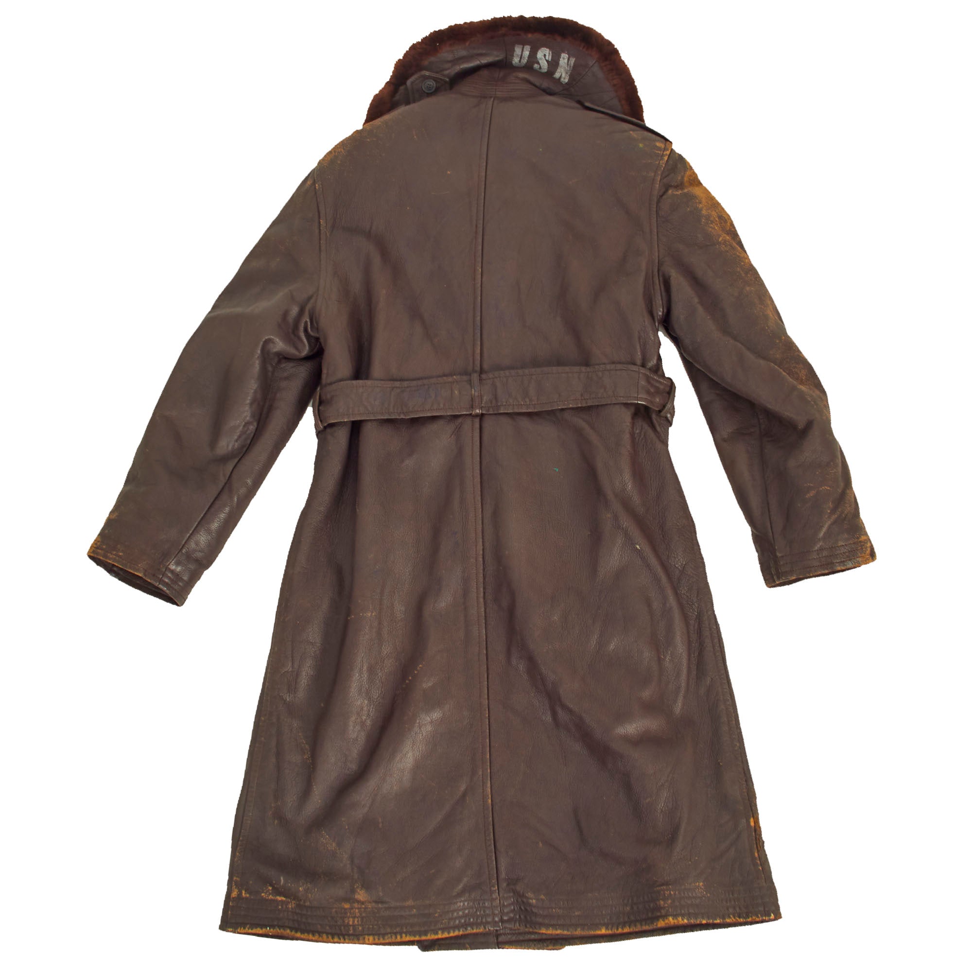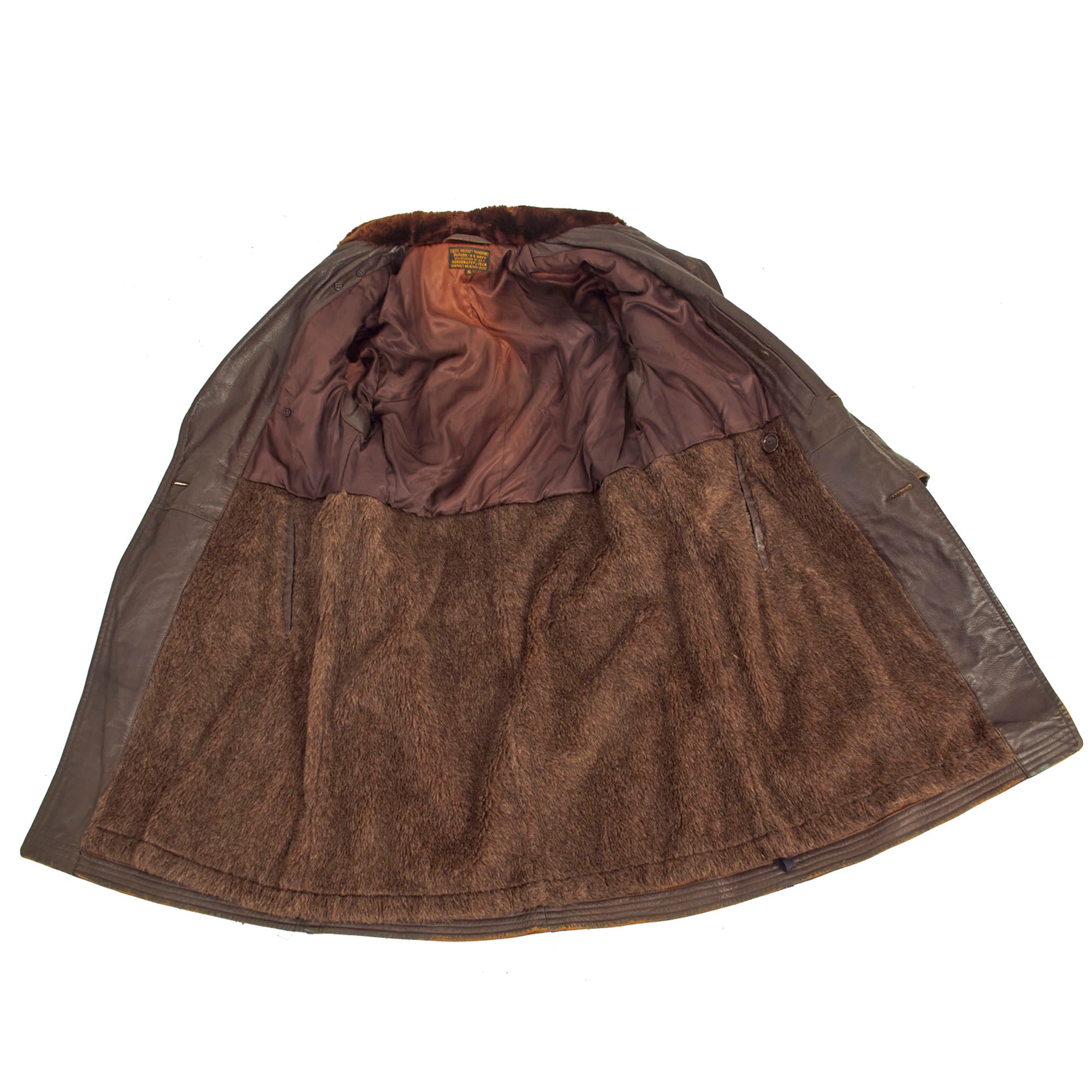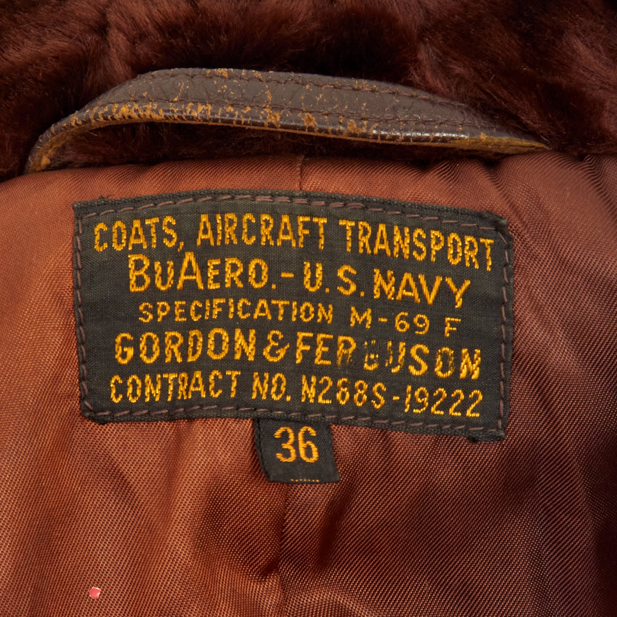 Original Item: Only One Available. This is a near mint condition WWII US Navy M-69F leather Transport Pilot Aircraft coat in amazing condition. It is a size US 40 heavy insulated leather knee length coat. The original data tag is still present on this example.