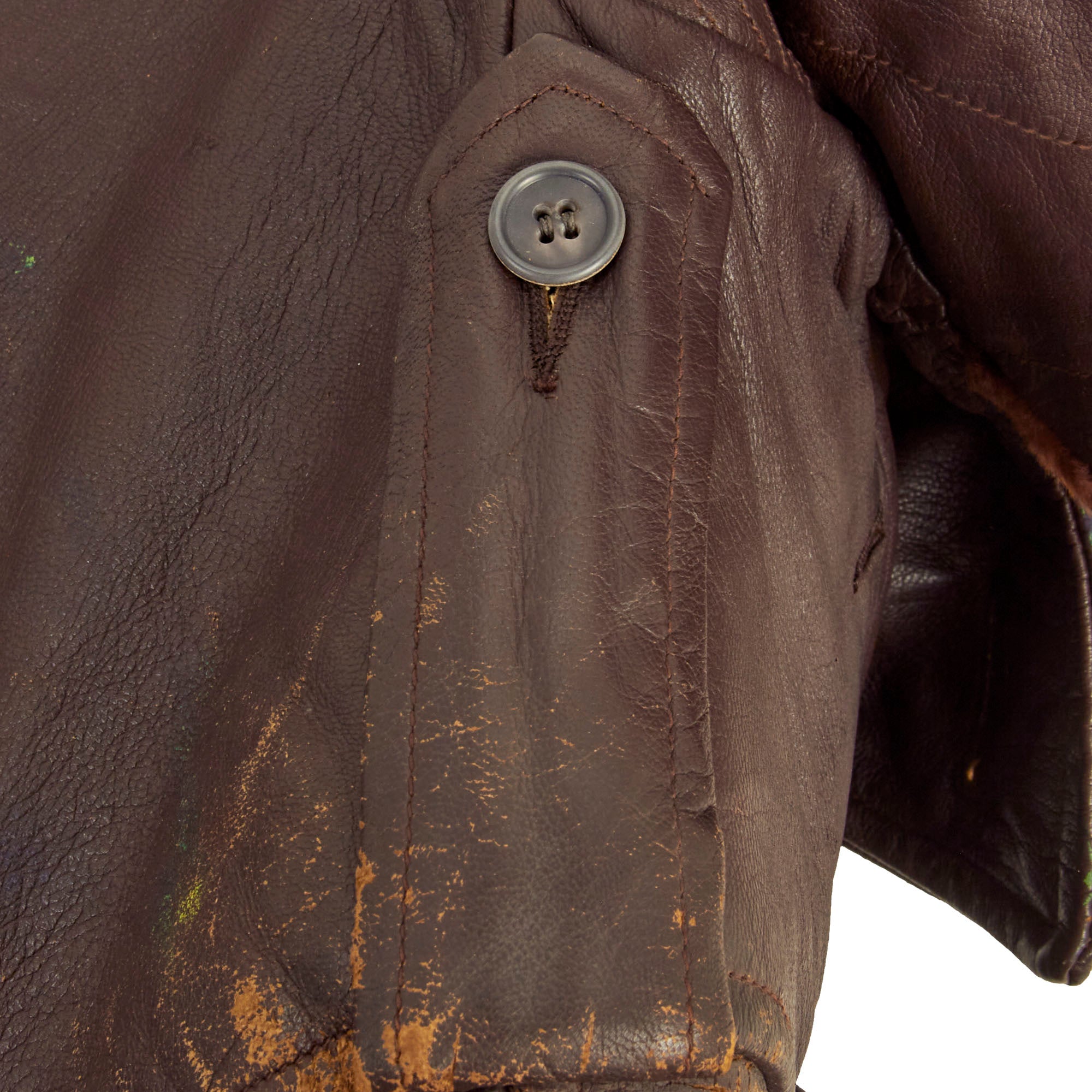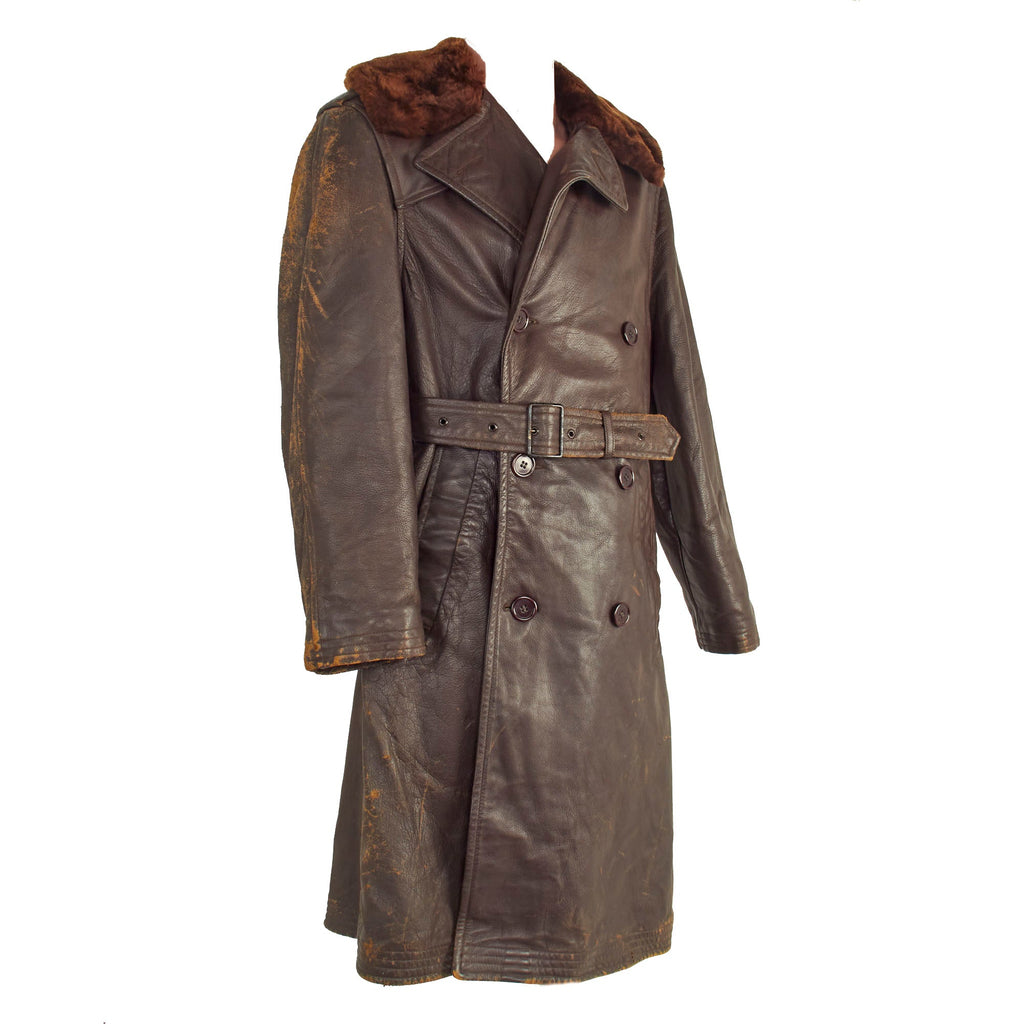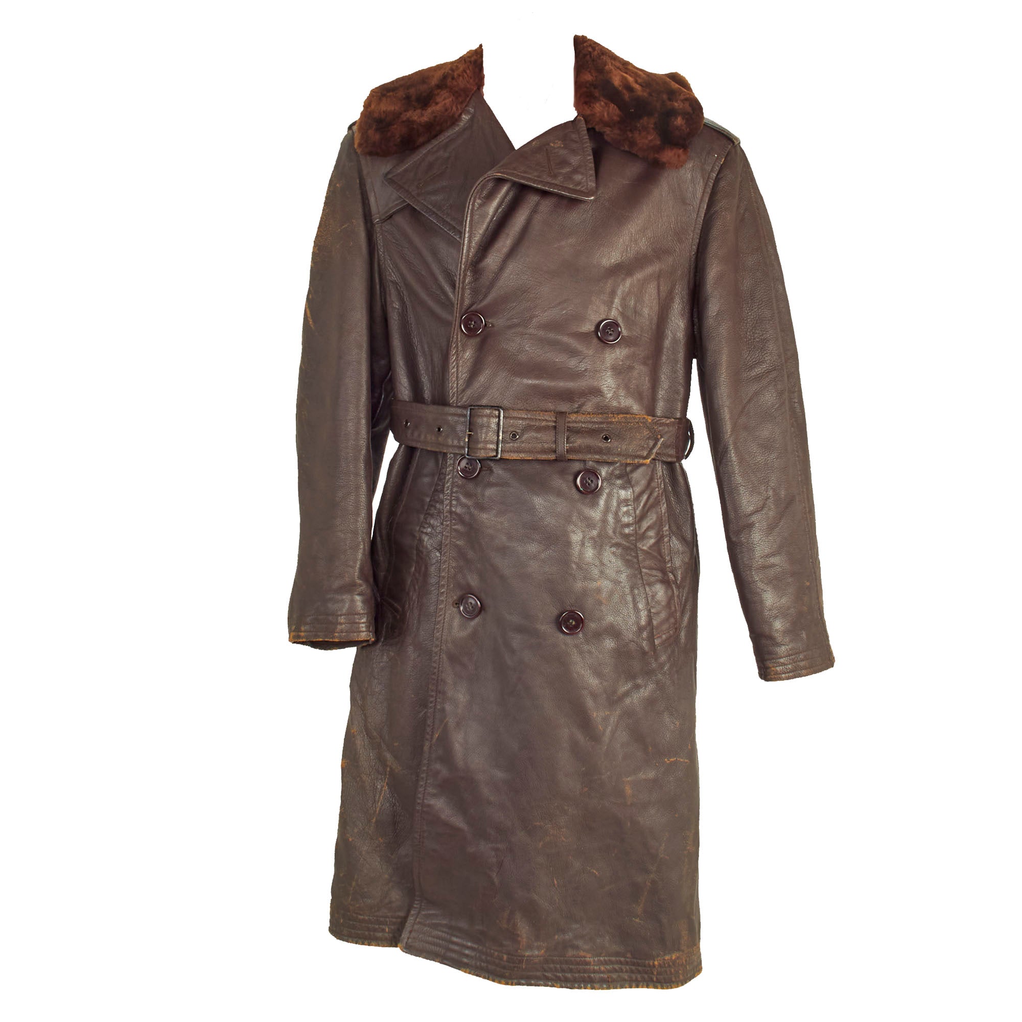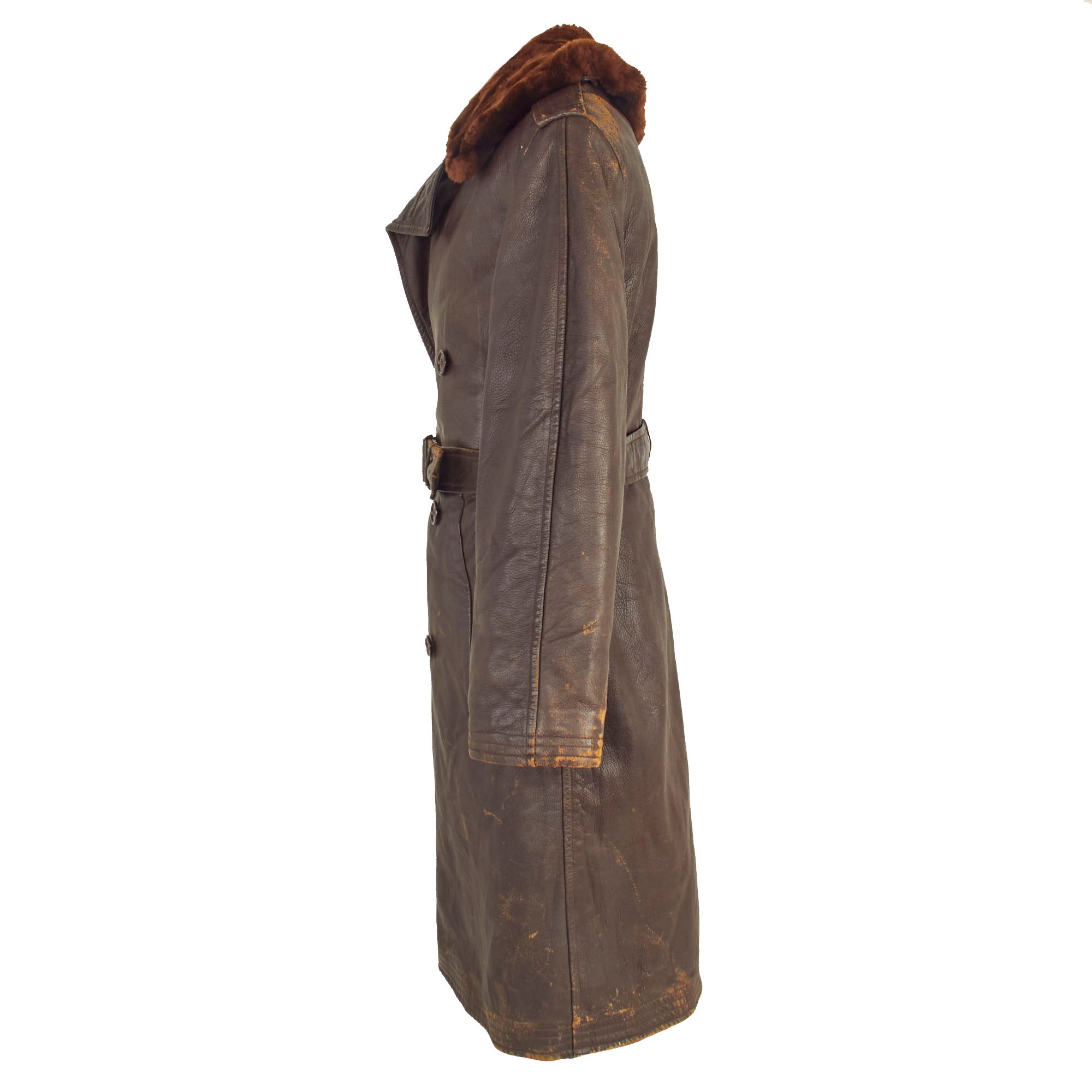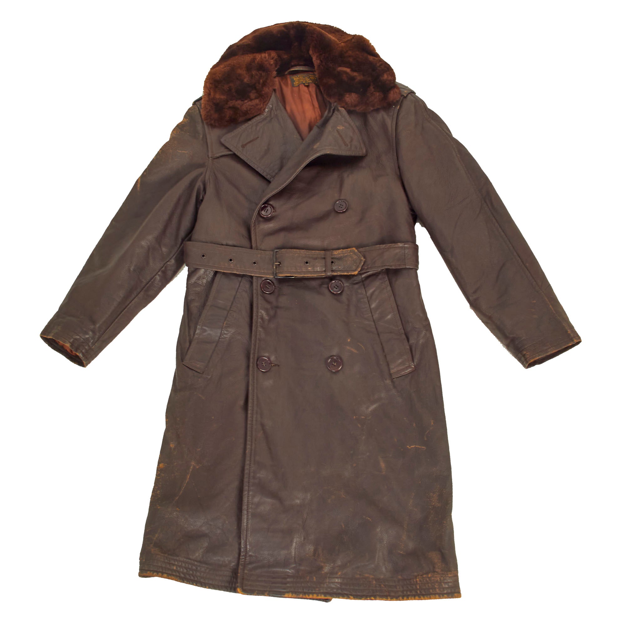 Original Item: Only One Available. This is a near mint condition WWII US Navy M-69F leather Transport Pilot Aircraft coat in amazing condition. It is a size US 40 heavy insulated leather knee length coat. The original data tag is still present on this example.