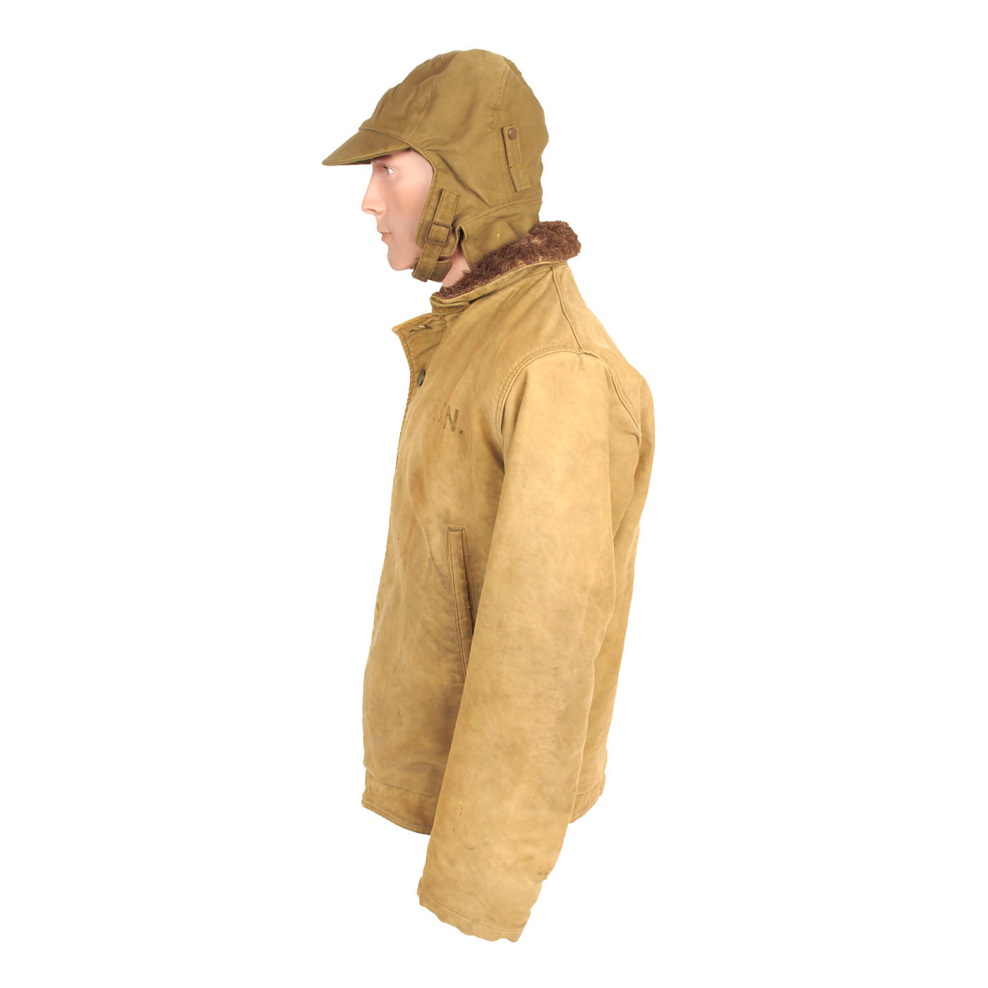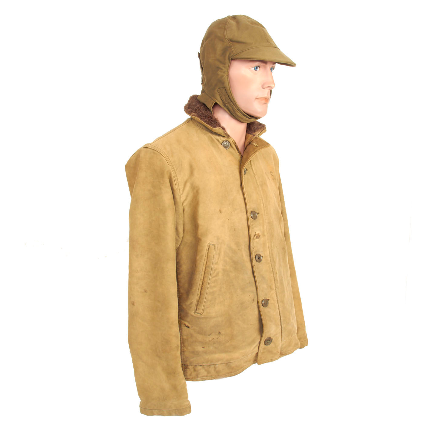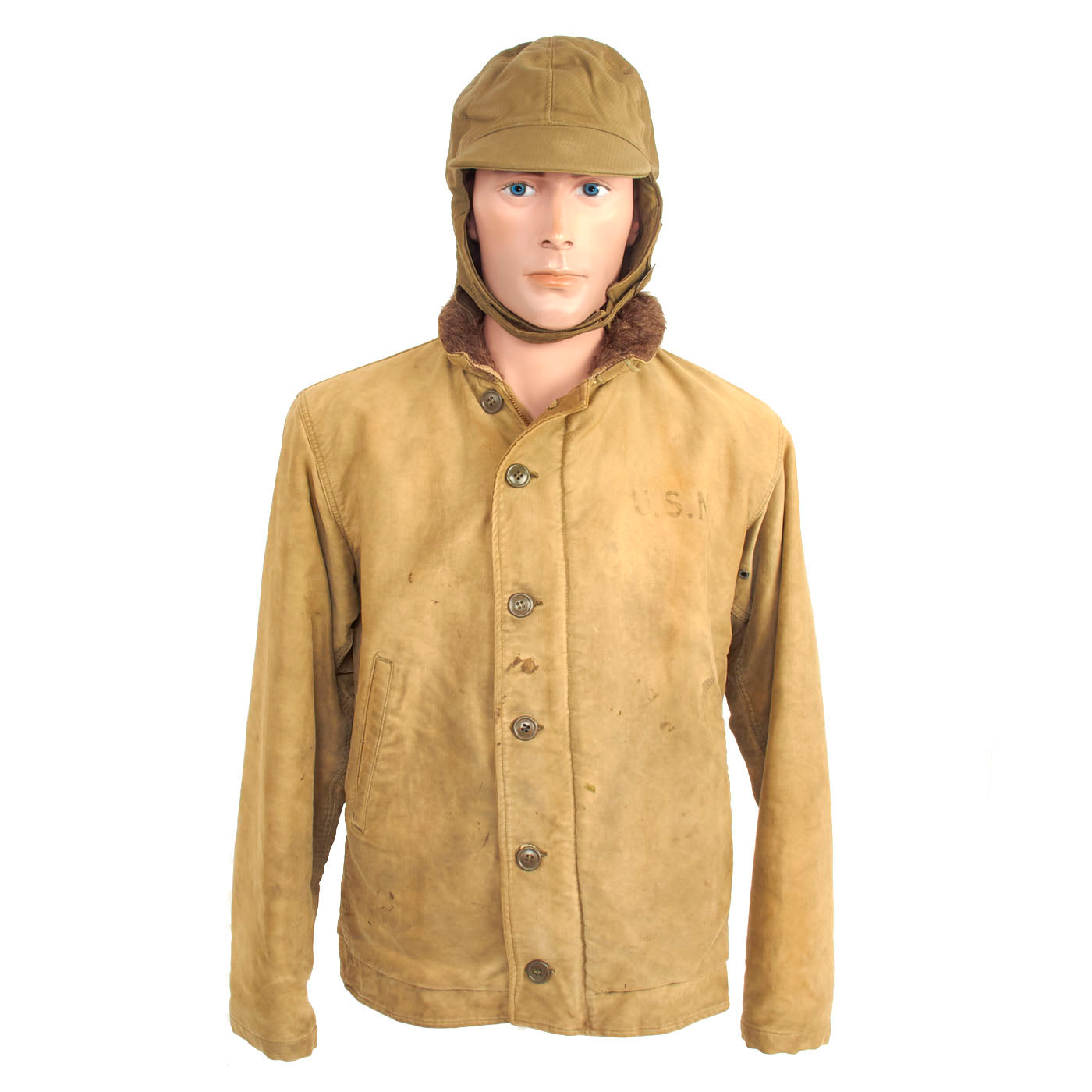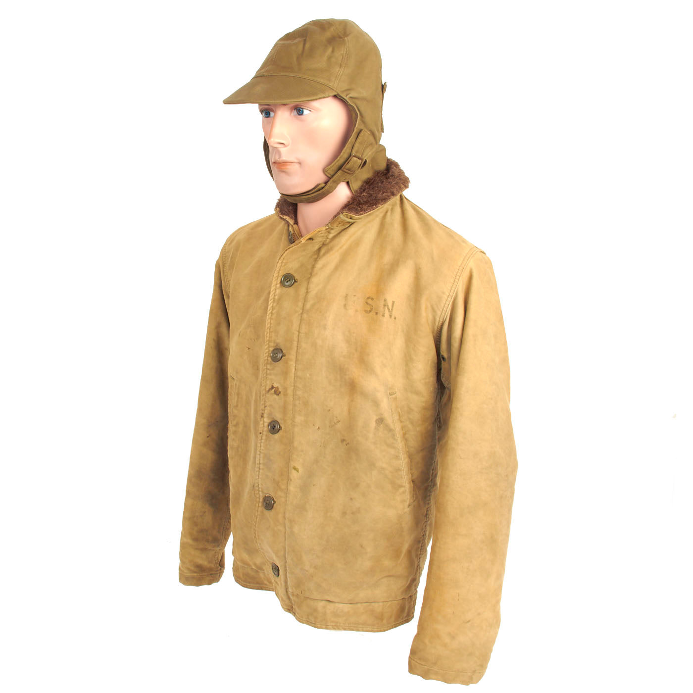 Original Item: Only Ones Available.Original set of WWII United States Navy Stenciled USN Deck Clothing which includes a N1 Deck Jacket in size 38, Matching Deck Bibs, and Deck Cap.