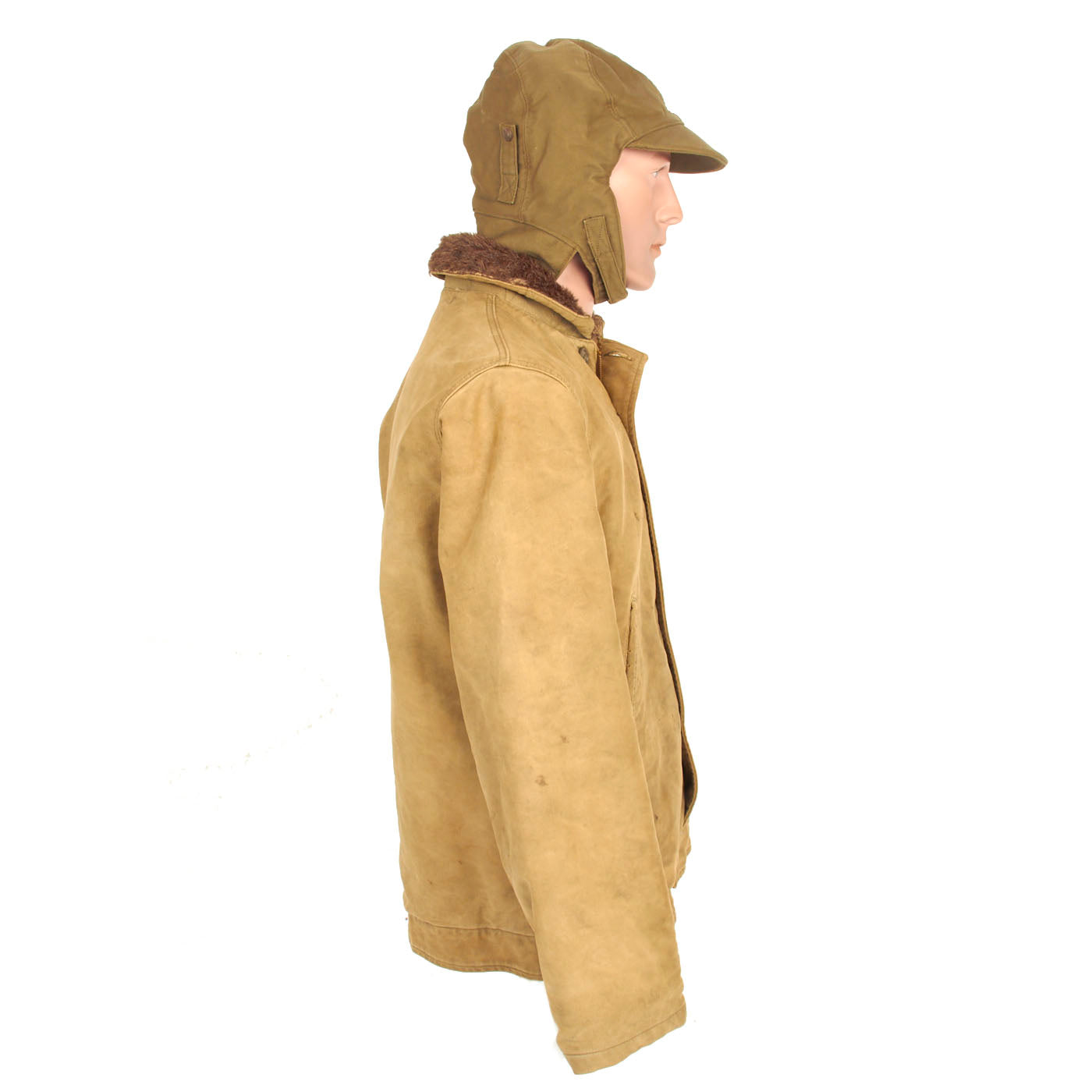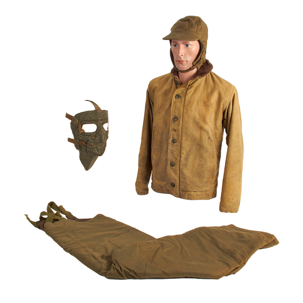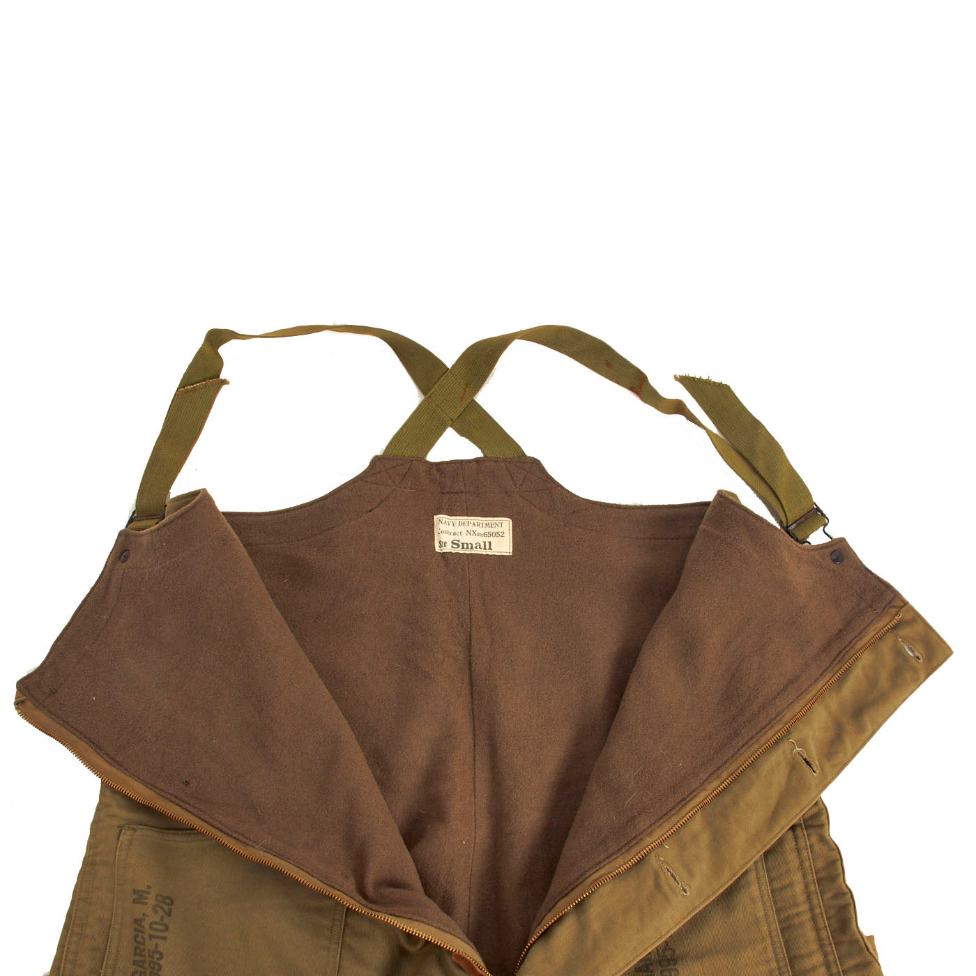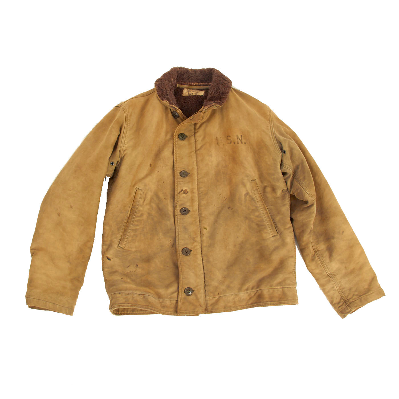 Original Item: Only Ones Available.Original set of WWII United States Navy Stenciled USN Deck Clothing which includes a N1 Deck Jacket in size 38, Matching Deck Bibs, and Deck Cap.