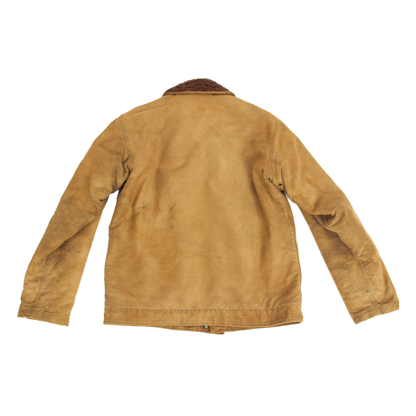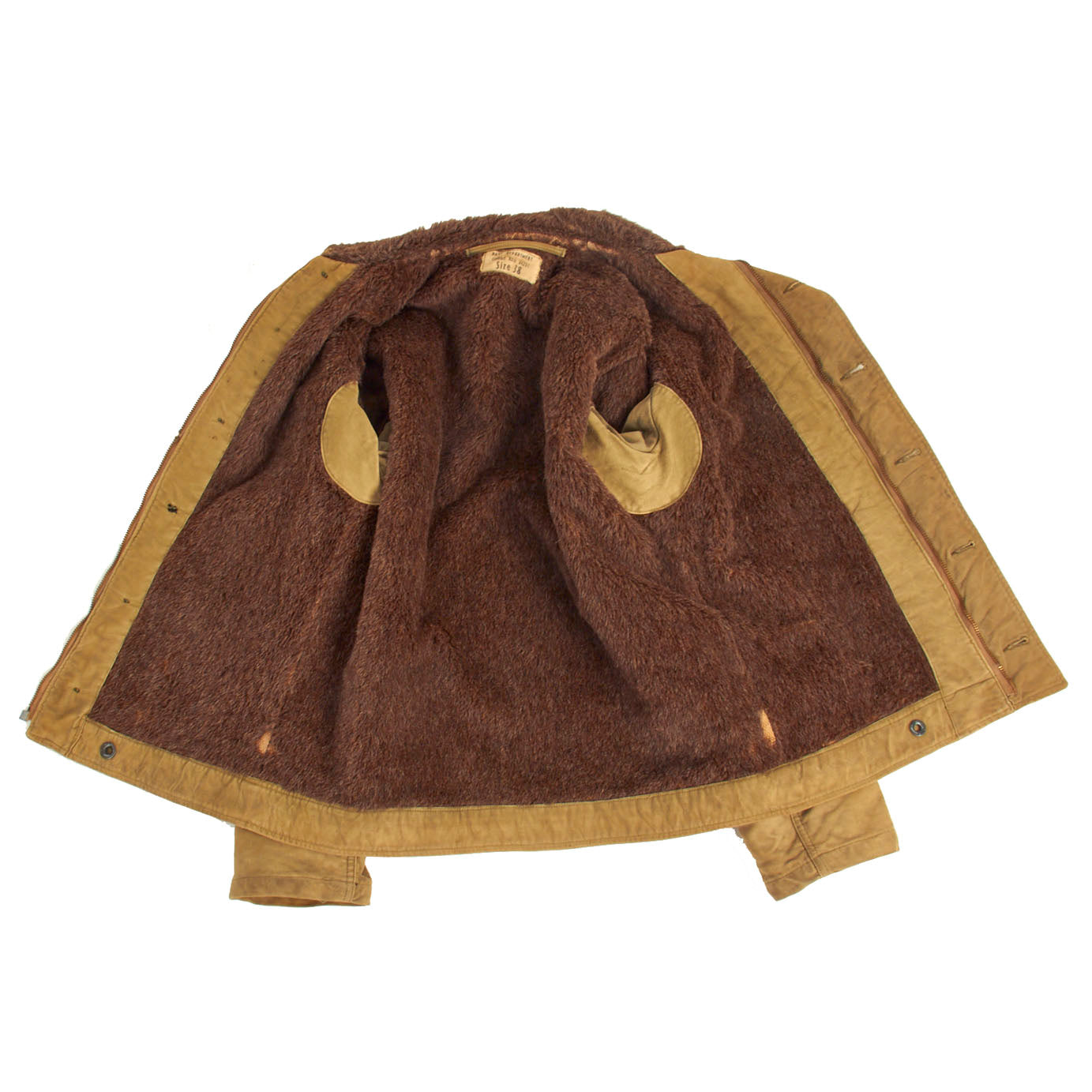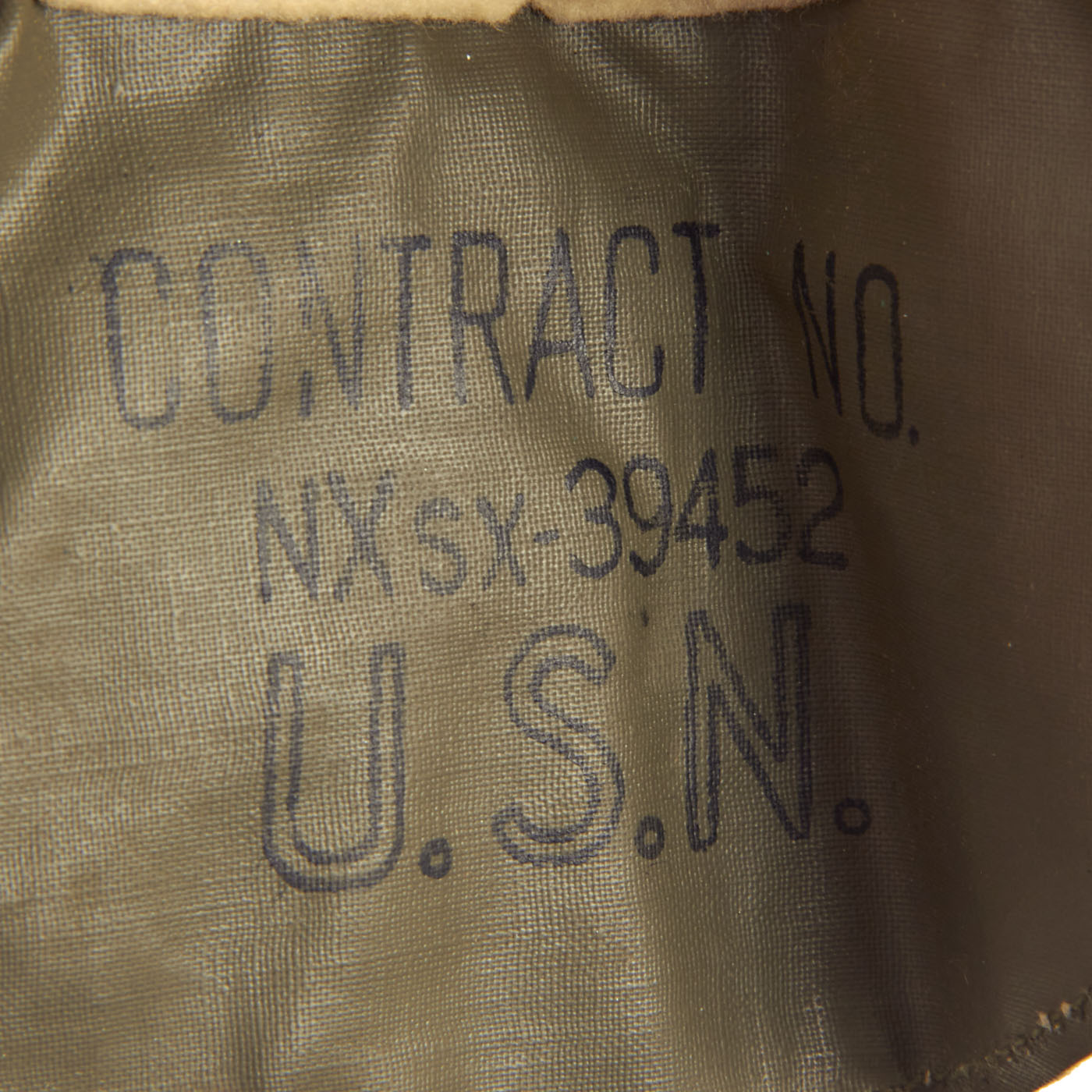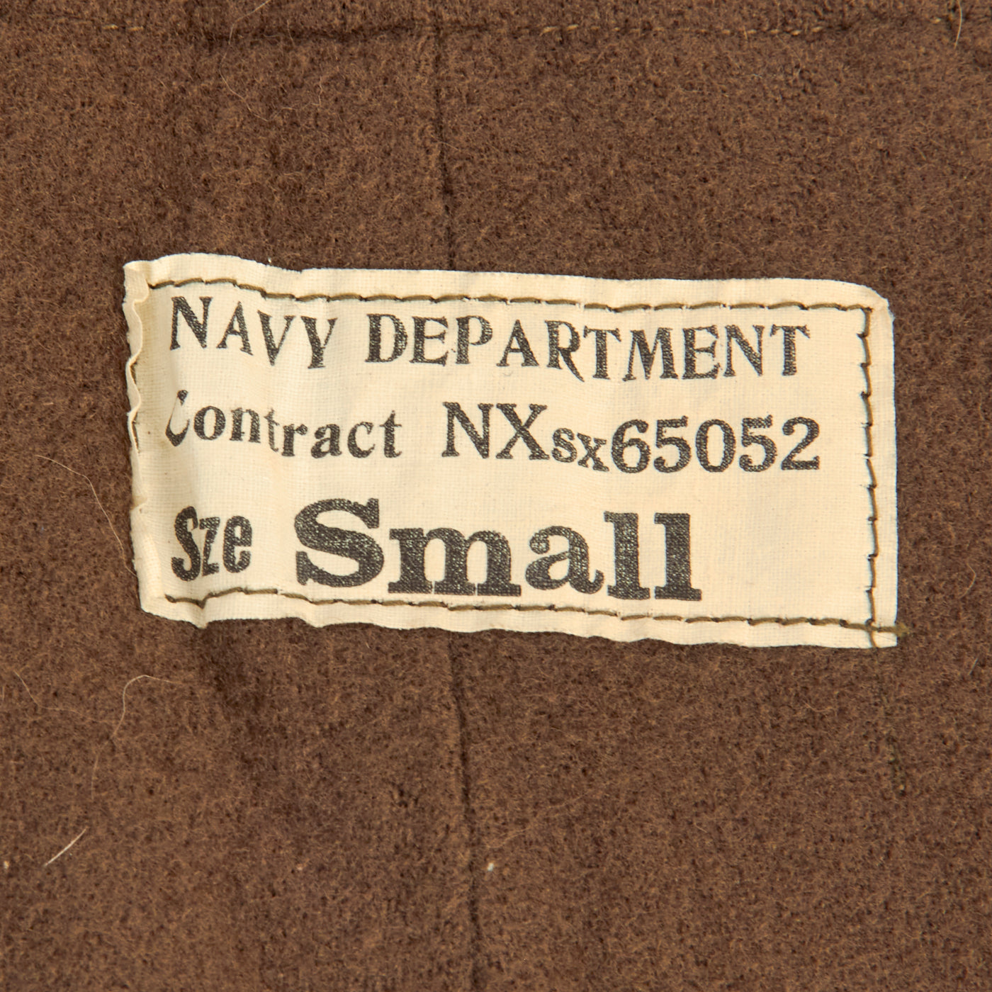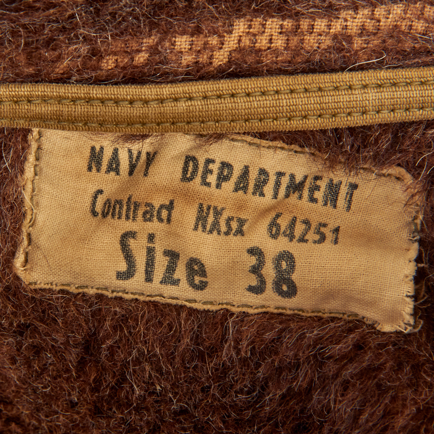 The Jacket is in fair condition, showing signs of lots of period wear from heavy use. There is some loss to the artificial alpaca fur, and the zipper slider missing. The U.S.N. Stamp is still visible on the left chest. Elastic cuffs are still present, but do show wear. All buttons, however, are still intact on the jacket. The original Navy Contract size label is still intact as well. These are highly sought after on today’s market, with most going overseas to foreign vintage clothing dealers when they become available in the United States.
