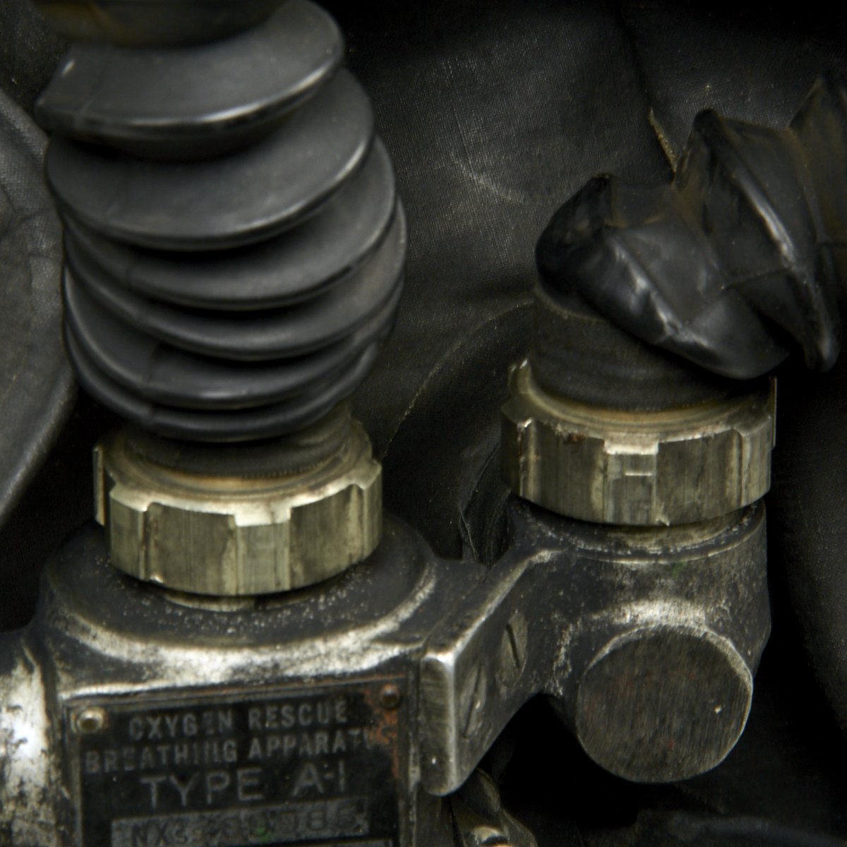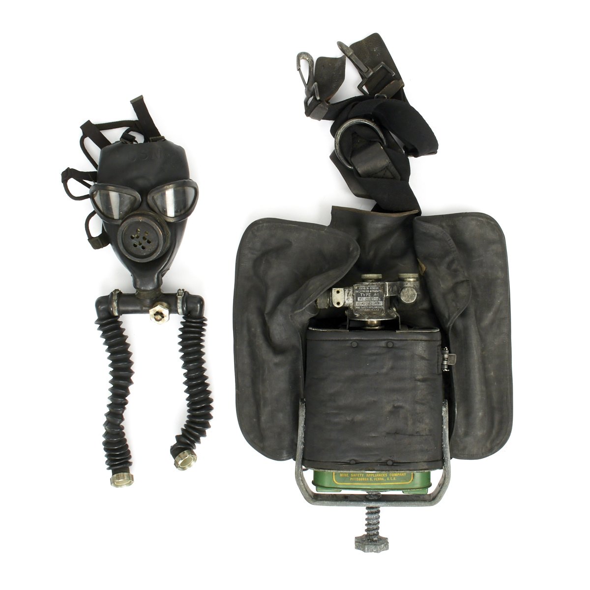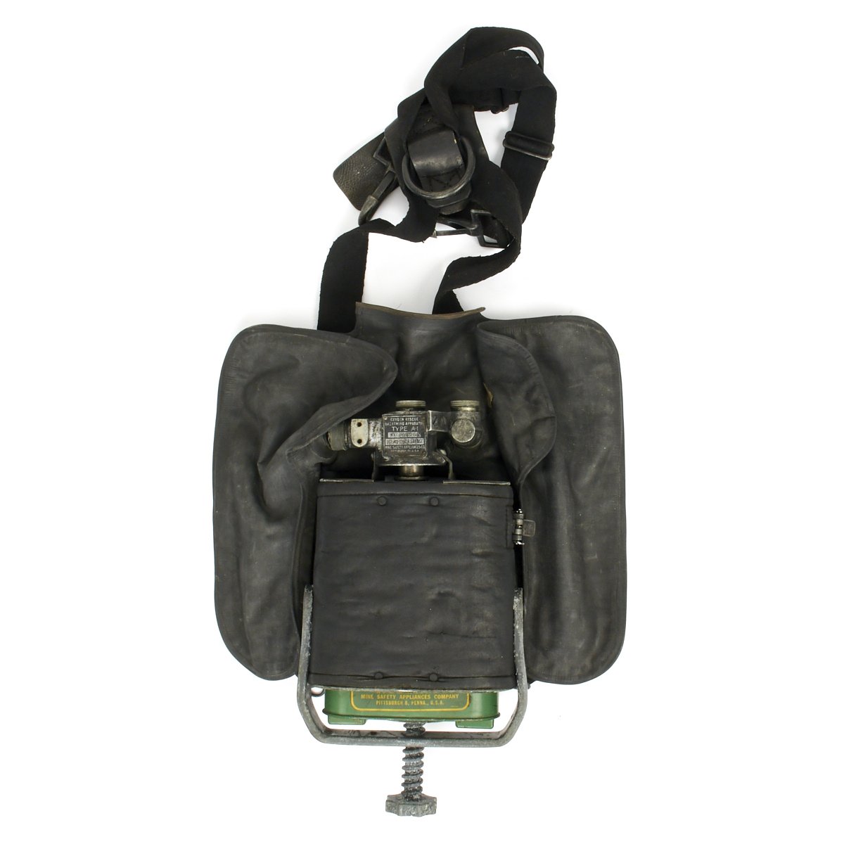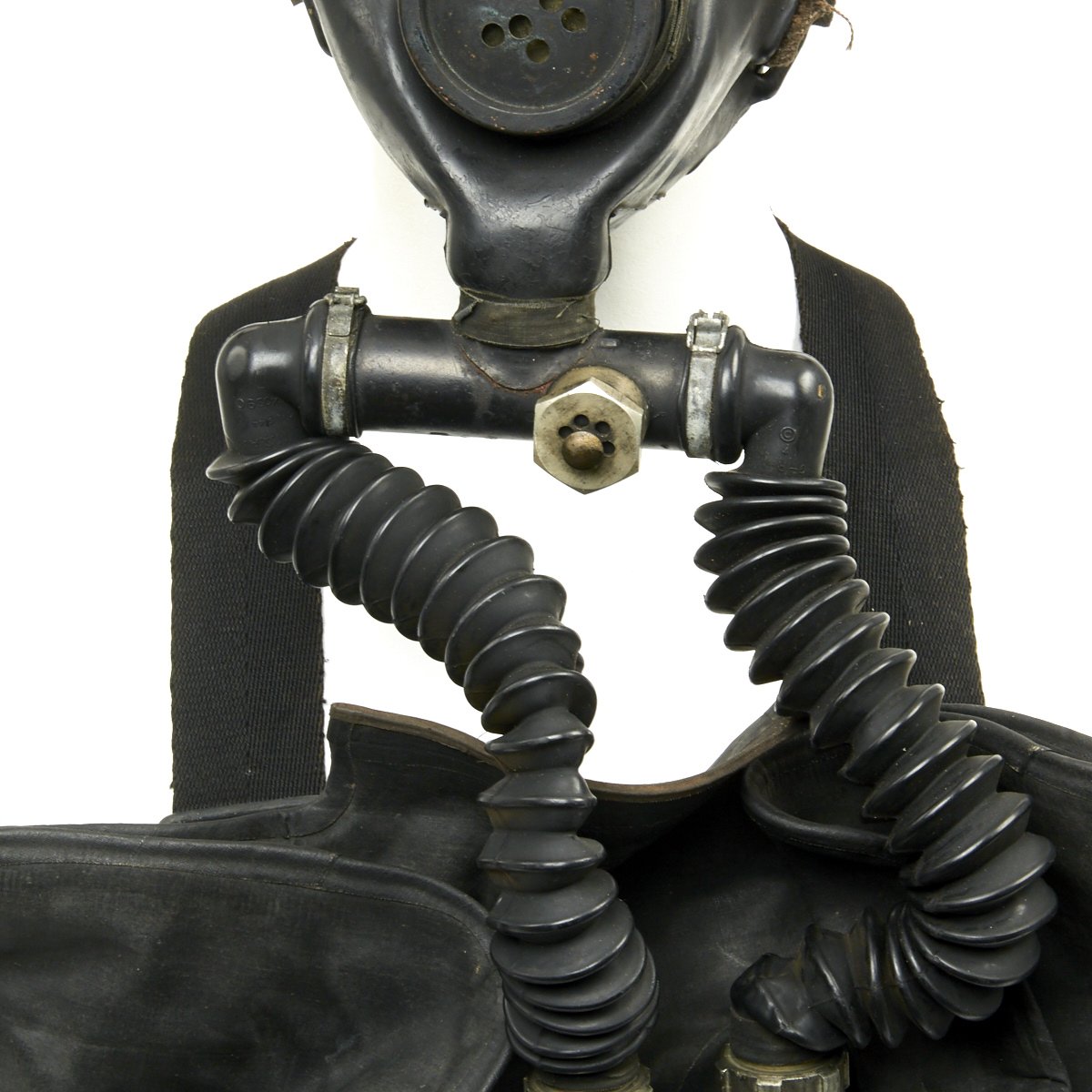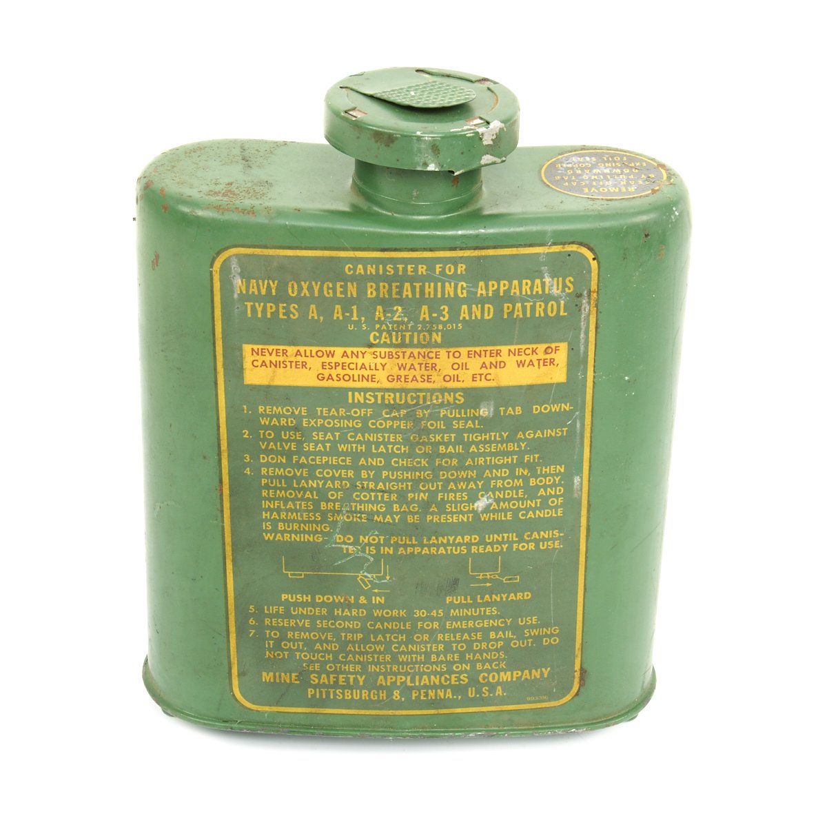 Original Item. Only One Available. As used in WW2 by the U.S Navy this is a Navy Oxygen Breathing Rescue Apparatus, Type A-1. The Type A-1 apparatus was a self-contained, closed-circuit device. Oxygen, generated by chemicals in a canister, flowed to the right-hand section of the breathing bag, where it mixed with air previously passed through the canister, then to the left-hand breathing bag and on through the inhalation tube into the lungs. This process allowed the wearer to be independent of the surrounding atmosphere for the effective time limit of the oxygen supply, approximately 45 minutes.