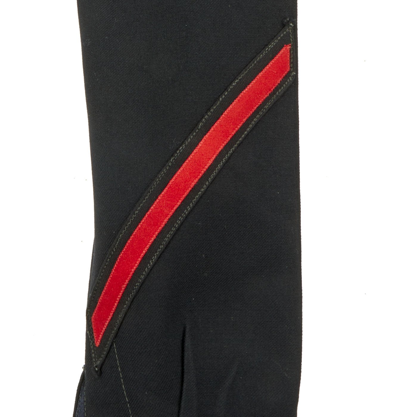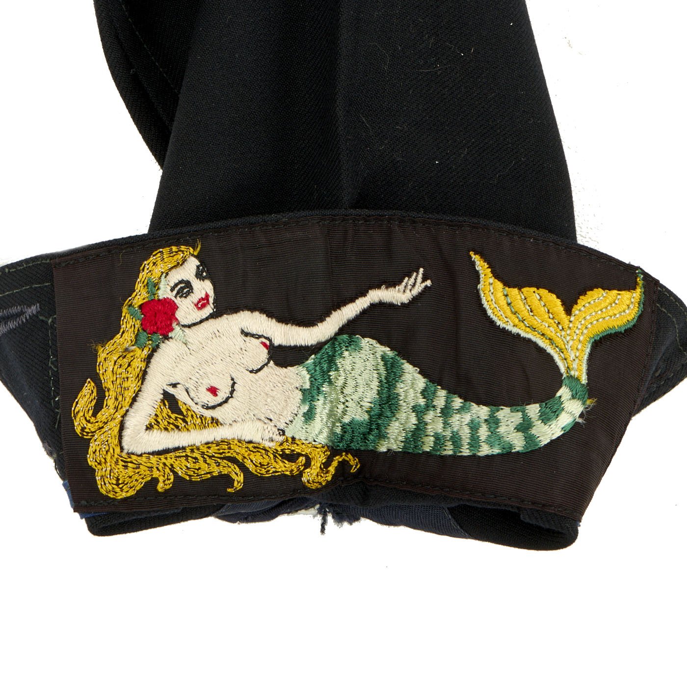 A pharmacist's mate second class wearing the dress blue uniform. This jumper was tailor made in Navy blue gabardine wool. It also has "liberty cuffs" with mermaid designs sewn to the underside of the cuffs. Liberty cuffs could be hidden from disapproving eyes by rolling the cuffs down and buttoning them when discretion dictated. This corpsman was attached to the Second Marine Division. A single red service stripe indicates four years service. The French Croix de Guerre Fourragere was awarded to the USMC 5th and 6th regiments at the end of World War I. All members of these regiments were authorized to wear the fourragere thereafter but were required to remove it upon leaving the regiment. It is interesting that an amendment to the 1941 Uniform Regulations (BP CL 199-44)(7-12-44) addressed the wearing of fourrageres on Navy uniforms. Fourrageres were authorized for wear and the following was added with regard to attaching it; "In order to attach the fourragere to the naval uniform, a button may be sewed to the left shoulder of the coat or jumper under the collar." The original owner of this uniform joined the Naval Reserve in 1939. He was attached to the 6th Marines in California in 1941 and was assigned to Iceland in July of 1941. In January of 1943, he was sent to Guadalcanal and in November took part in the landing at Tarawa. In June of 1944, he took part in the landings on Saipan. (J. Warner)