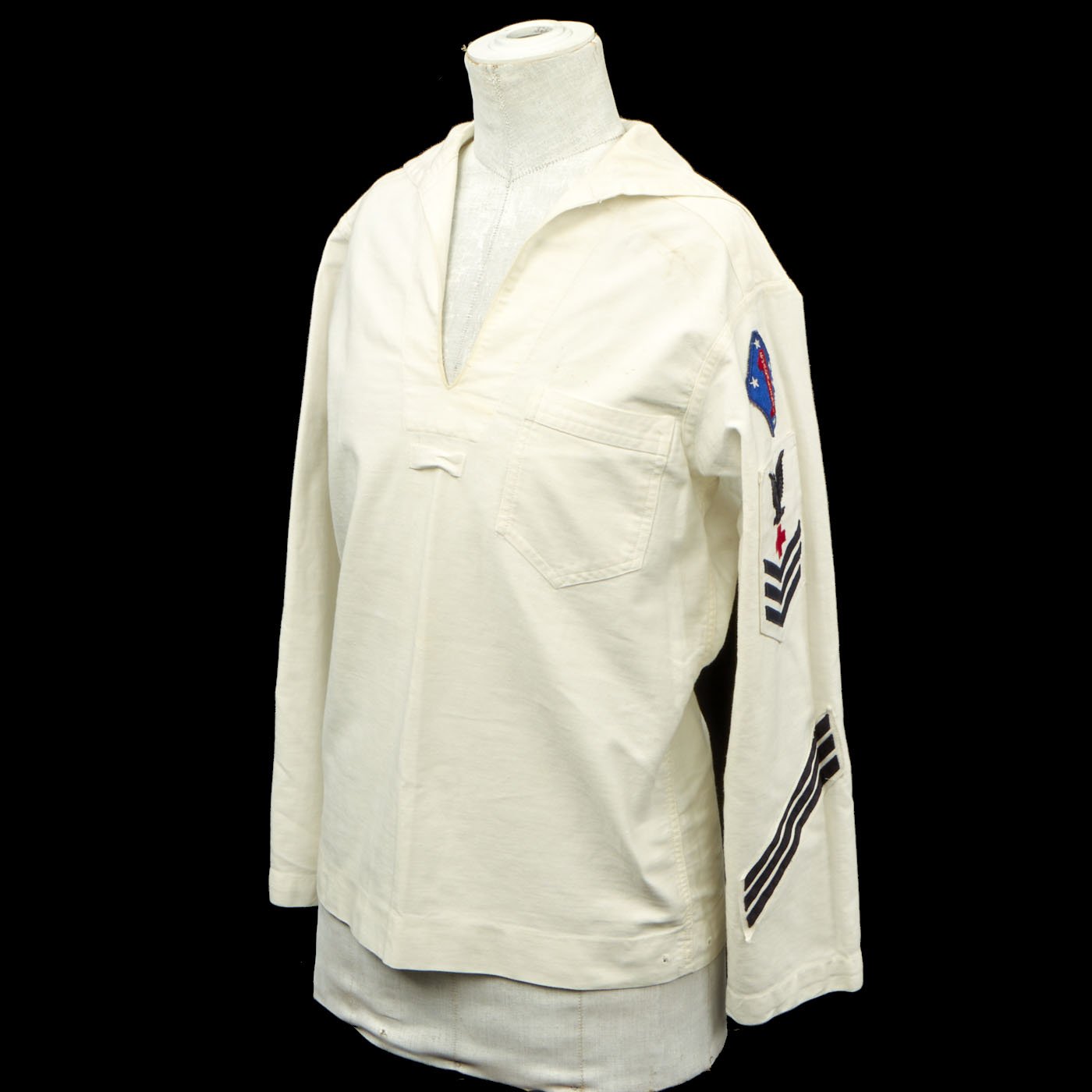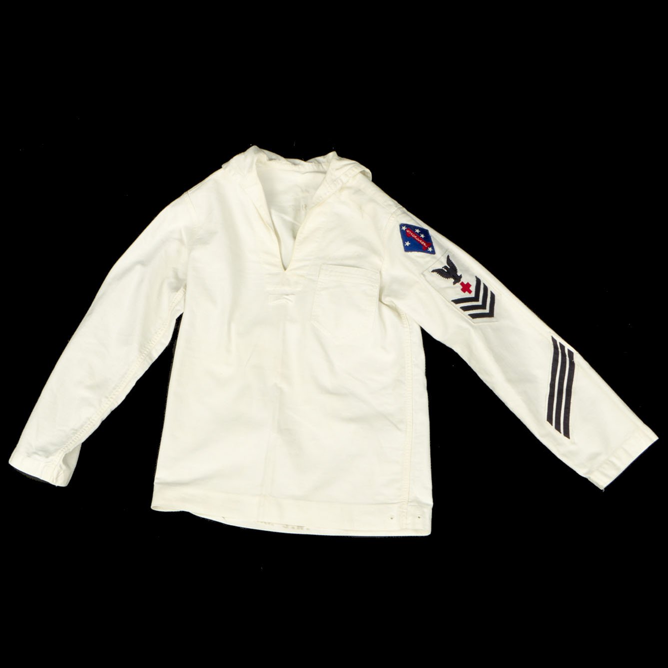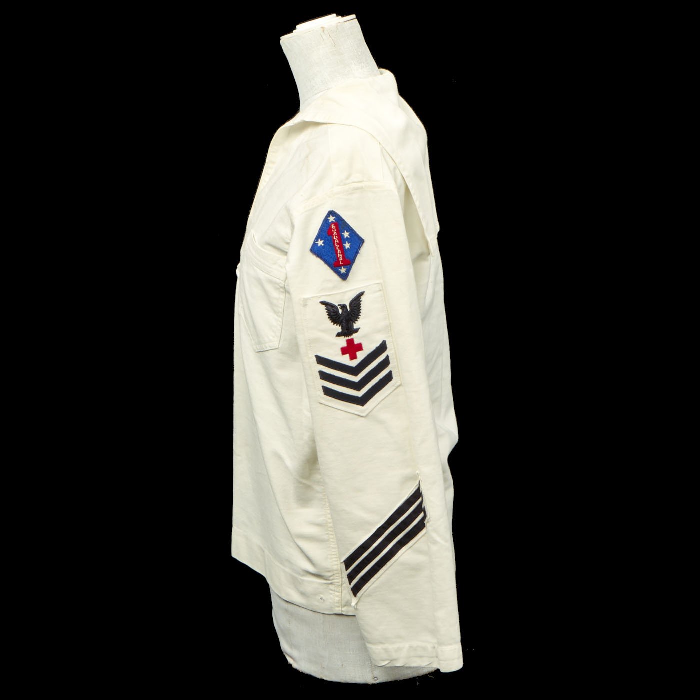 Original Item: Only One Available. This very USN WWII uniform jumper is featured on page 131 in the book Sailors in Forest Green; USN Personnel Attached to the USMC, Volume 1 by Jeff Warner. This is an excellent condition pharmacist's mate first class wearing the Navy Undress White uniform. This uniform appears as it was worn in 1945. The original owner of this uniform joined the Naval Reserve in 1932. Three service stripes indicate twelve years service. He was attached to the First Marine Division and authorized to wear the divisional patch.