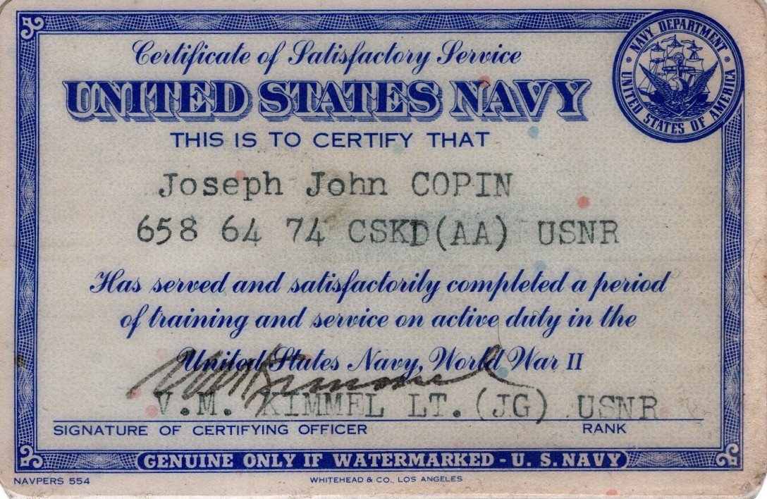 - USN World War Two Service ID Card named to Joseph John Copin NSN 6586474 CSKD.