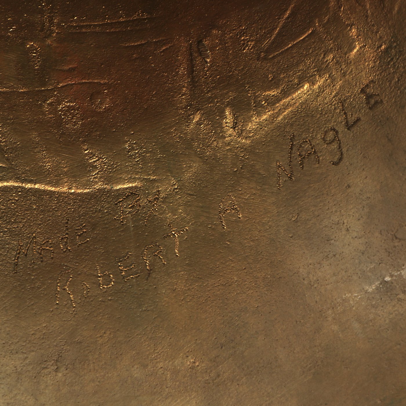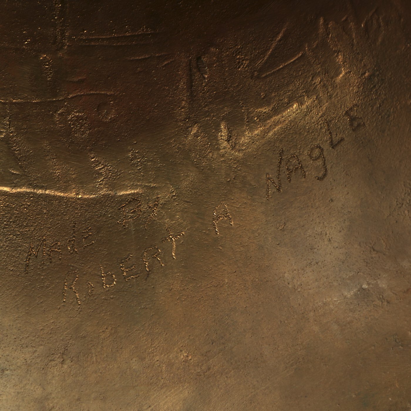 This is a classic United States Navy quarterdeck bell. The bell is cast iron and retains its original finish. The bell is embossed U.S. on the lower rim. The bell measures a base diameter of 9 1/2 inches and a height of 9 inches. Retains its original bell clapper. It weighs approximately 20 pounds. Inside it is engraved "Made by Robert A. Nagle". We have found no information on that. This impressive Navy bell is well preserved and would make a nice addition to a military maritime collection. Plus when you ring it, its LOUD!