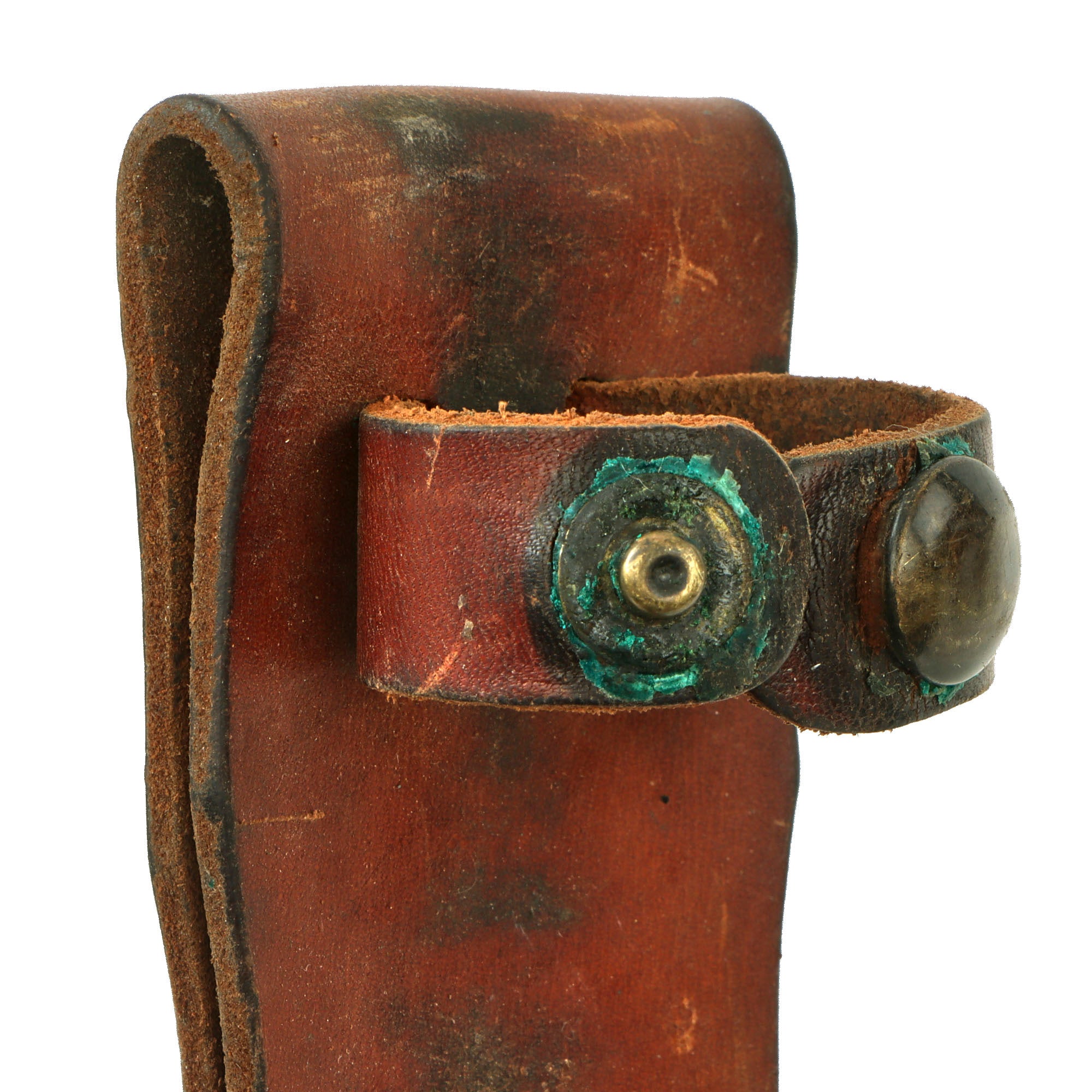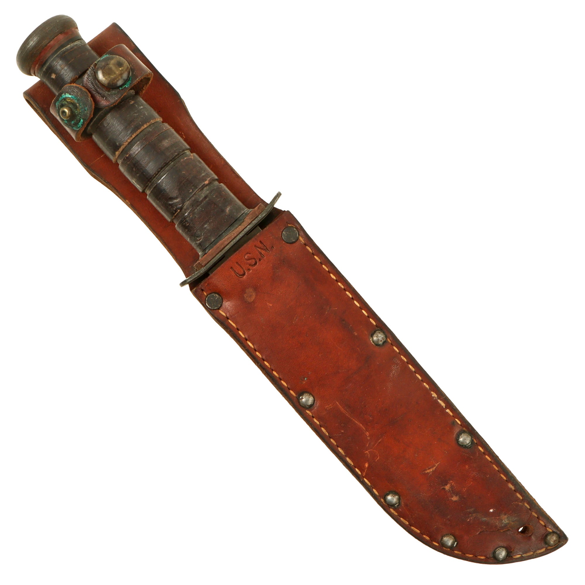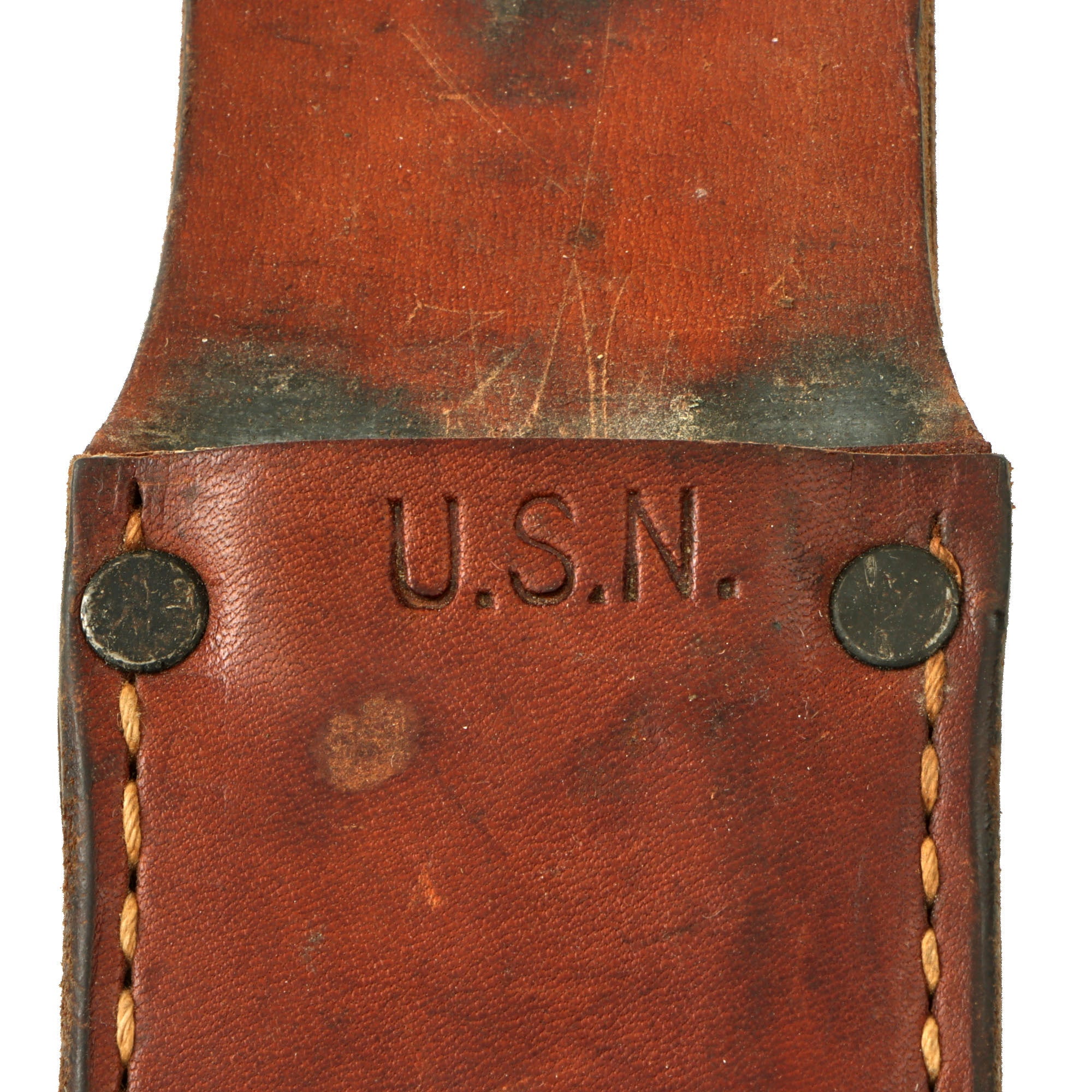 The leather sheath is the standard type used with the Mark 2, and is in good service-used condition. It is marked U.S.N. on the throat. The leather is cracking heavily and there is verdigris on the snap fittings.