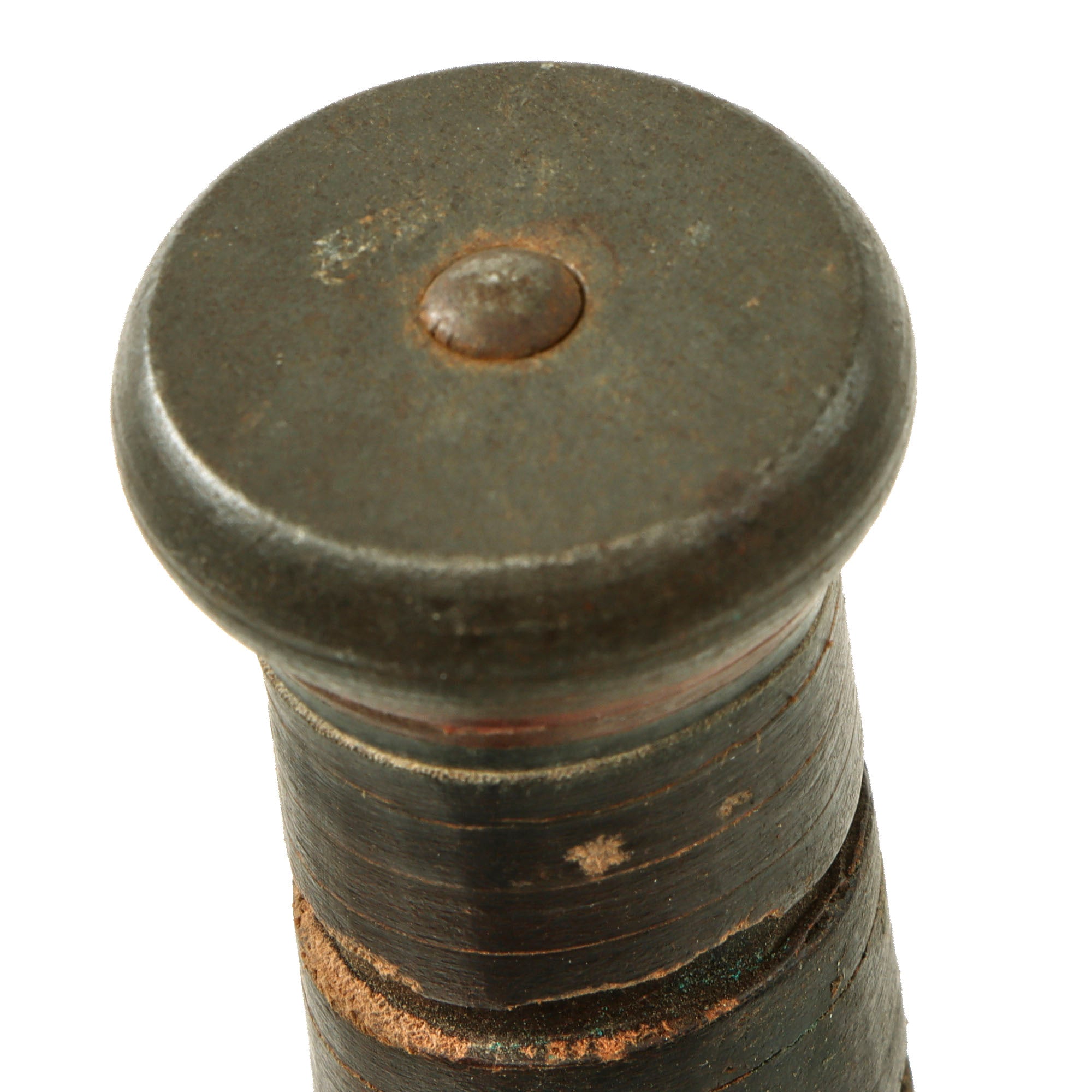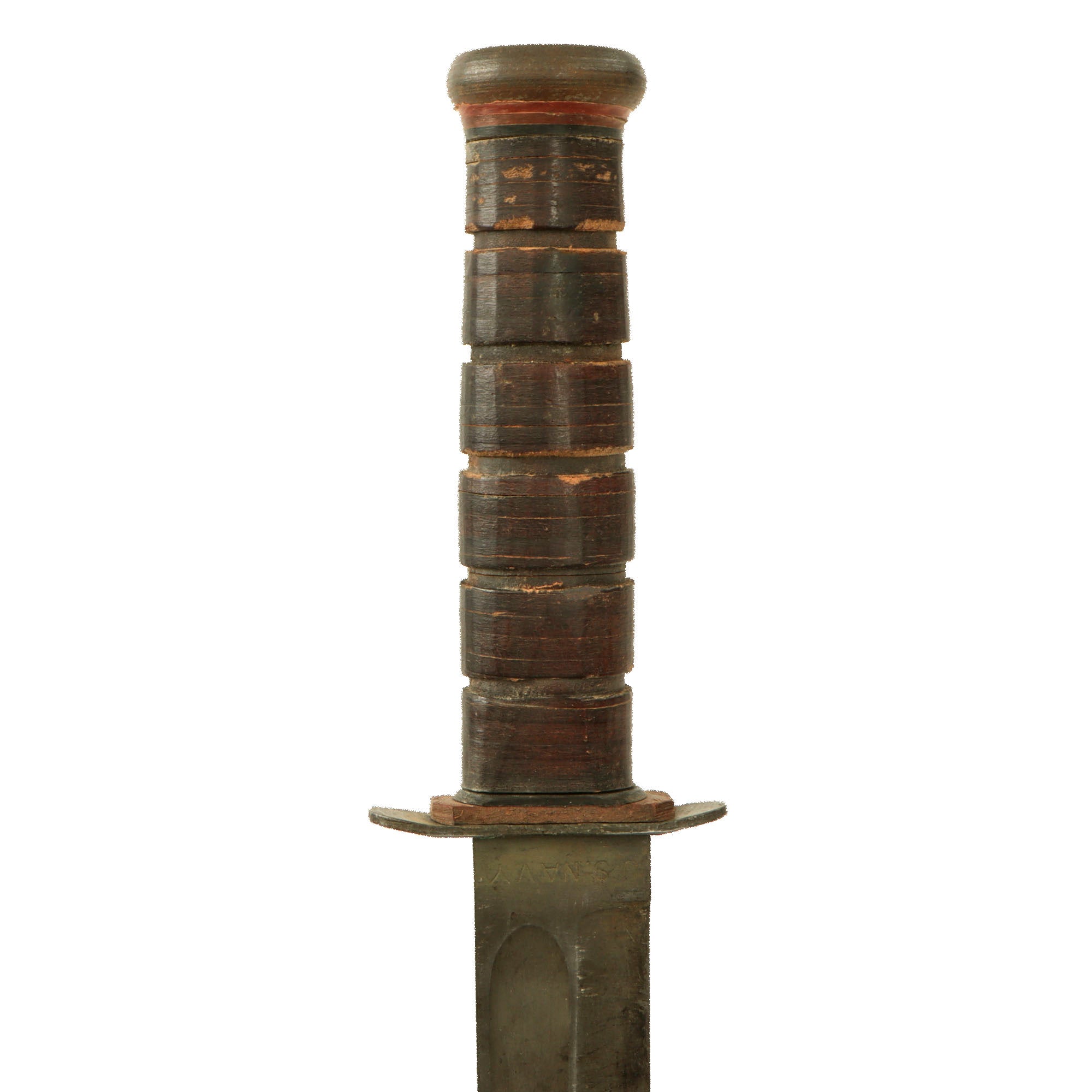 In 1944, the US Navy put through a change order to have the markings moved from the blade to the cross guard, so this knife was produced after that change. It also has the later war slightly swept back cross guard. It features original leather washer grip, which is in good shape with no cracks or splitting, and is the rare “Red Spacer” variation! It definitely does show wear however, with a slightly darkened color. The cross guard and pommel are slightly loose, as the leather has shrunk, and the pommel spins around.